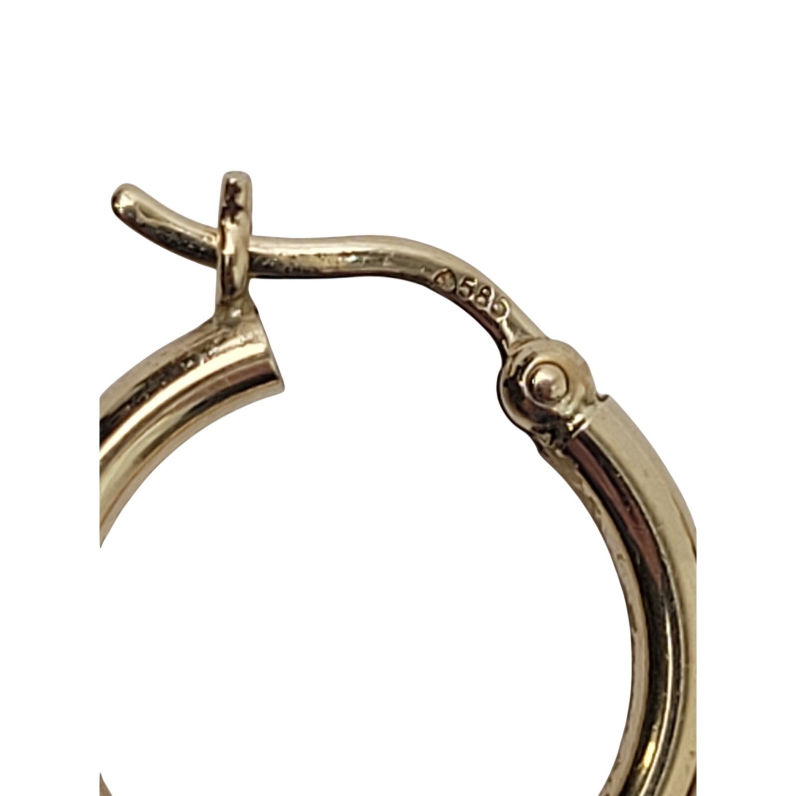 Classy pair of small yellow gold hoops measuring approximately 5/8" in diameter. The stamp reads 585 which equates to 14K gold.