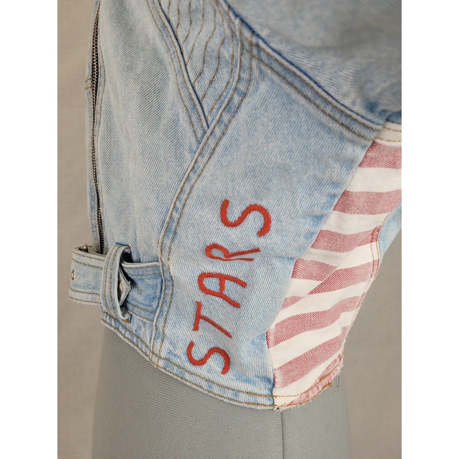This iconic 1980s cropped denim moto jacket is the ultimate statement piece for the fearless dresser. Bold stars and stripes splash across classic denim in true patriotic fashion. The moto-inspired silhouette keeps it tough and cool, while the cropped cut makes it endlessly versatile — thrown over everything from band tees to sundresses.