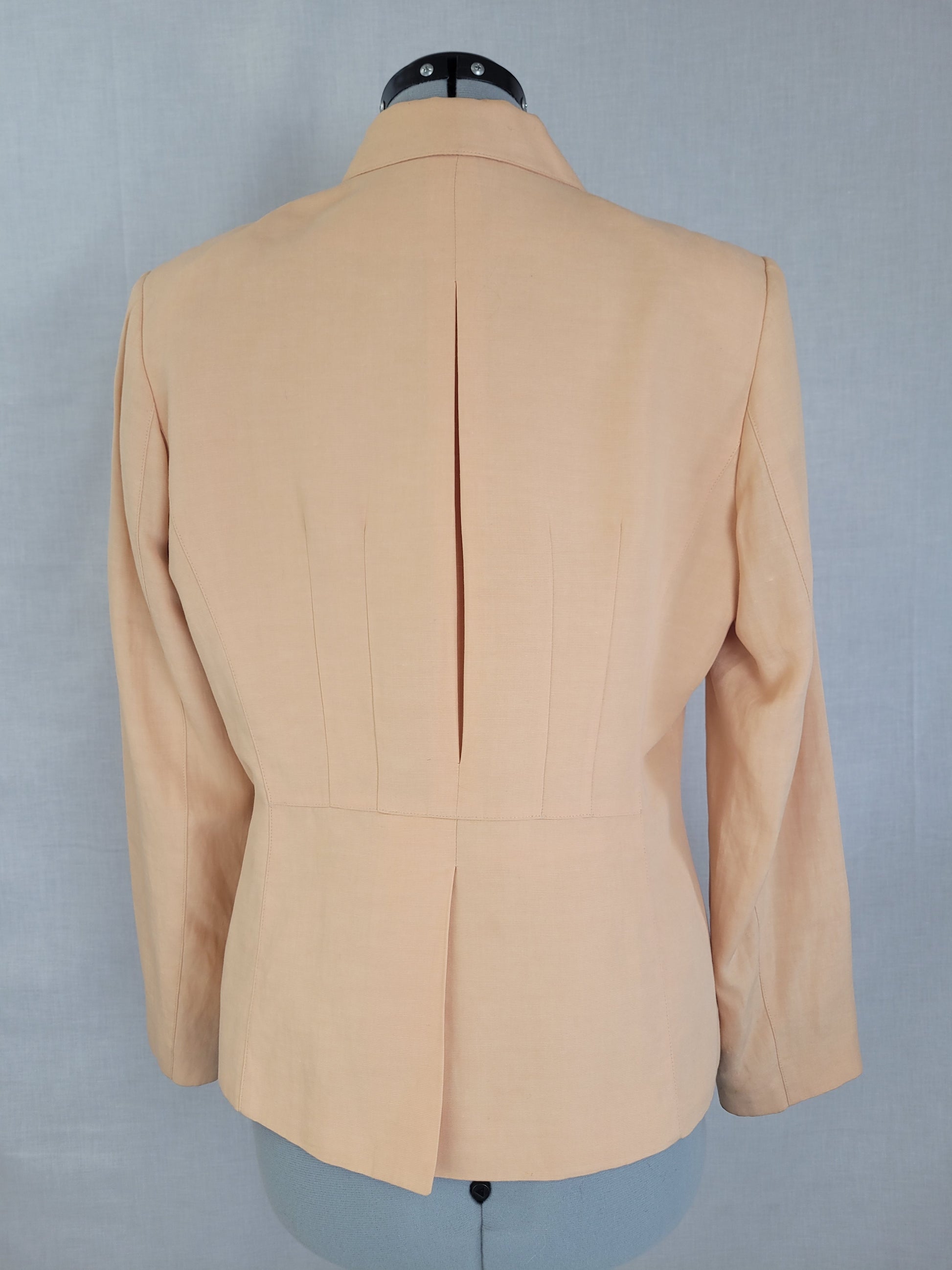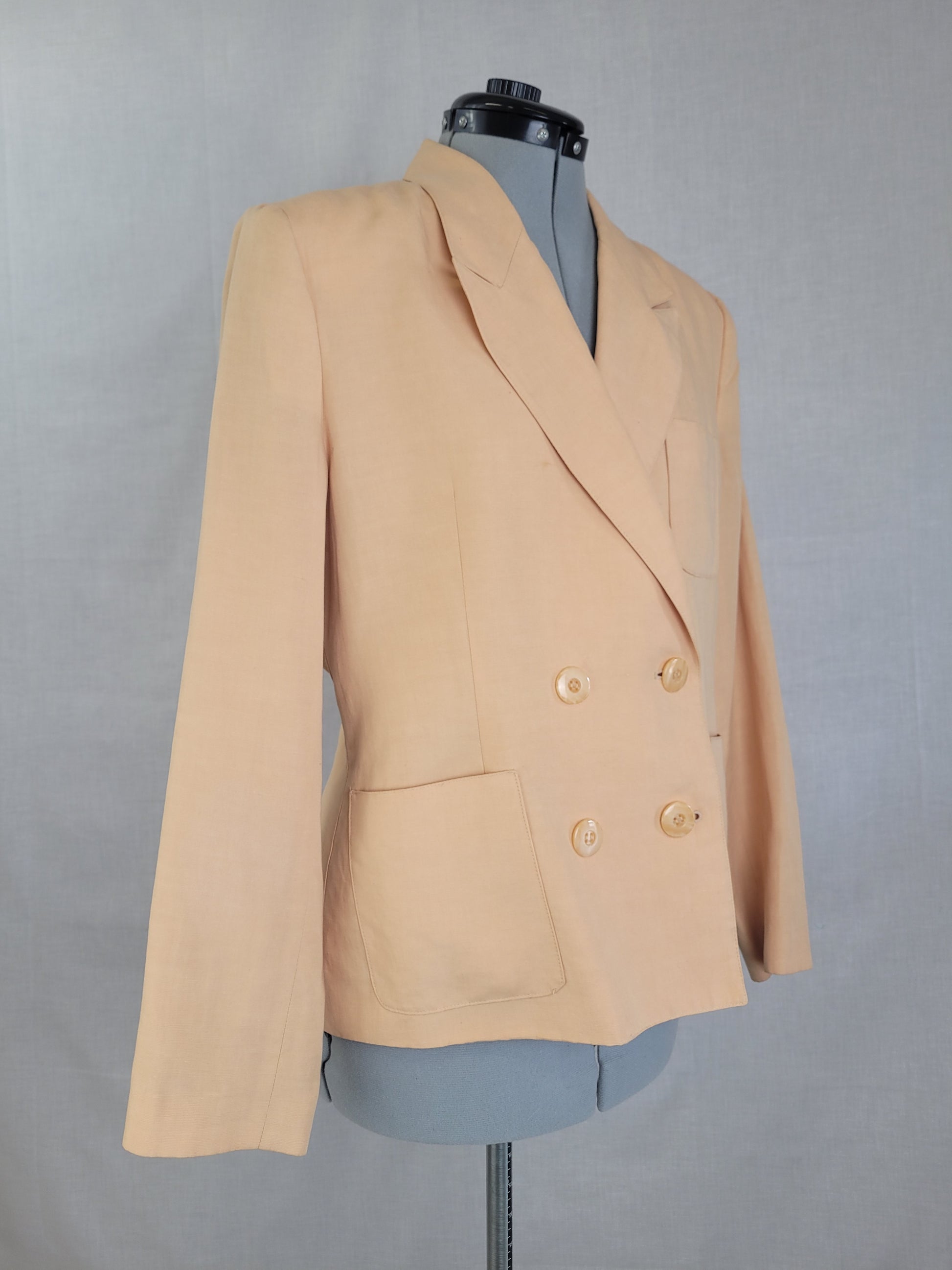 Beautiful pant suit in very good condition with minimal signs of wear. Fabric comprises 50% Tencel/30% Linen/20% Rayon. The jacket is double-breasted fit in a vintage size 10. The pants are a high-rise pleated silhouette in a vintage size 8.
