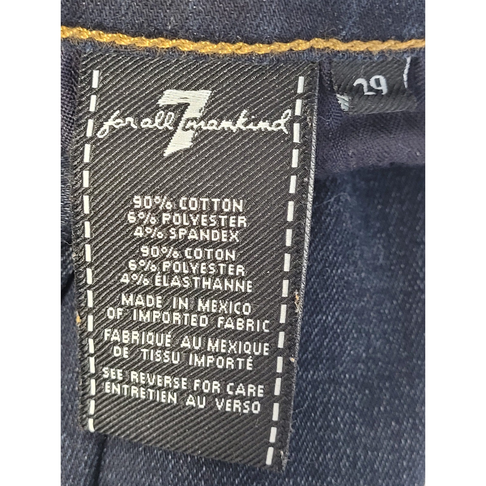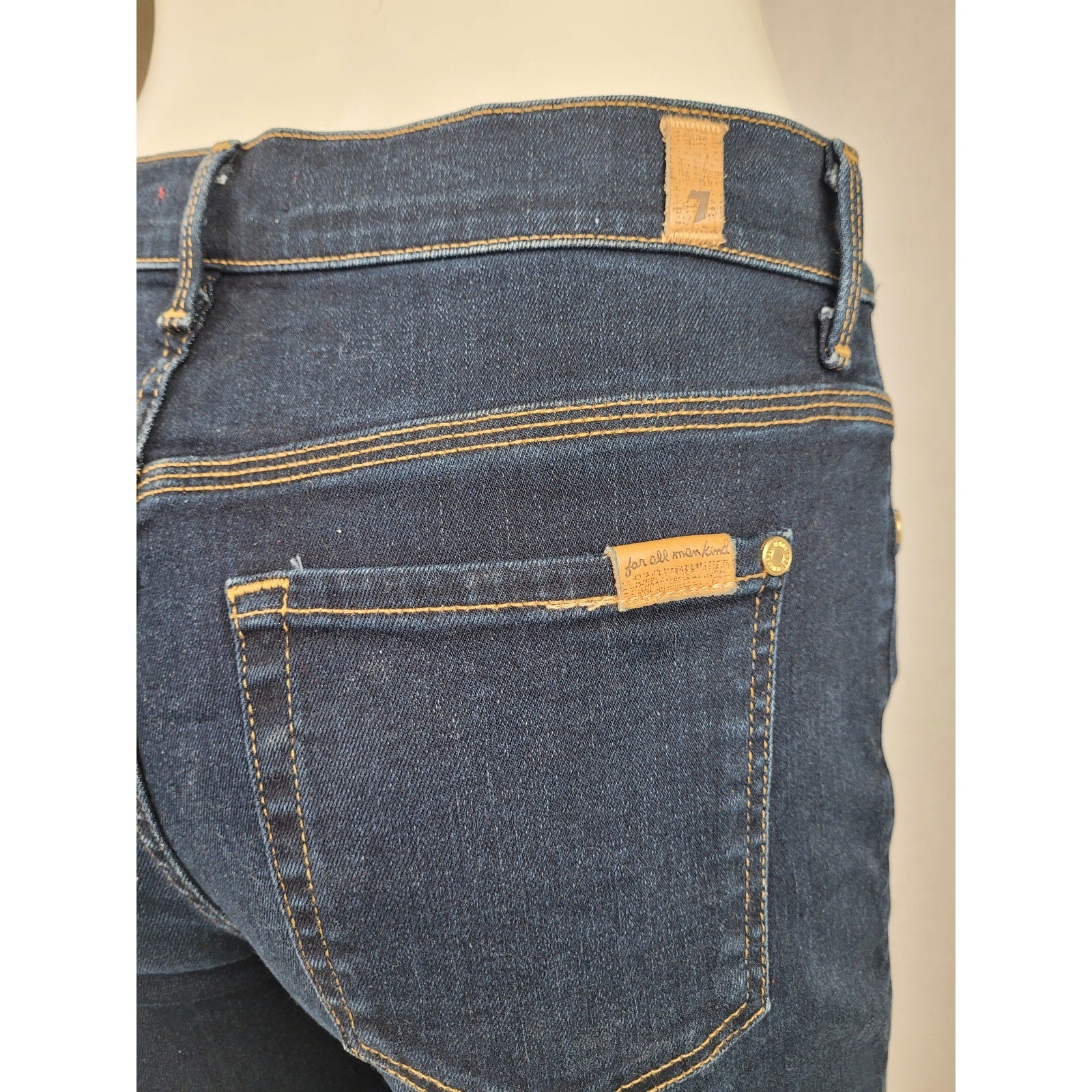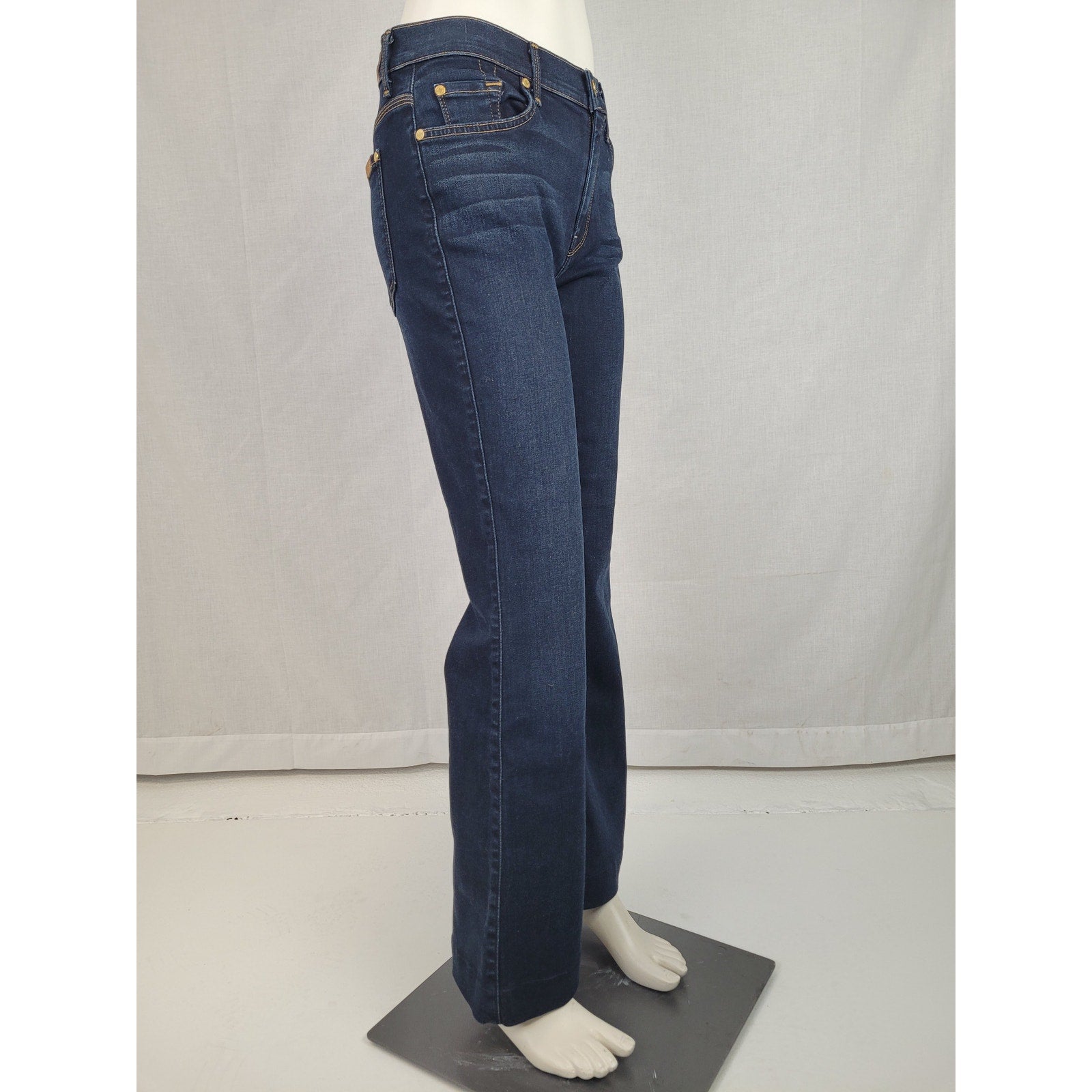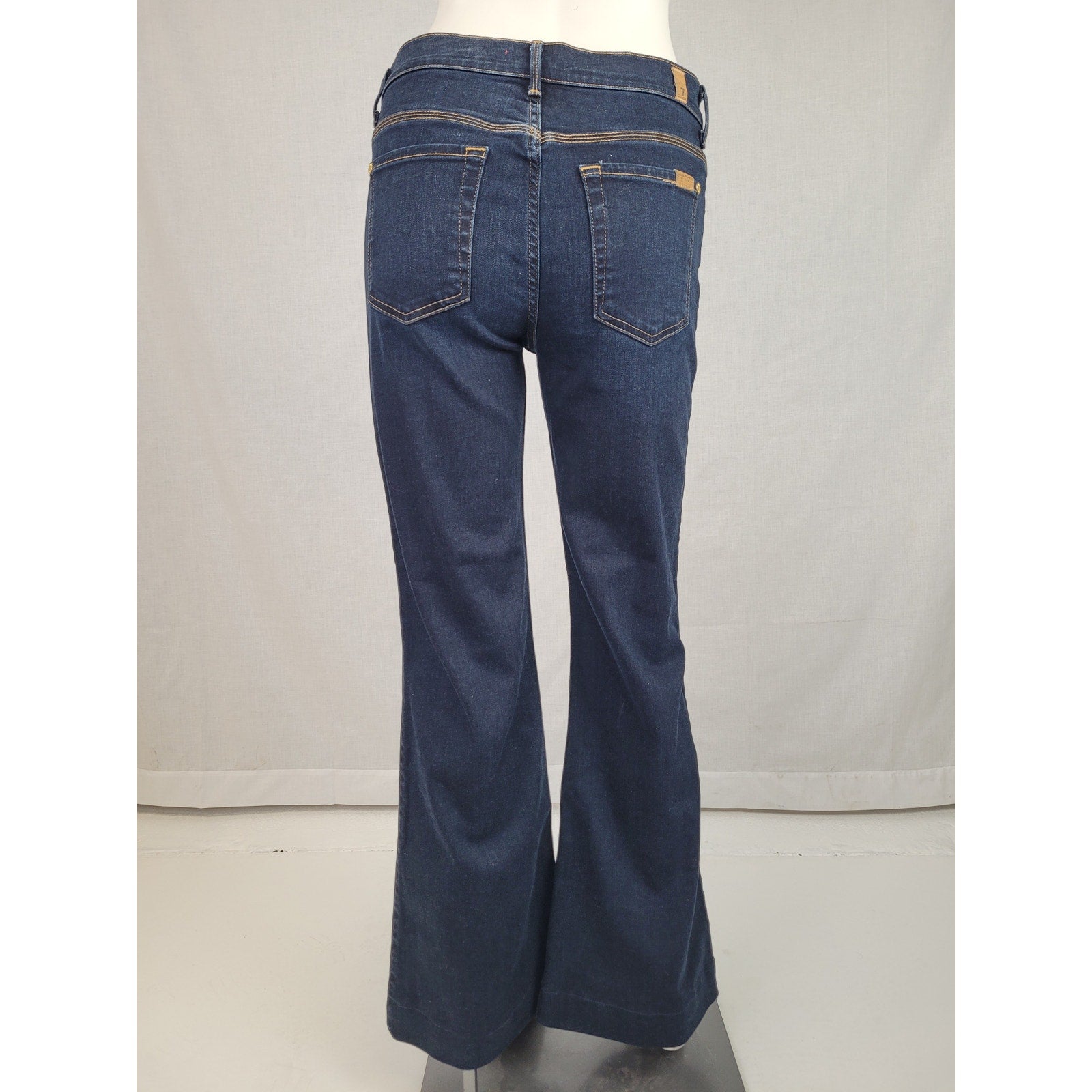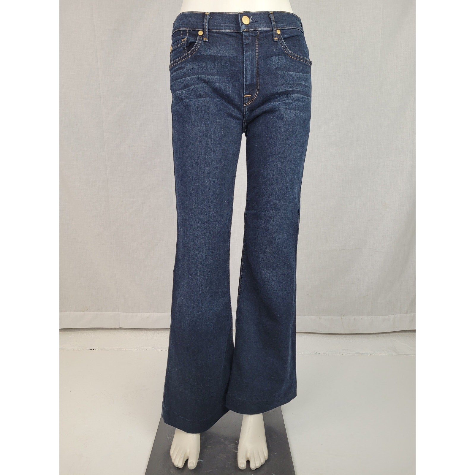 7 for All Mankind Ginger jeans in a dark blue wash. These jeans feature a flattering flare, wide leg style and a comfortable fit. Perfect for adding a touch of retro chic to your wardrobe! Size 29.