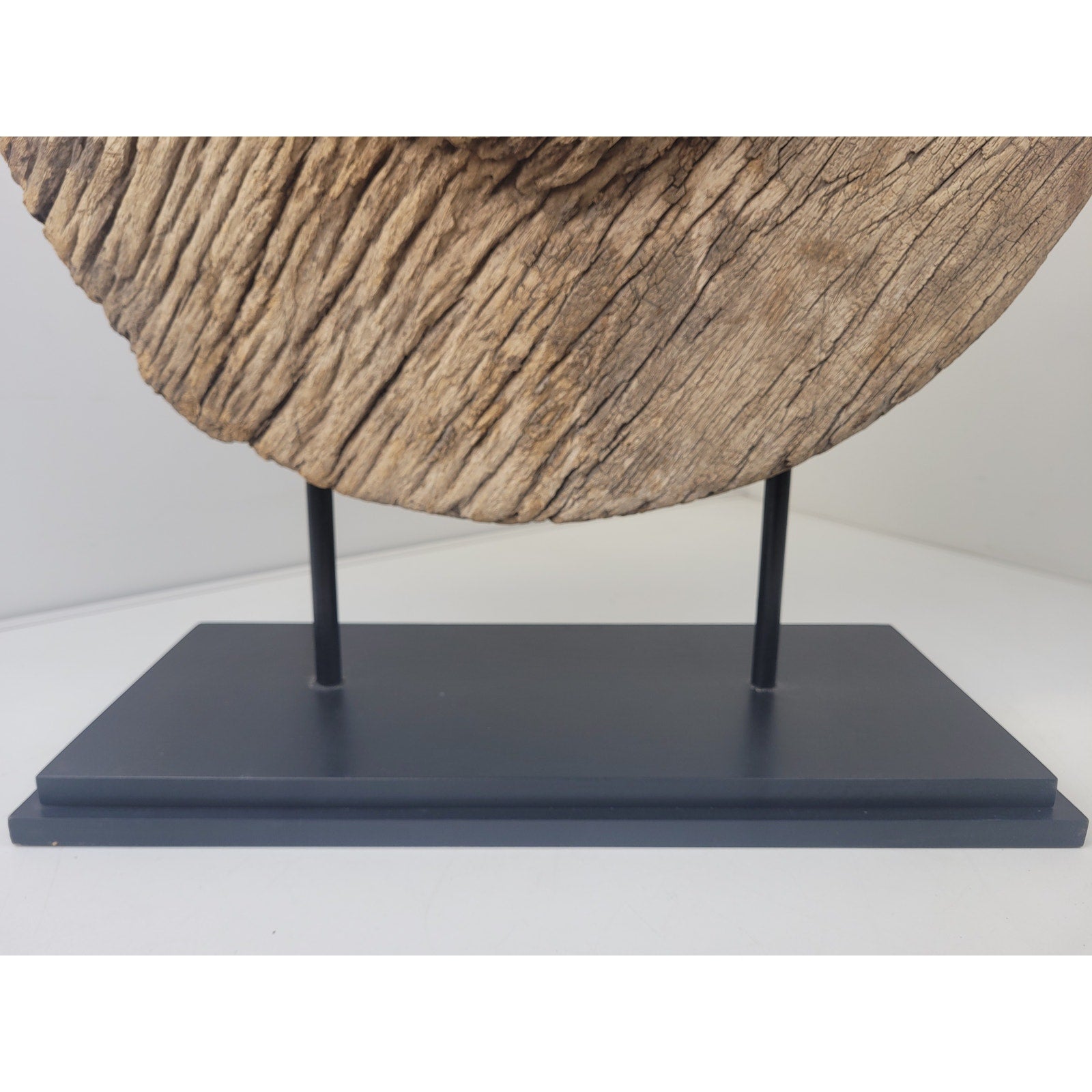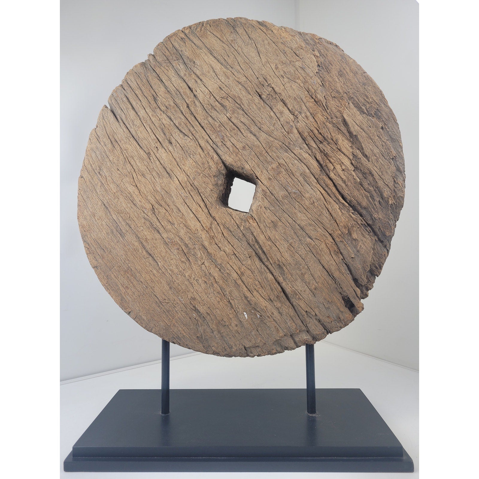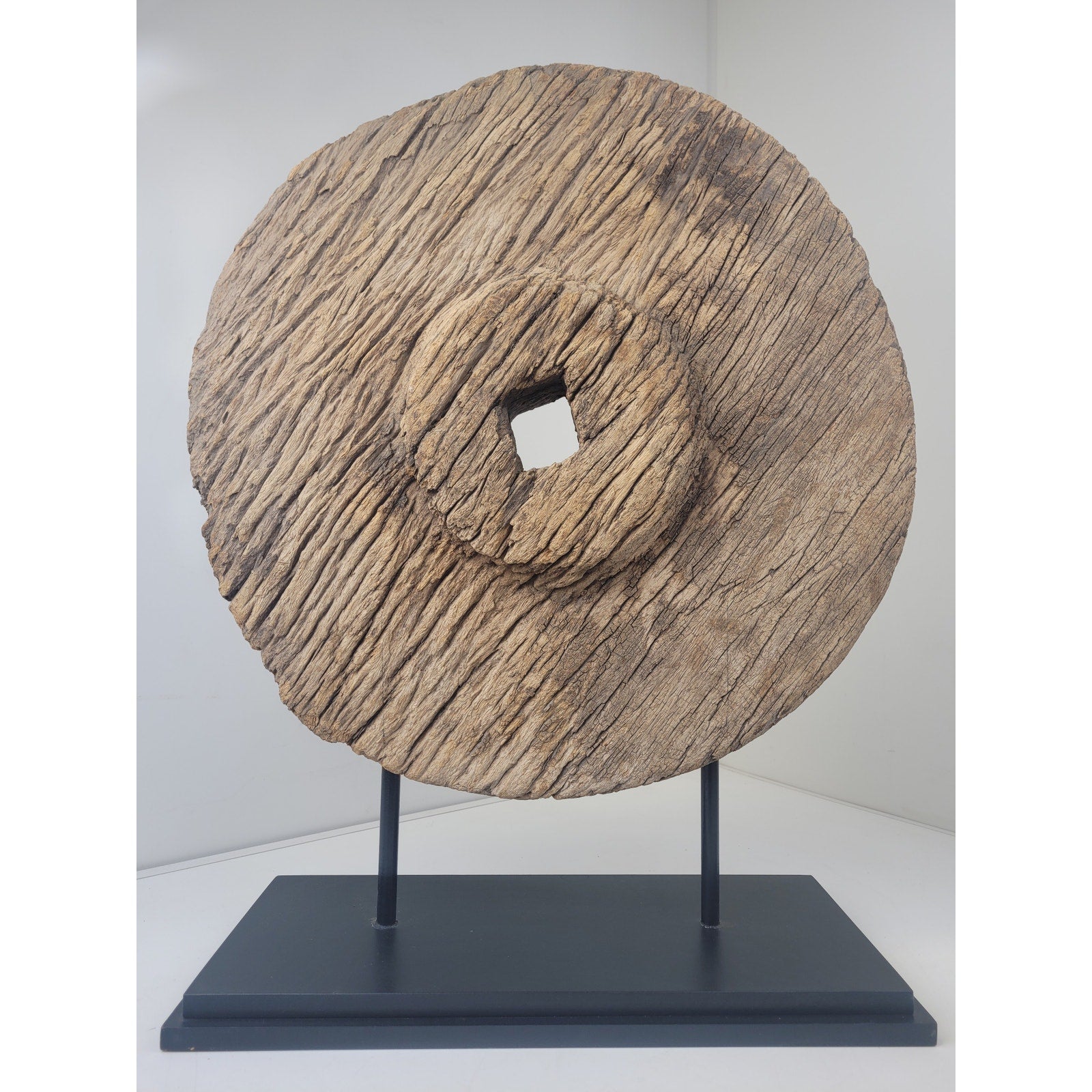 Add a touch of rustic charm to your home with this antique oxen cart wheel sculpture! This unique piece is mounted on a metal and wooden base, making it a perfect statement piece for interior design. Believed to be a primitive antique, its originality and quality will make it a valuable addition to any collection.