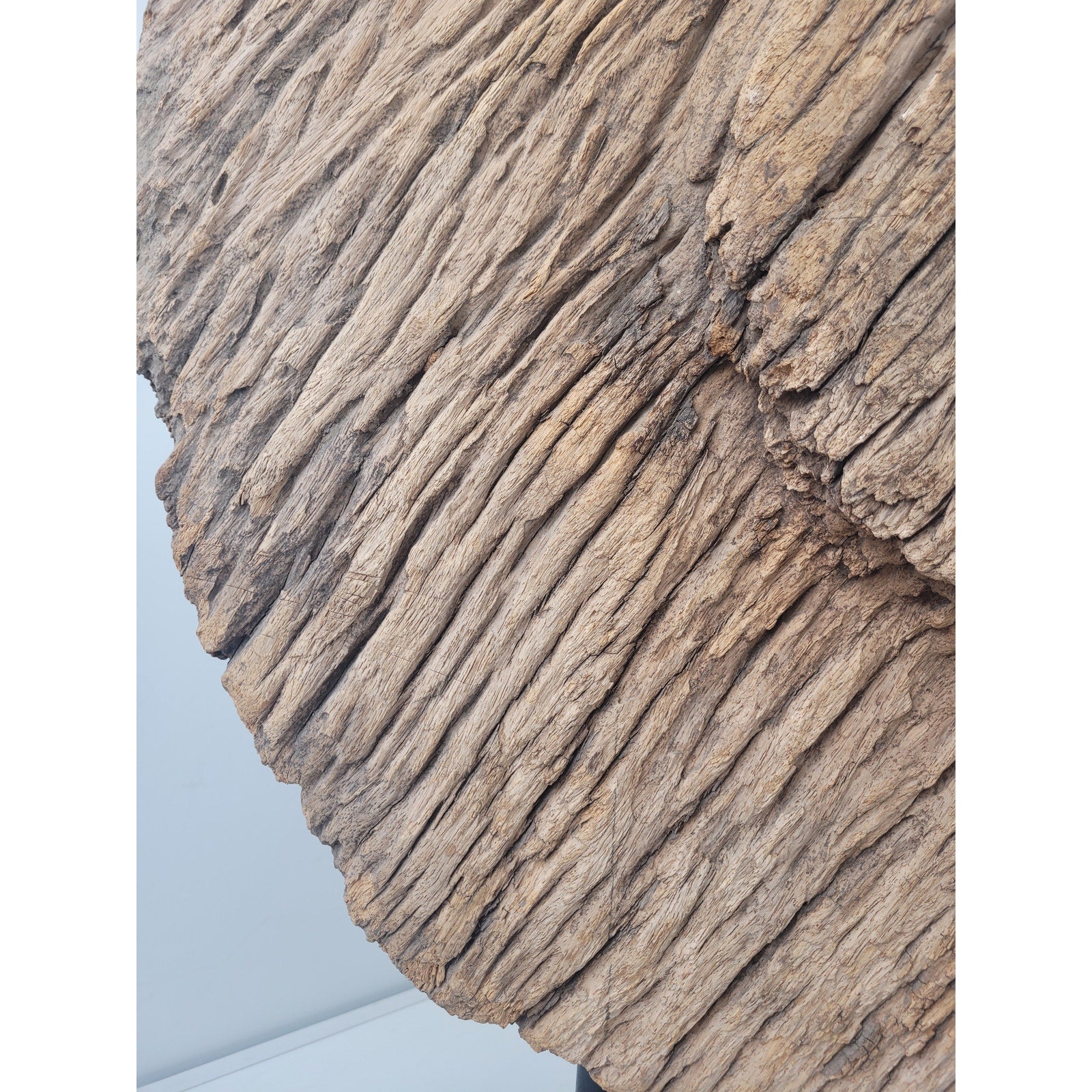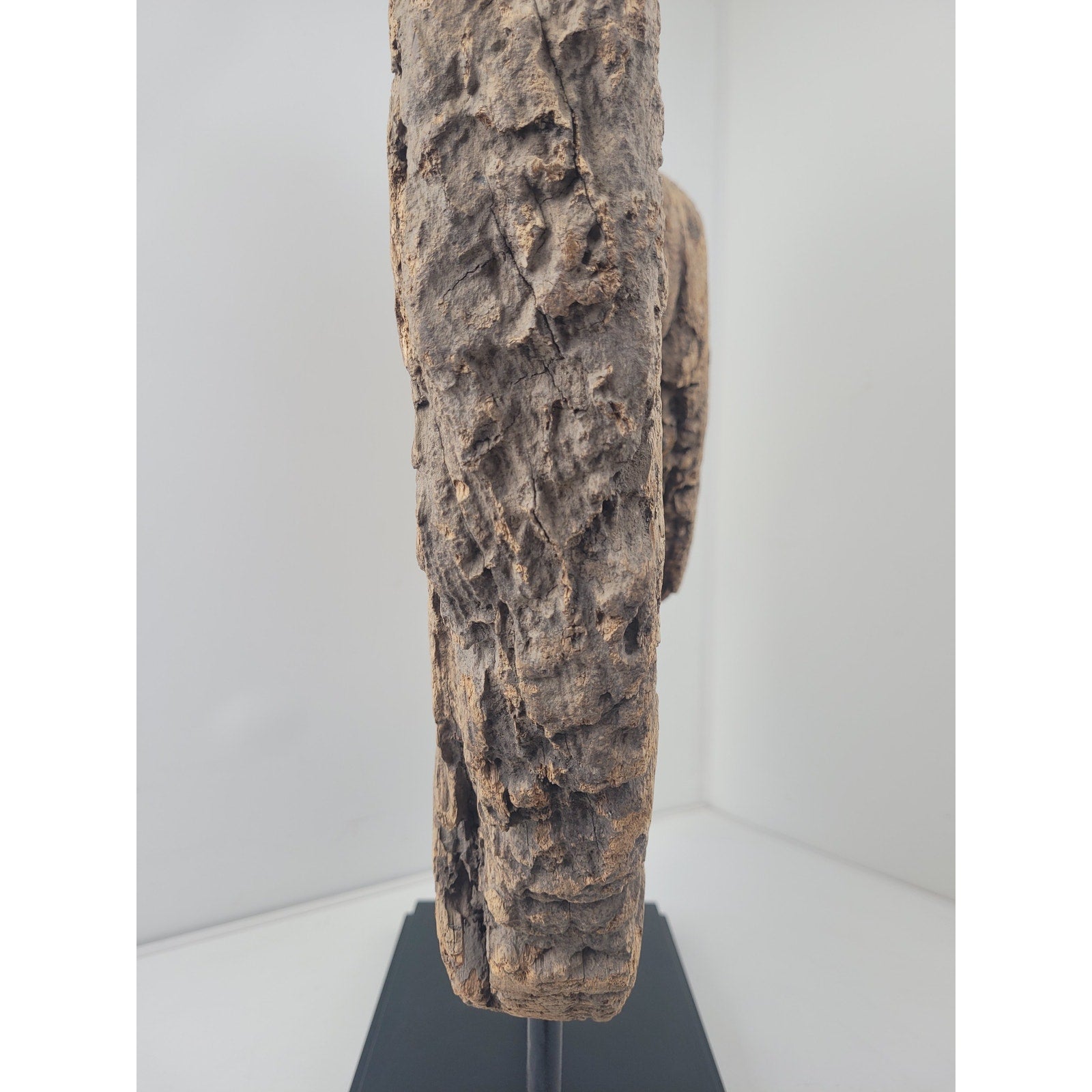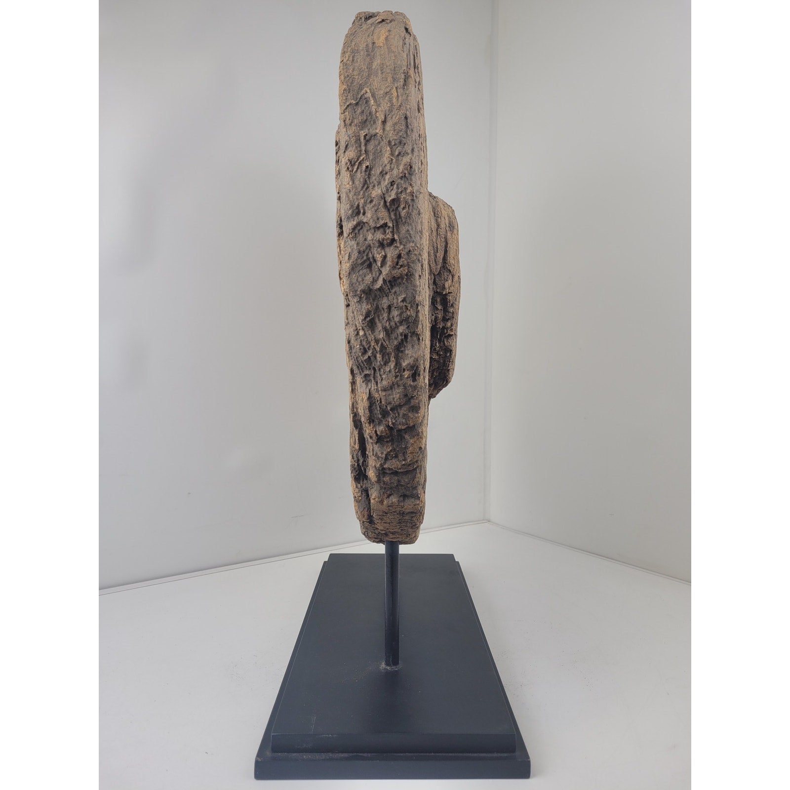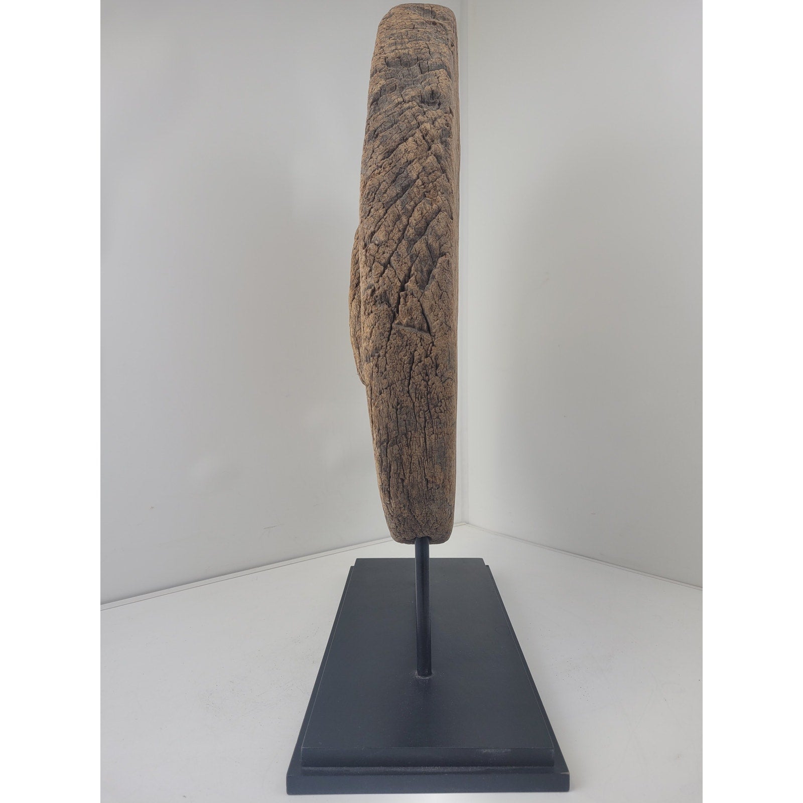 Add a touch of rustic charm to your home with this antique oxen cart wheel sculpture! This unique piece is mounted on a metal and wooden base, making it a perfect statement piece for interior design. Believed to be a primitive antique, its originality and quality will make it a valuable addition to any collection.