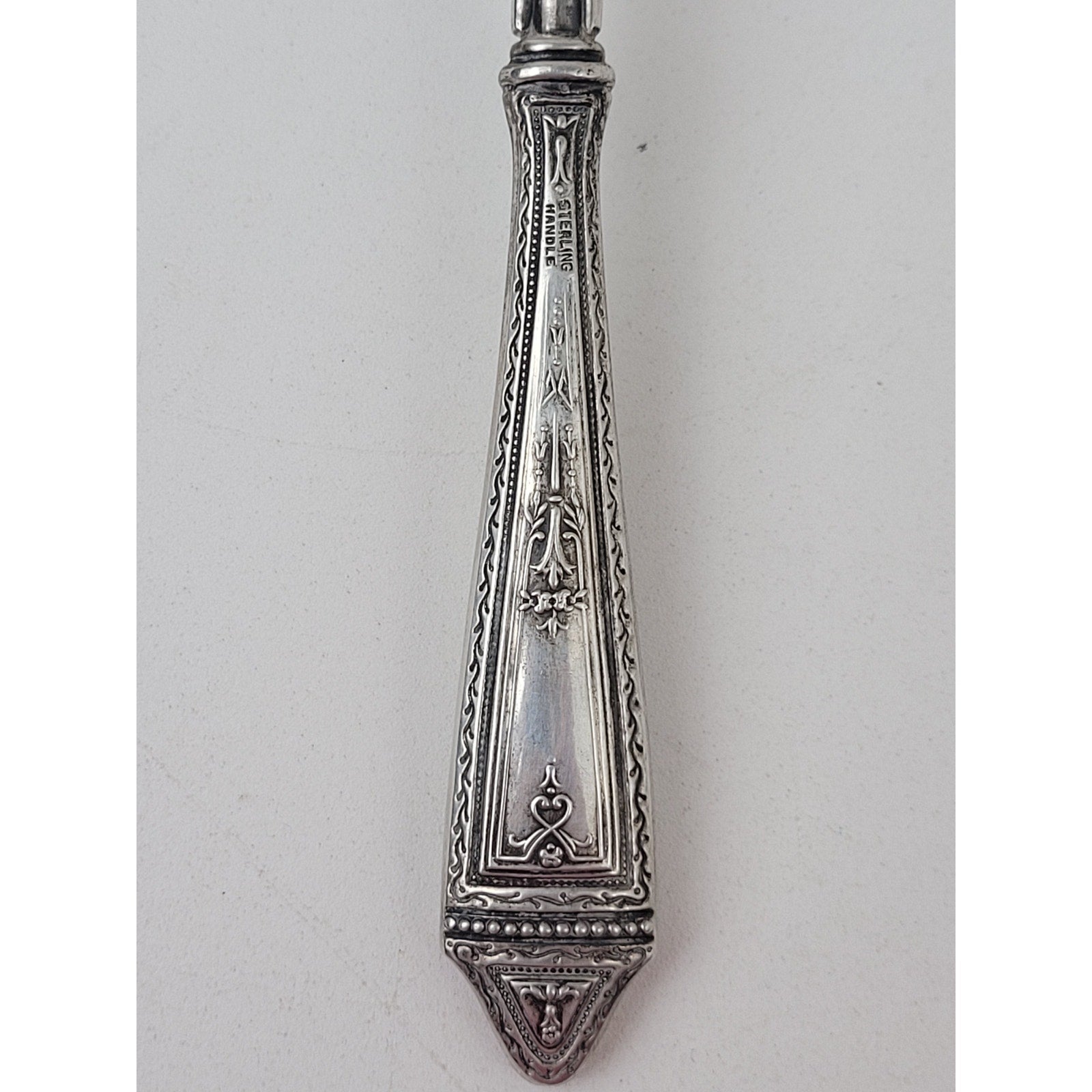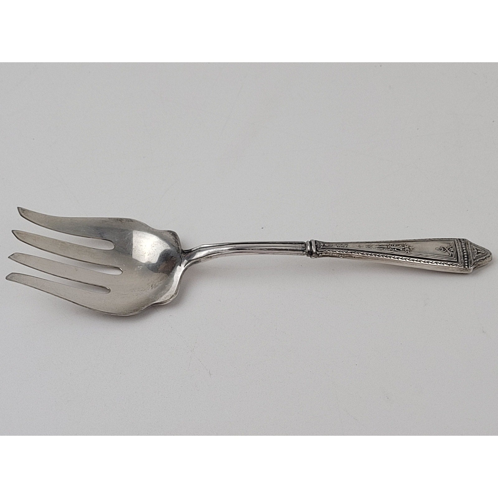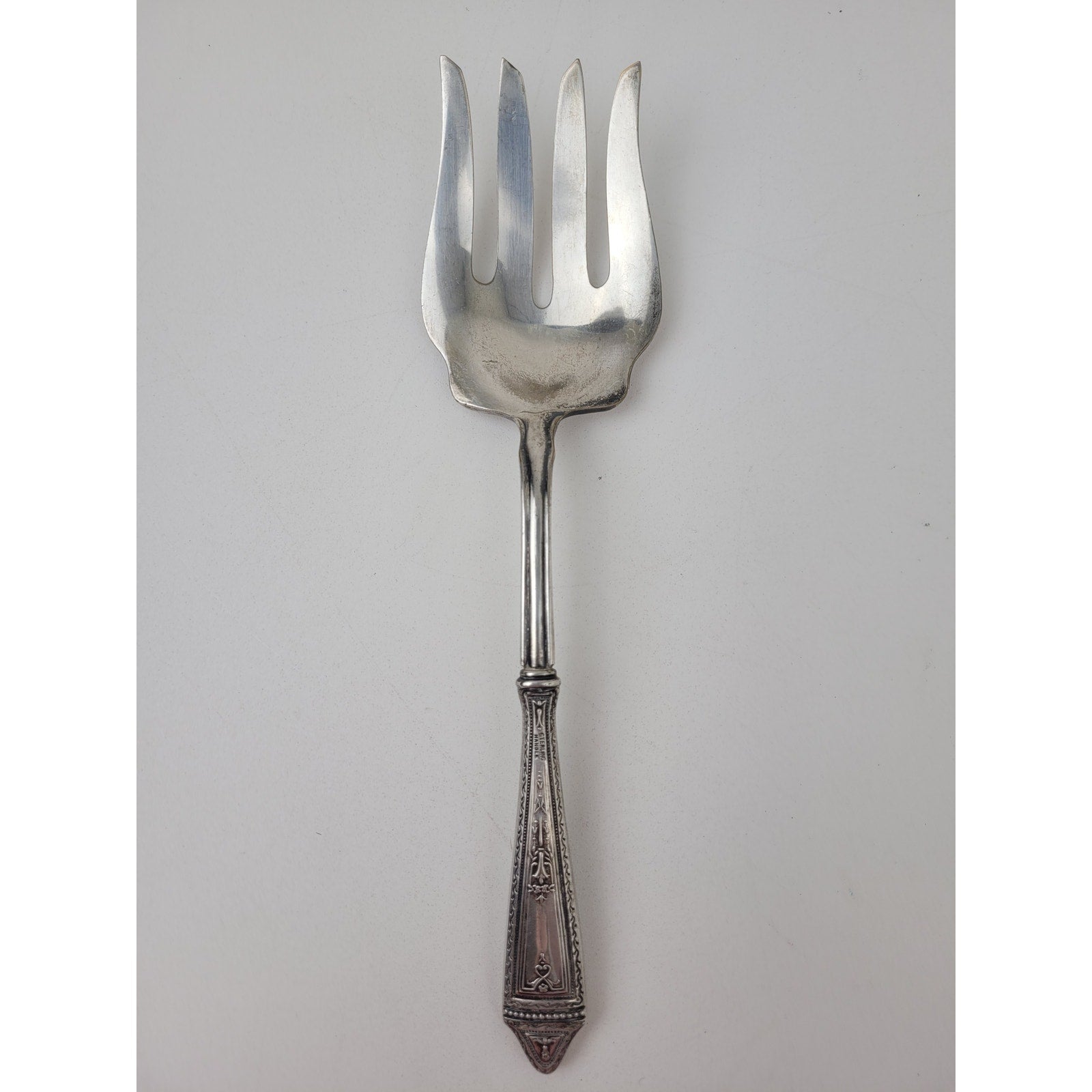 Crafted from high-quality sterling silver, this fork features a classic design with intricate detailing. It is in excellent condition for its age and has been well-maintained. It weights 2.6 oz.
