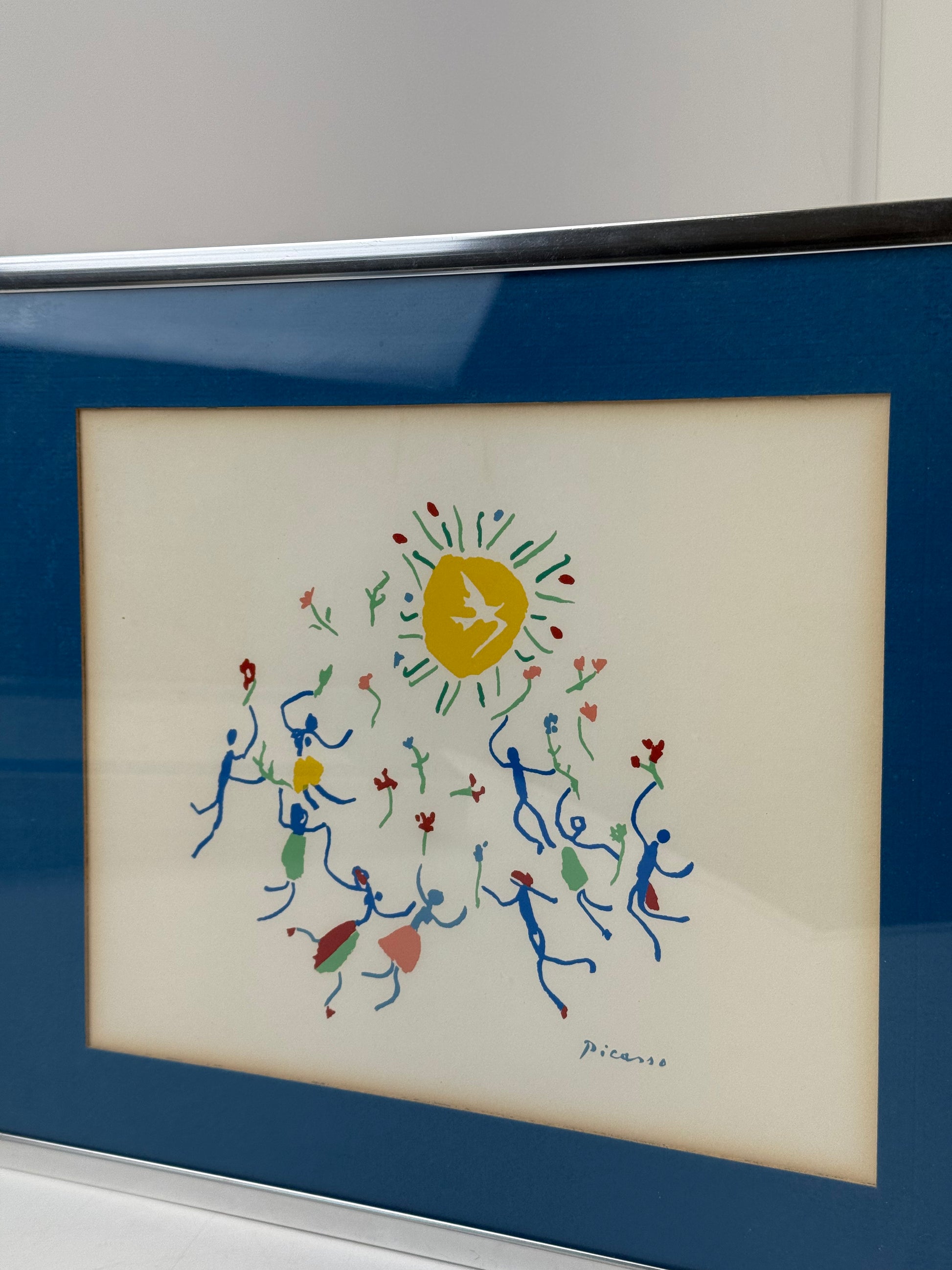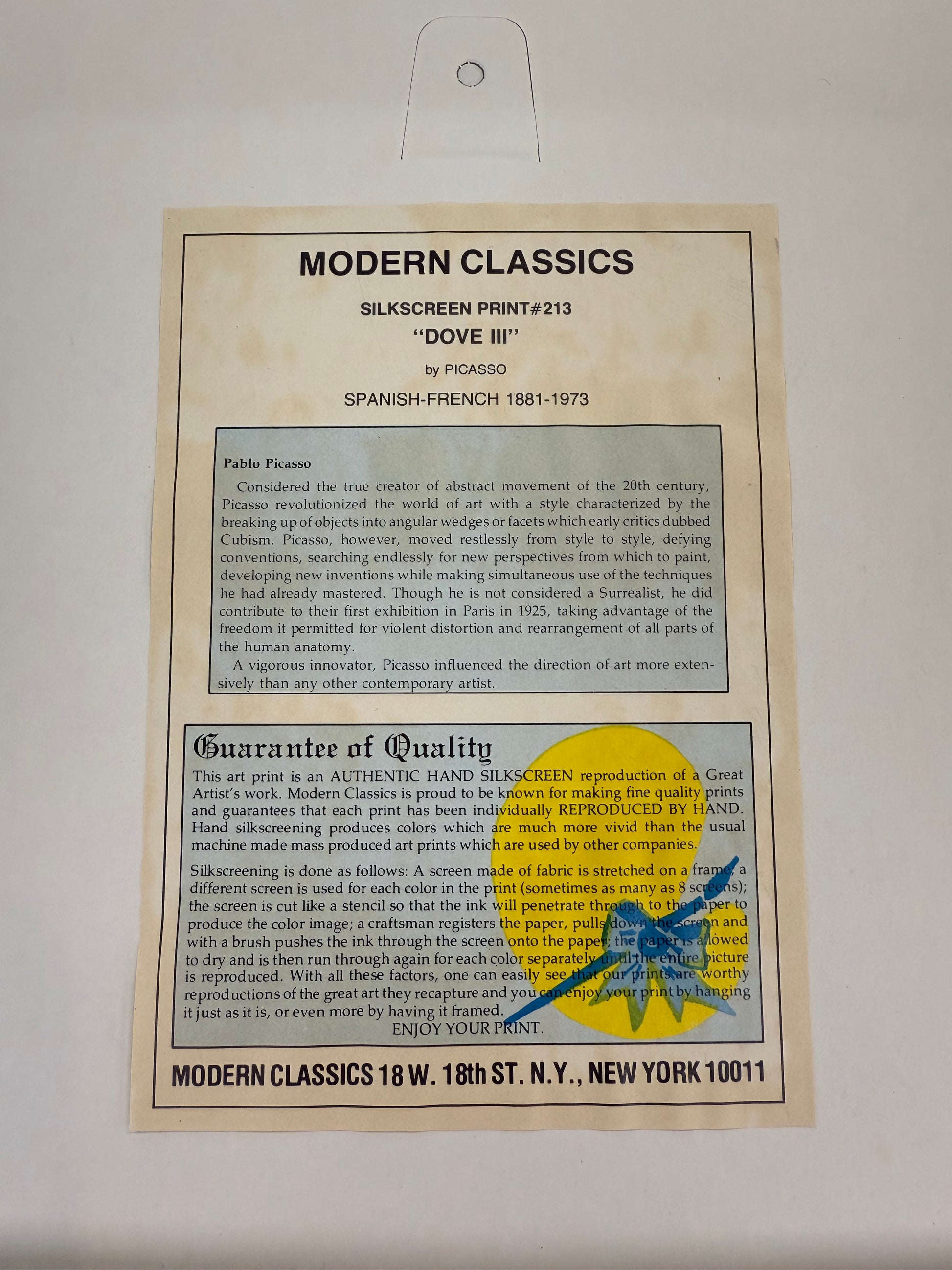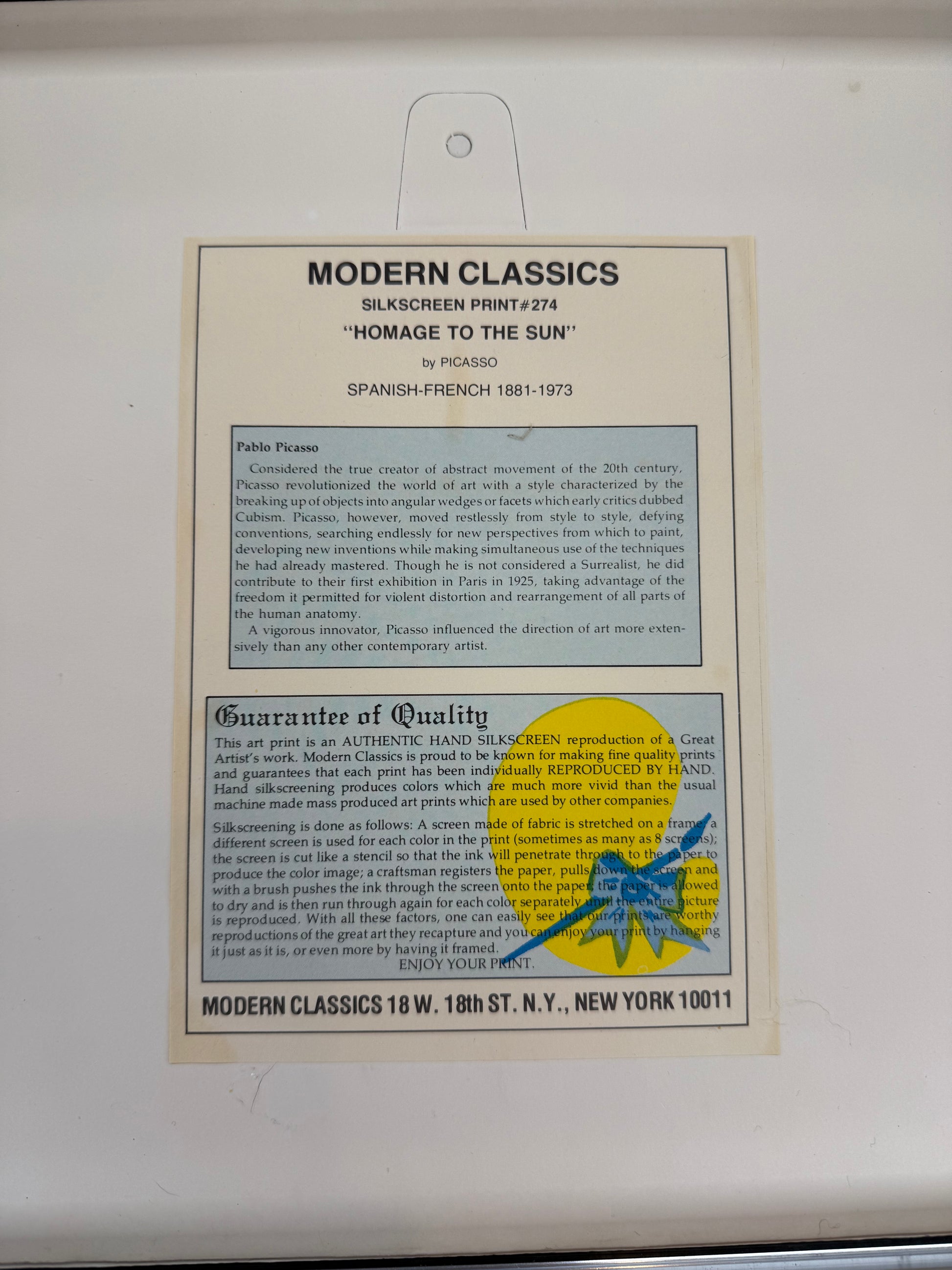 Experience museum-quality art with this authentic Hans silkscreen reproduction featuring two iconic Picasso works: "HOMAGE TO THE SUN" and "DOVE III." These masterful reproductions capture the essence of Picasso's revolutionary artistic vision, showcasing the Spanish-French master's distinctive style that defined 20th-century art (1881-1973). Each silkscreen is meticulously crafted to preserve the vibrant colors and bold compositions of the originals, making this a significant addition to any serious art collection.