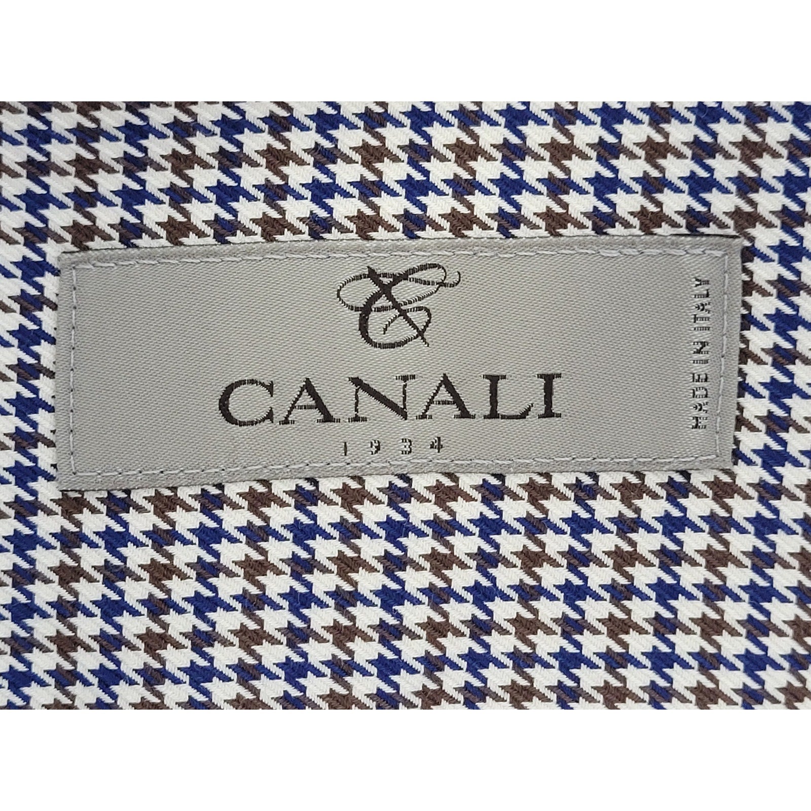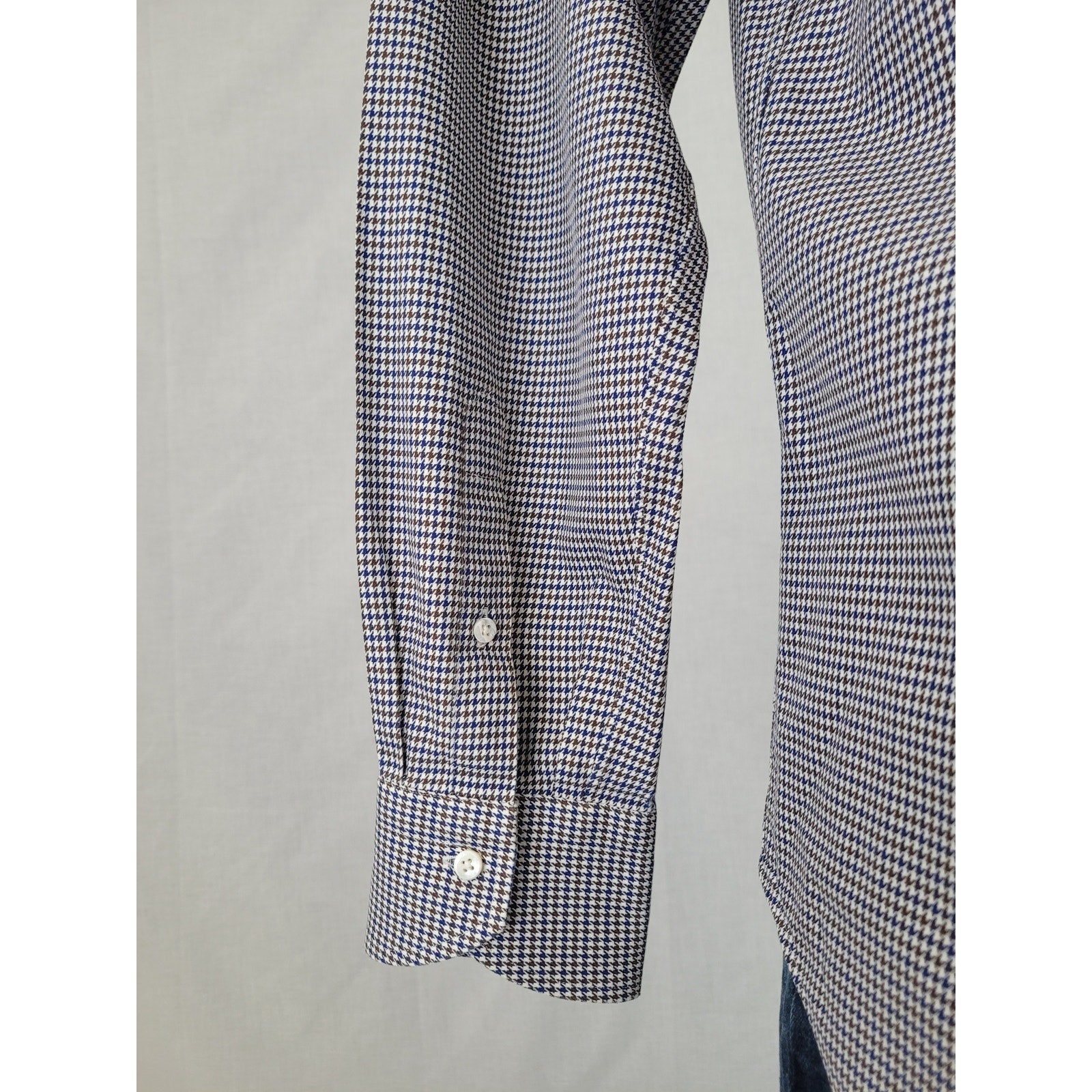 Handsome Canali dress shirt with a houndstooth plaid pattern. The Italian-made fabric has a luxurious feel to it. One button at the end of the row is chipped. Otherwise, the shirt is in excellent condition.