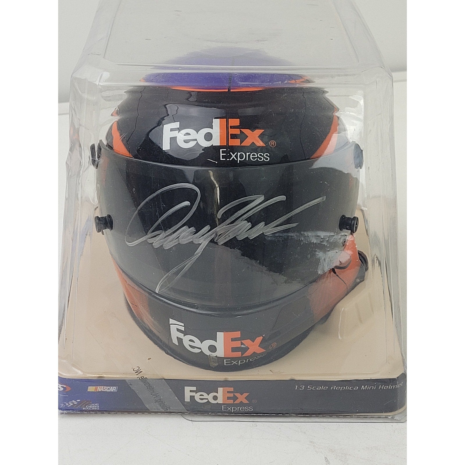 The item for sale is a pre-owned Denny Hamlin Autographed NASCAR Fedex Express Mini (1:3 size) Helmet in Original Box. The helmet is in very good pre-owned condition. The box itself is a bit worn.