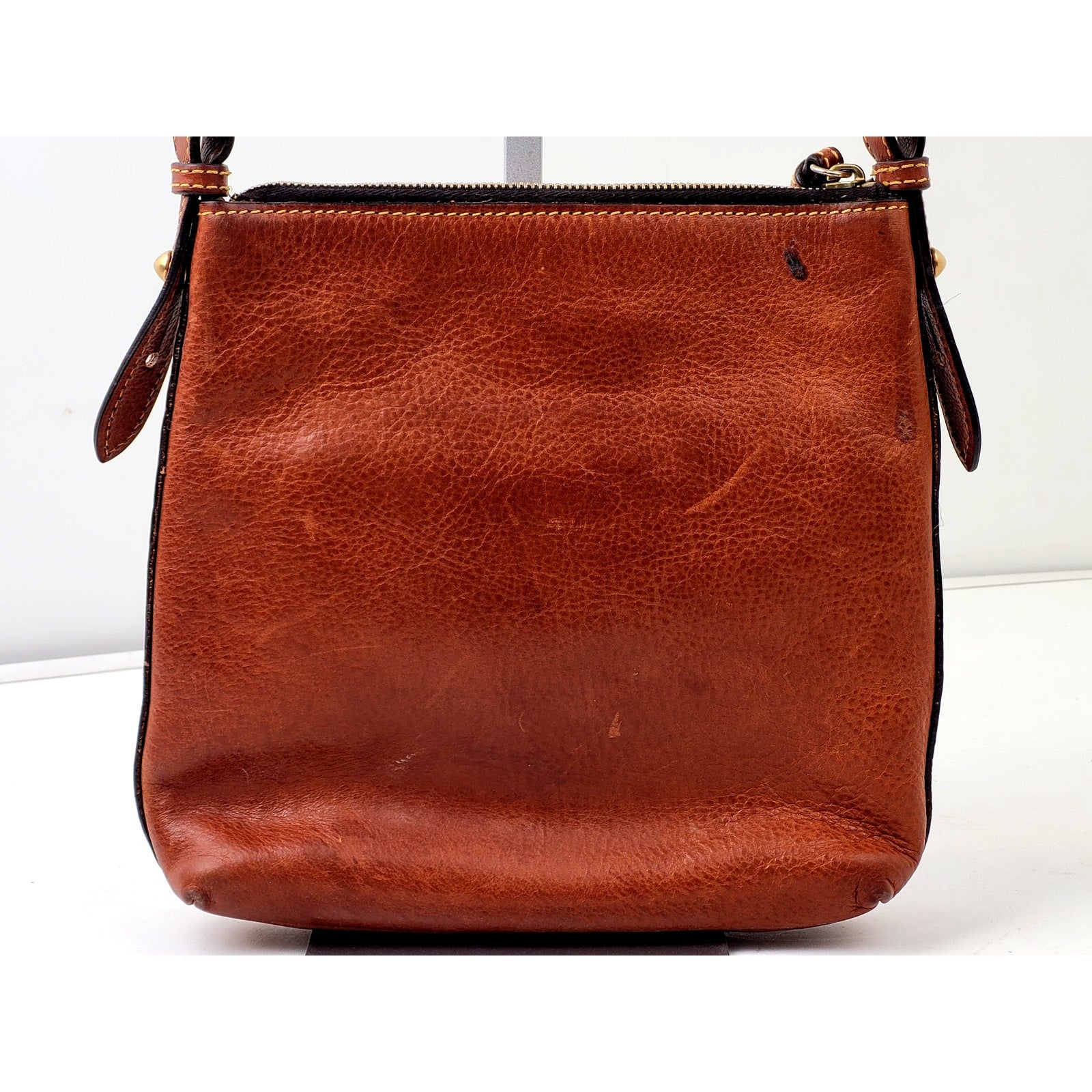 This is a beautiful Dooney & Bourke crossbody bag in caramel pebble grain leather. It measures 9.5" H x 9.75" W x 1.5" D with a 25" adjustable strap drop.