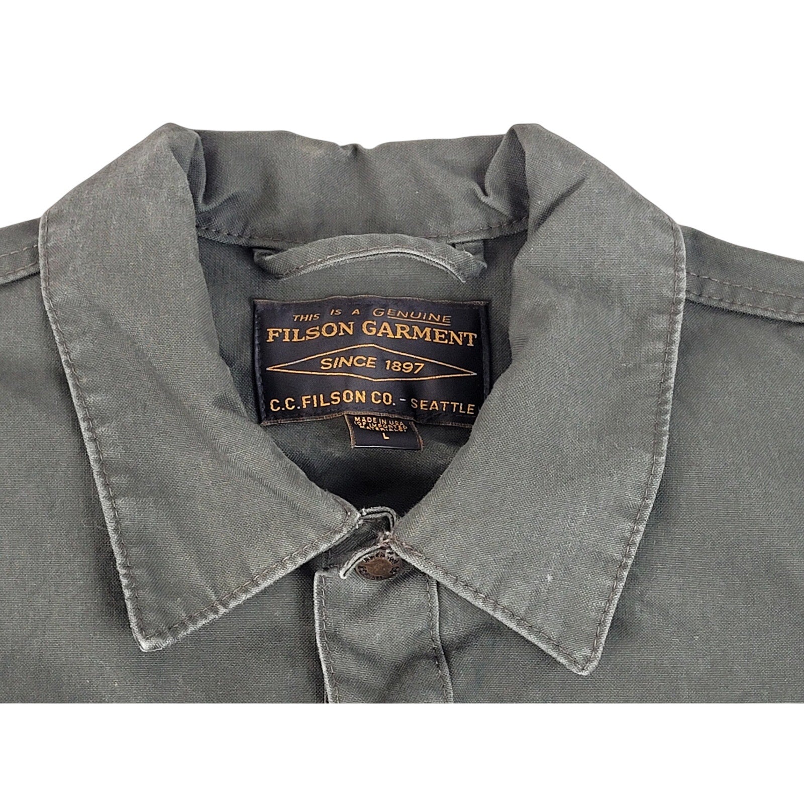 Filson's Dry Tin Cloth Jac-Shirt is a barrier against wind, briars, and brush with minimal bulk. The 10.5-oz. 2-ply by 2-ply cotton duck canvas is renowned for its exceptional abrasion resistance. The side-entry hand pockets are easy to access are are bar tacked for durability. The metal snaps are durable and easy to fasten while wearing work gloves. Side-seam slits provide greater ease of motion.