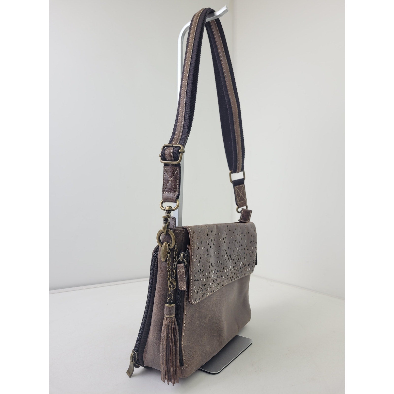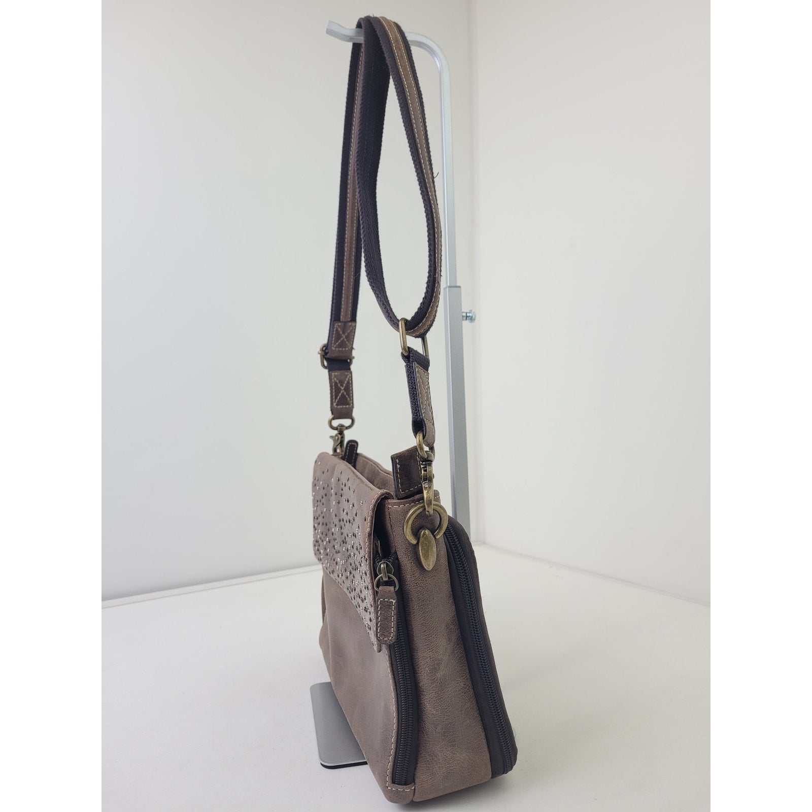 • Hammered multi-color rivets decorate Flap over Closure