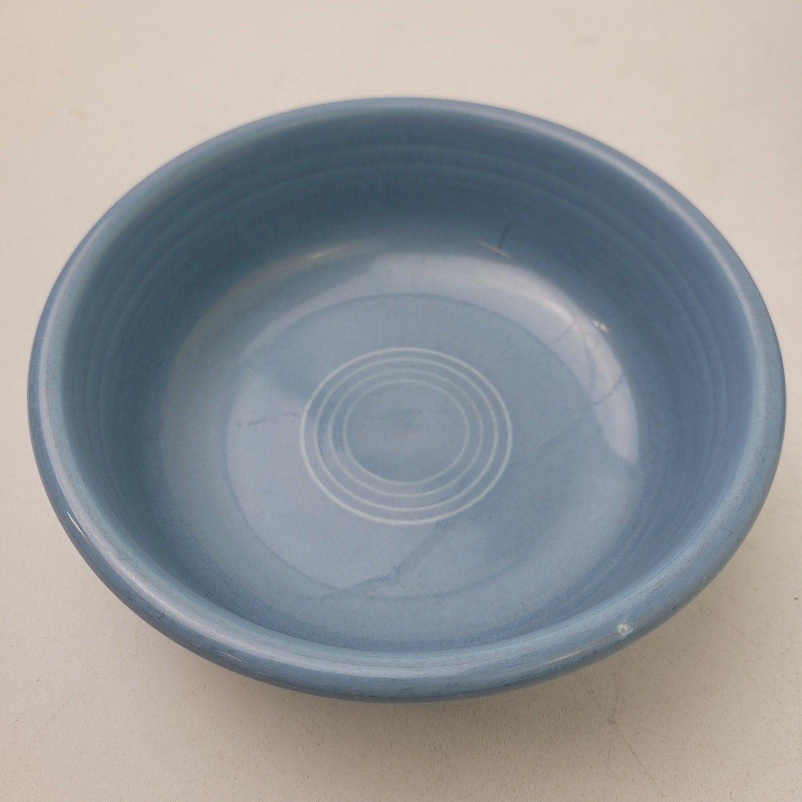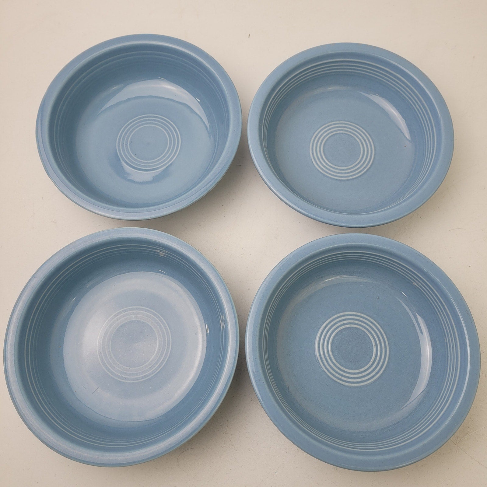 Add a touch of vintage charm to your table with this beautiful set of Fiestaware bowls in the lovely retired Periwinkle Blue color. This set includes four coupe soup bowls and two small bowls, perfect for serving your favorite dishes. These bowls have been previously owned but are in very good condition.