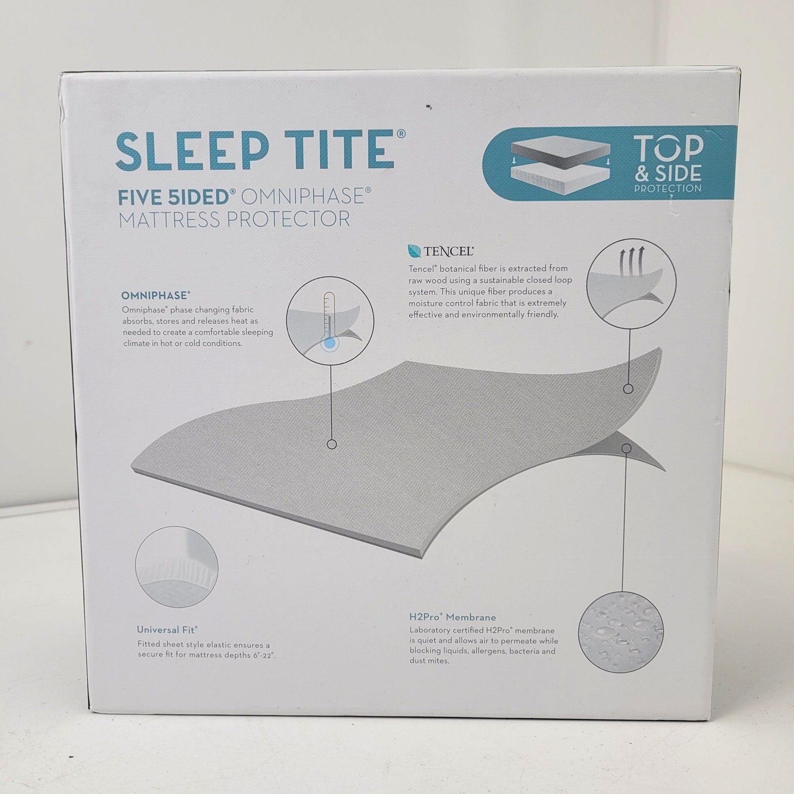 Five-sided protection against liquids, allergens and dust mites. Featuring moisture wicking Tencel and temperature regulating Omniphase fabric for a Queen sized mattress.