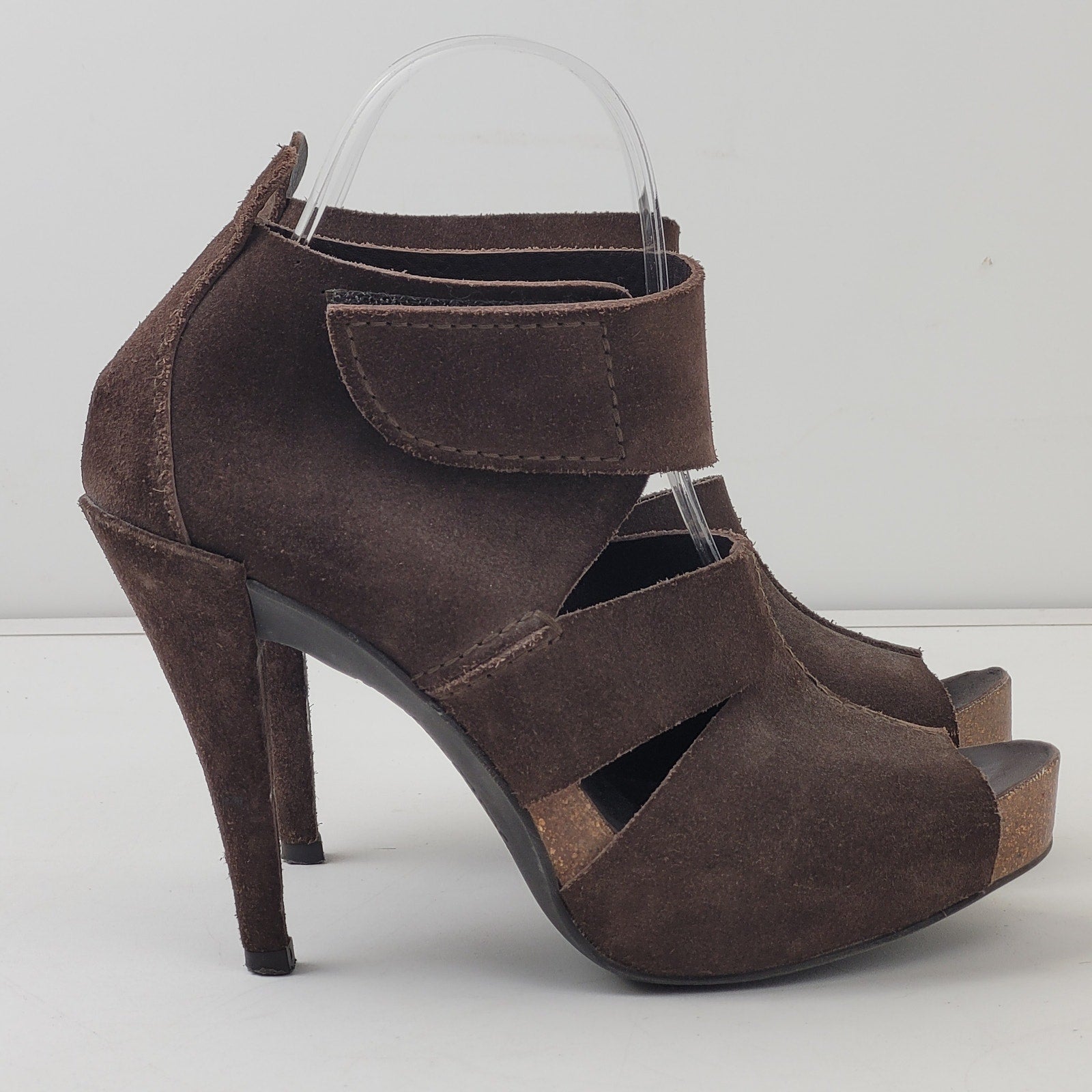 Fashionable suede leather bootie heels by Spanish shoe designer Pedro Garcia. The tall, 4" heels are balanced by a 1" platform. The upper part of the shoe closes with adjustable Velcro for a snug fit. Gorgeous pair of shoes!