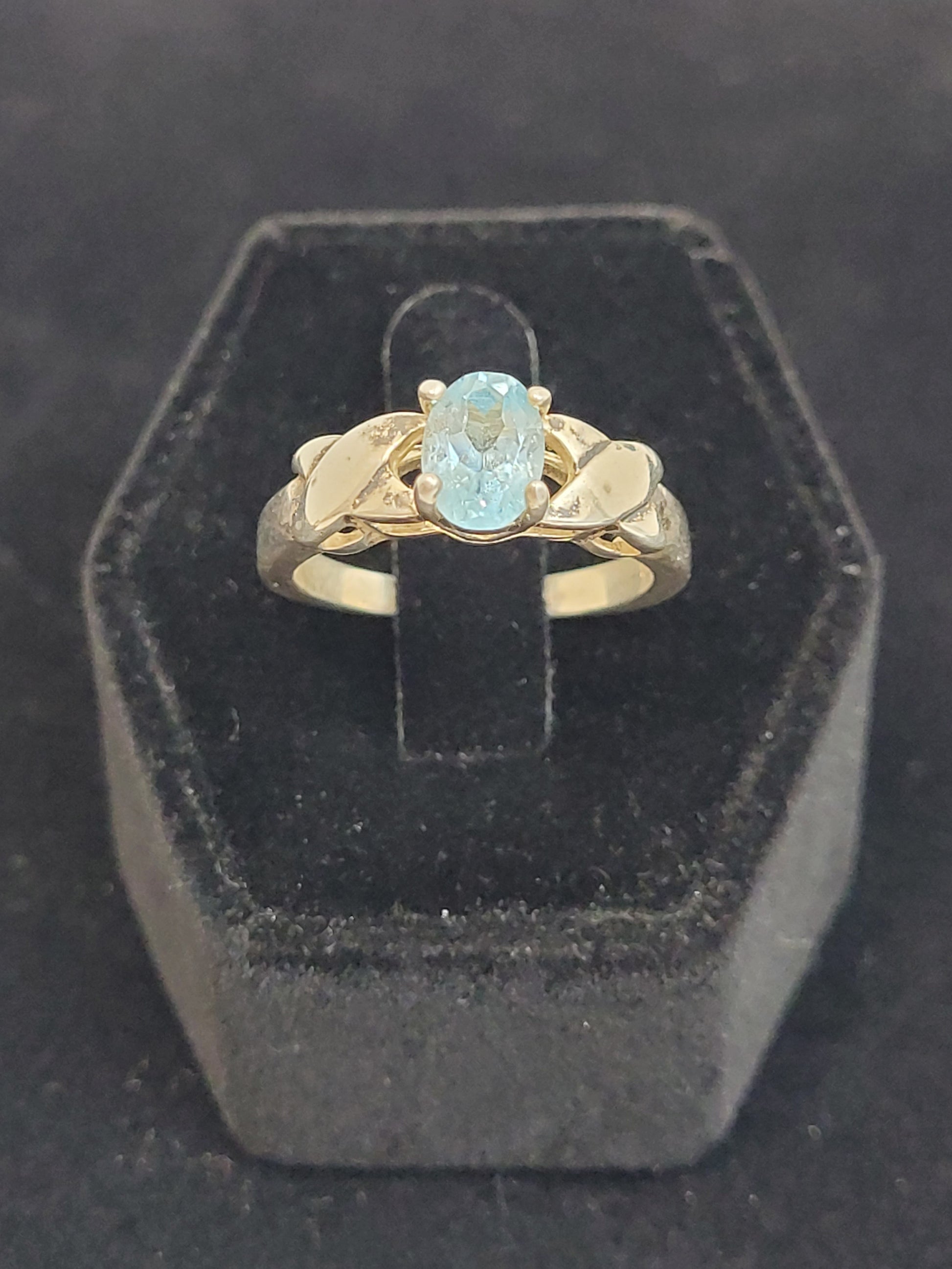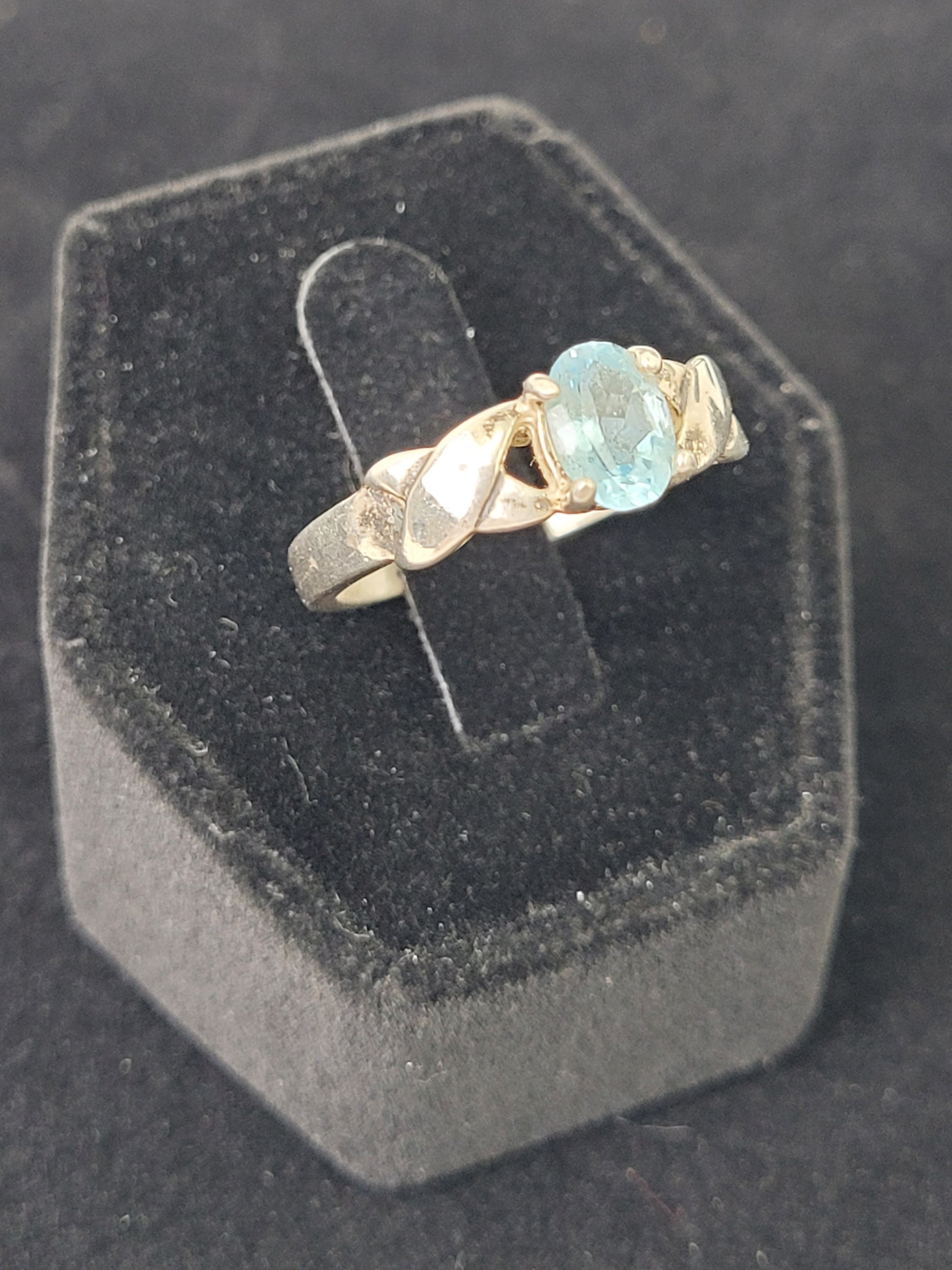 Crafted from high quality silver stamped with the number 925 weighing in around 1oz, this ring features a dazzling oval aquamarine stone set in a prong setting. The sides of the stone are adorned with intriguing x-shaped details.
