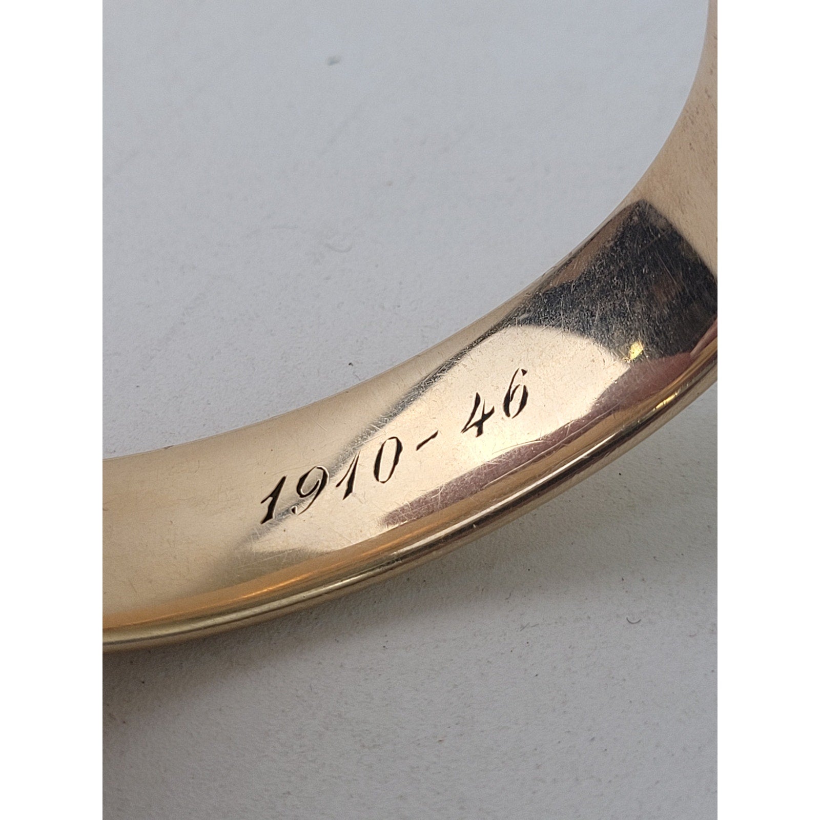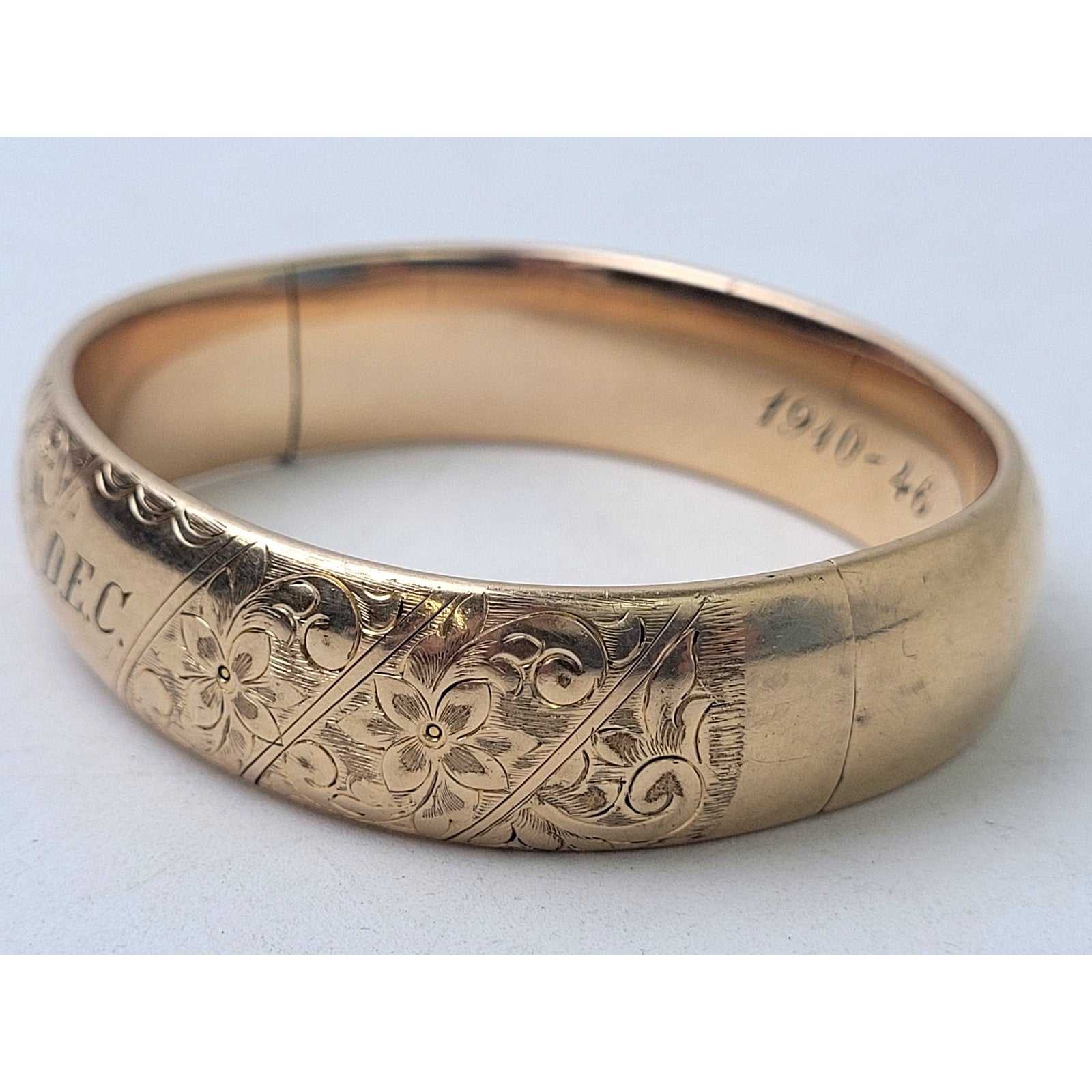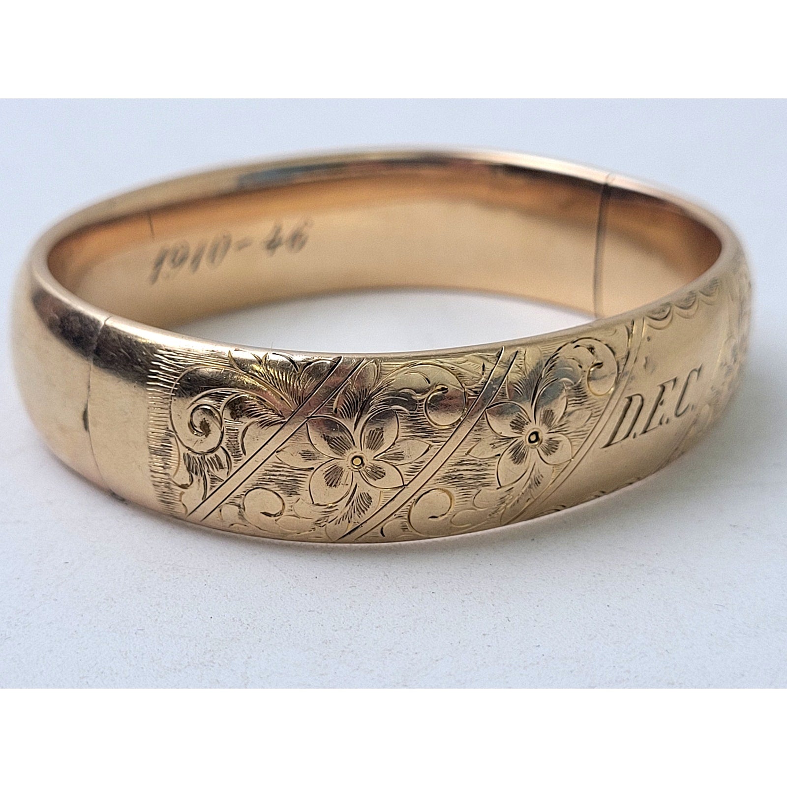 Experience the charm of our S.B. Co. Hinged Bangle Bracelet with Floral Etching. The front boasts a beautiful, intricate etched floral design, while the back remains understated with no markings. This bangle is signed and features a secure snap closure for effortless wear. It is engraved with the initials D.E.C. and has some dates and initials engraved on the inside.