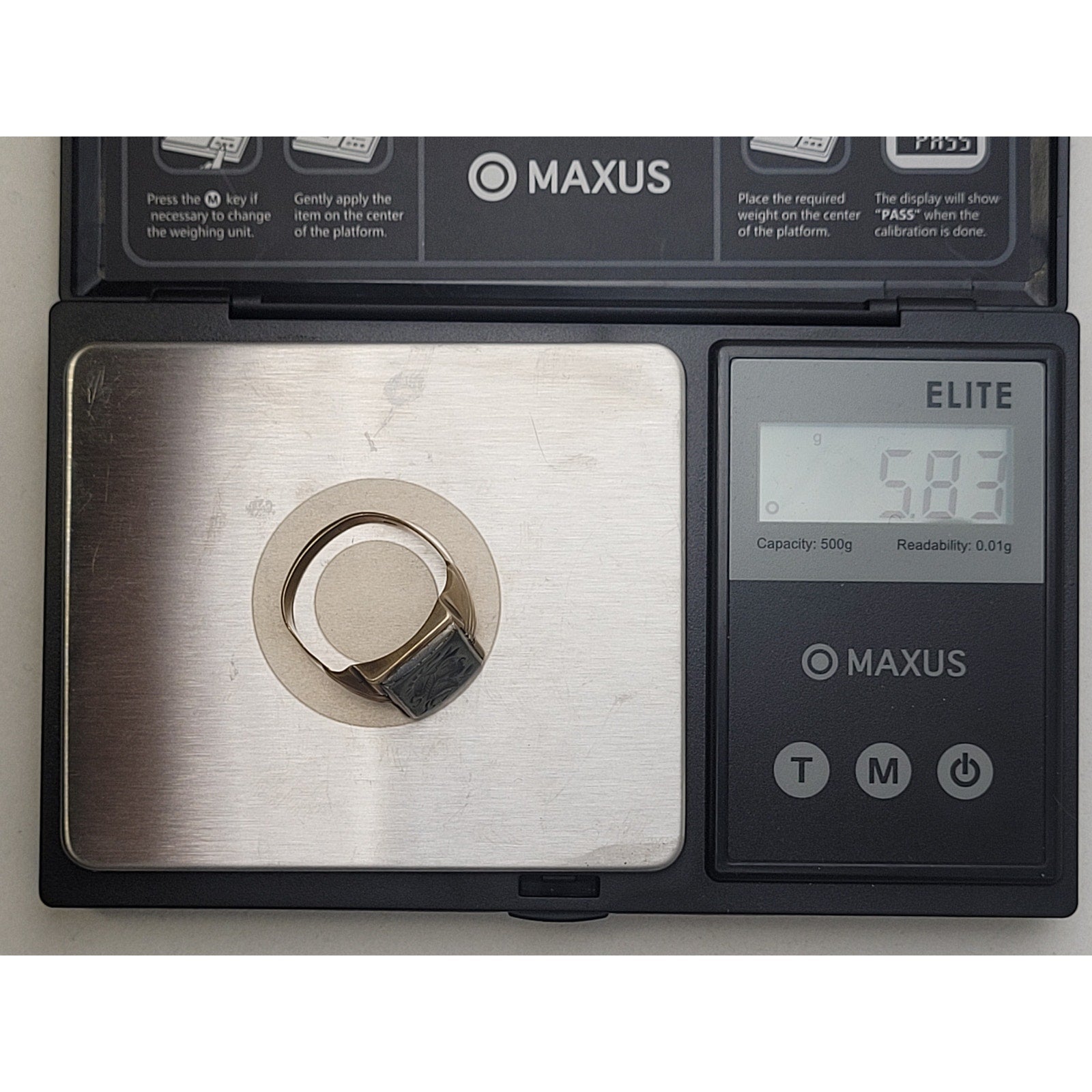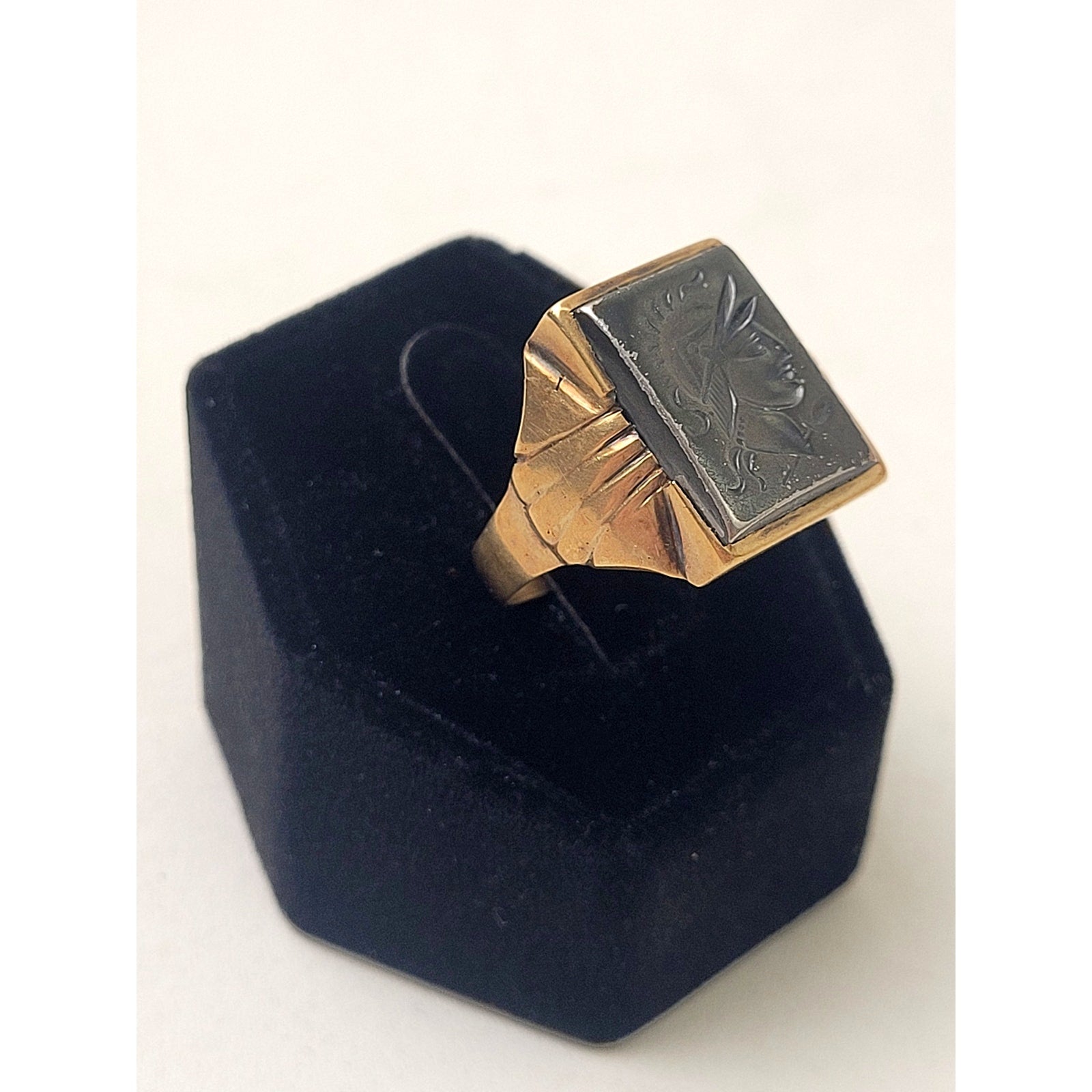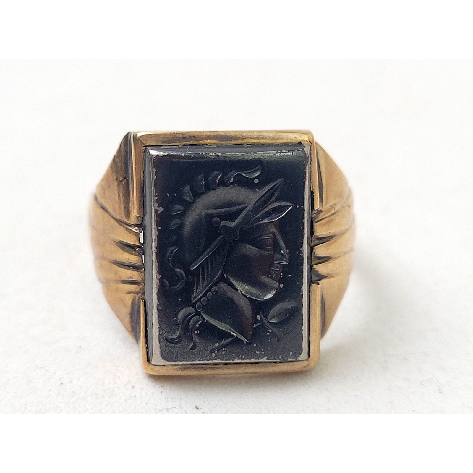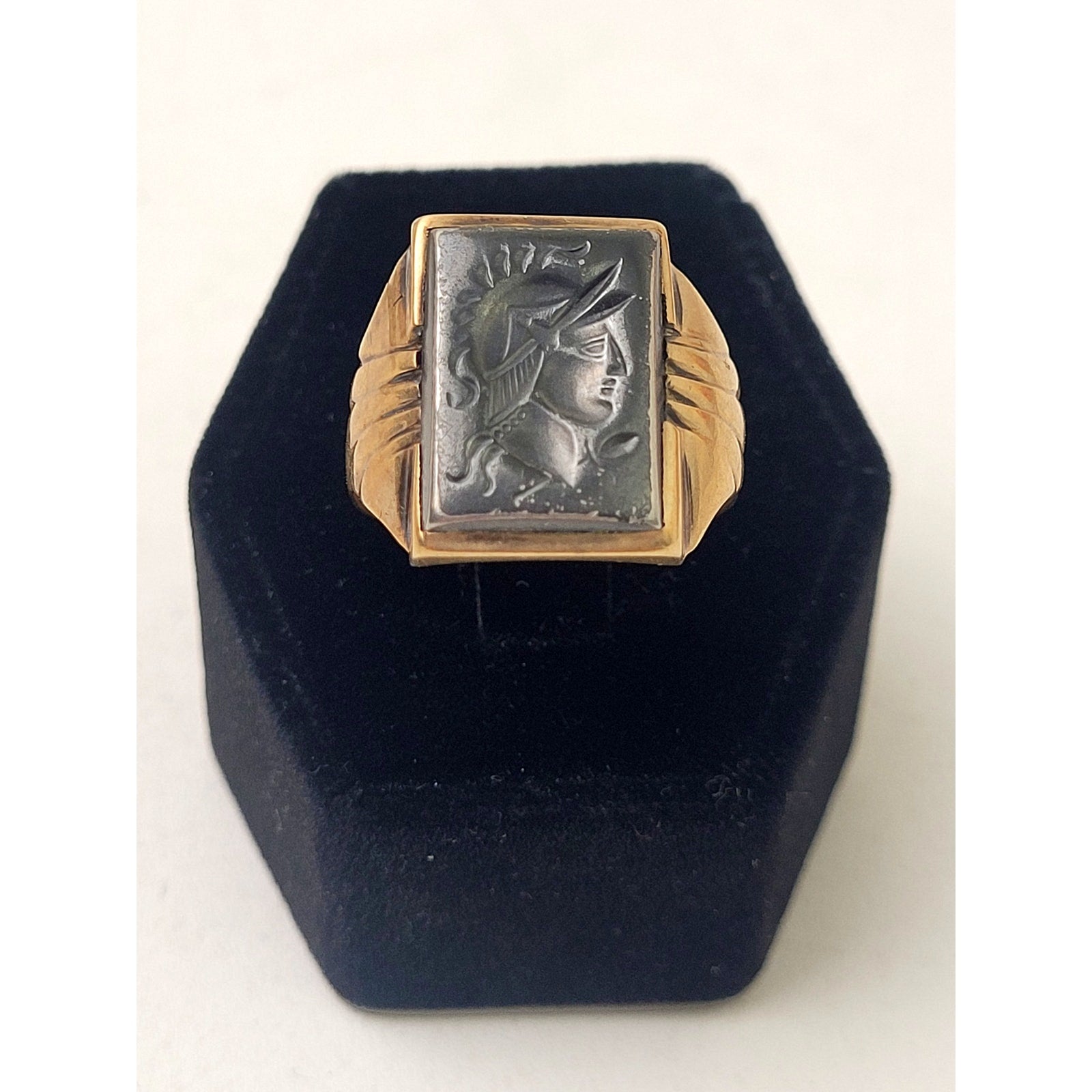 Vintage 14K Yellow Gold Men's Signet Ring Hematite Stone Soldier Sz 9 | 5.83 g