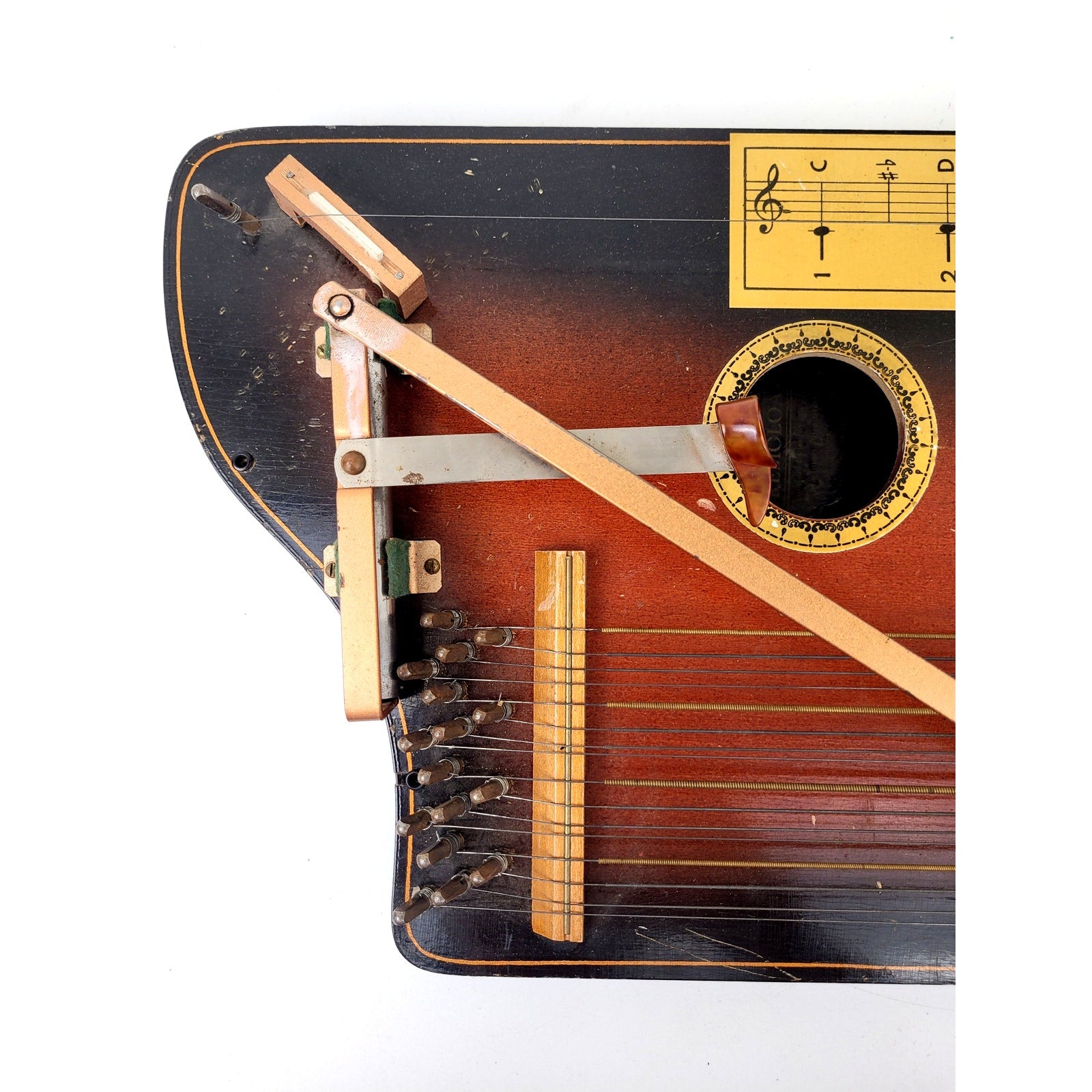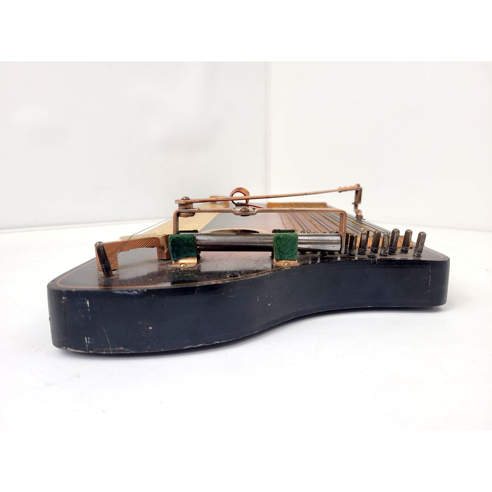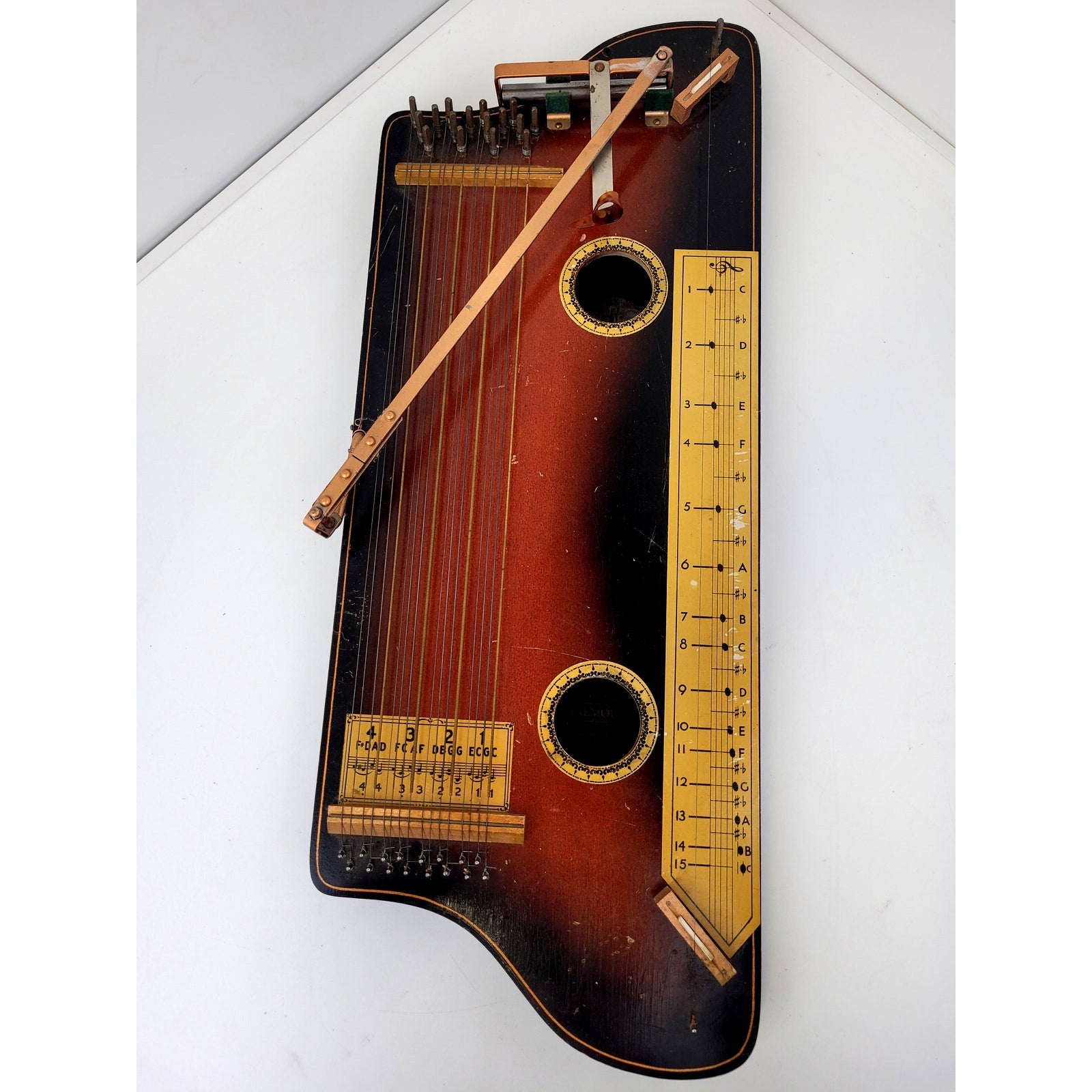 Featuring a fretless zither-style design, it uses a sliding brass arm over a melody string and strum-able chords to create that dreamy Hawaiian sound. These were originally sold door-to-door and marketed as easy-to-learn for home entertainment.