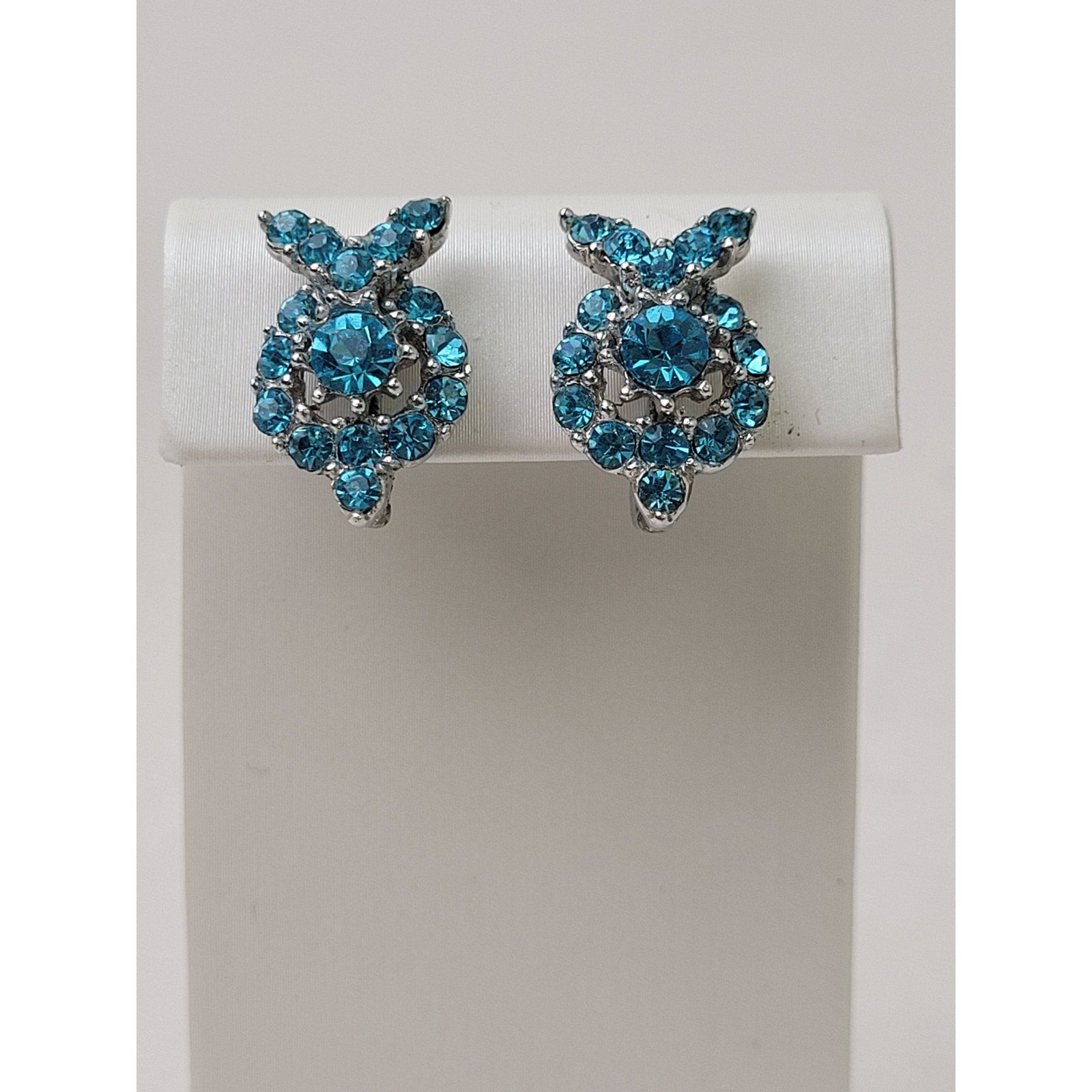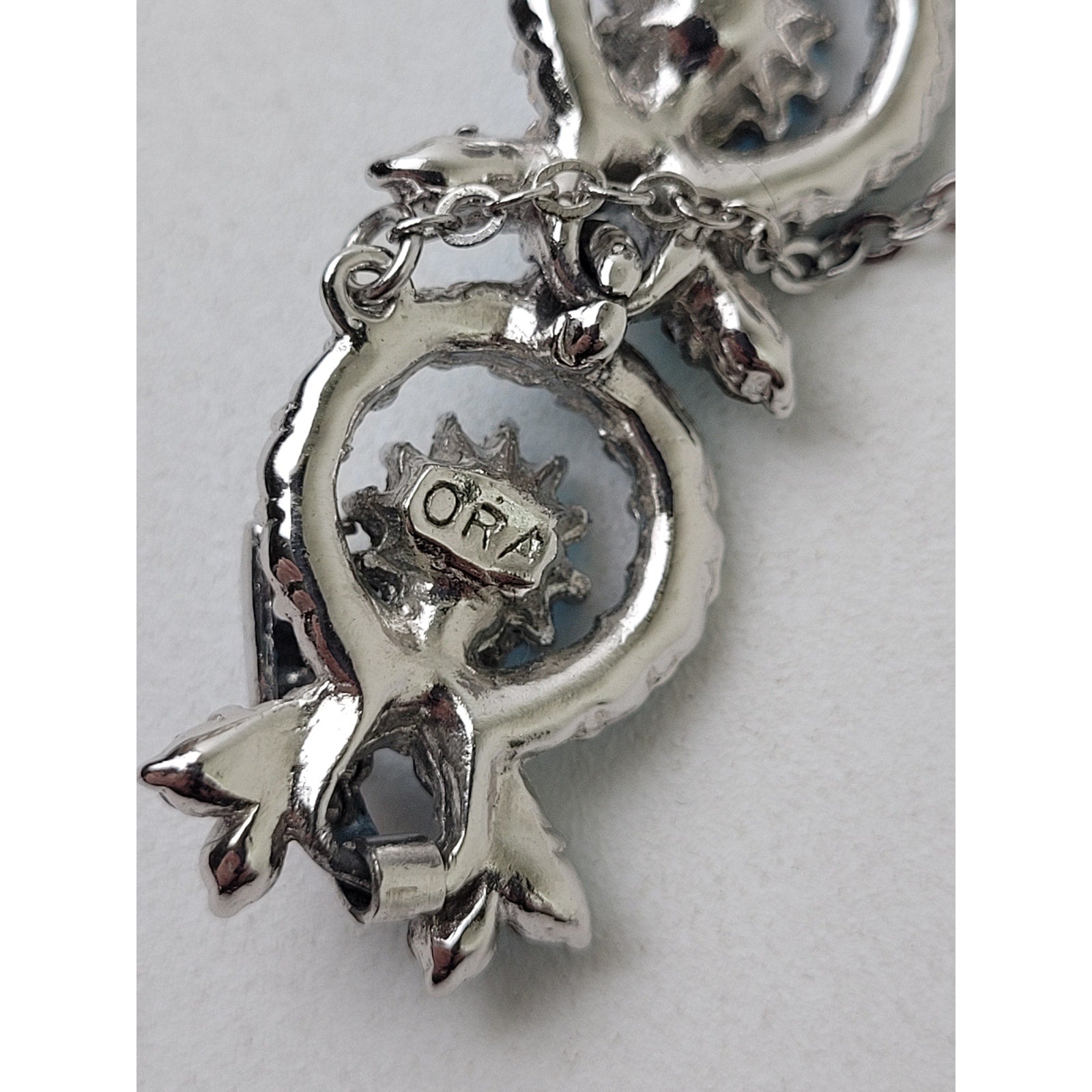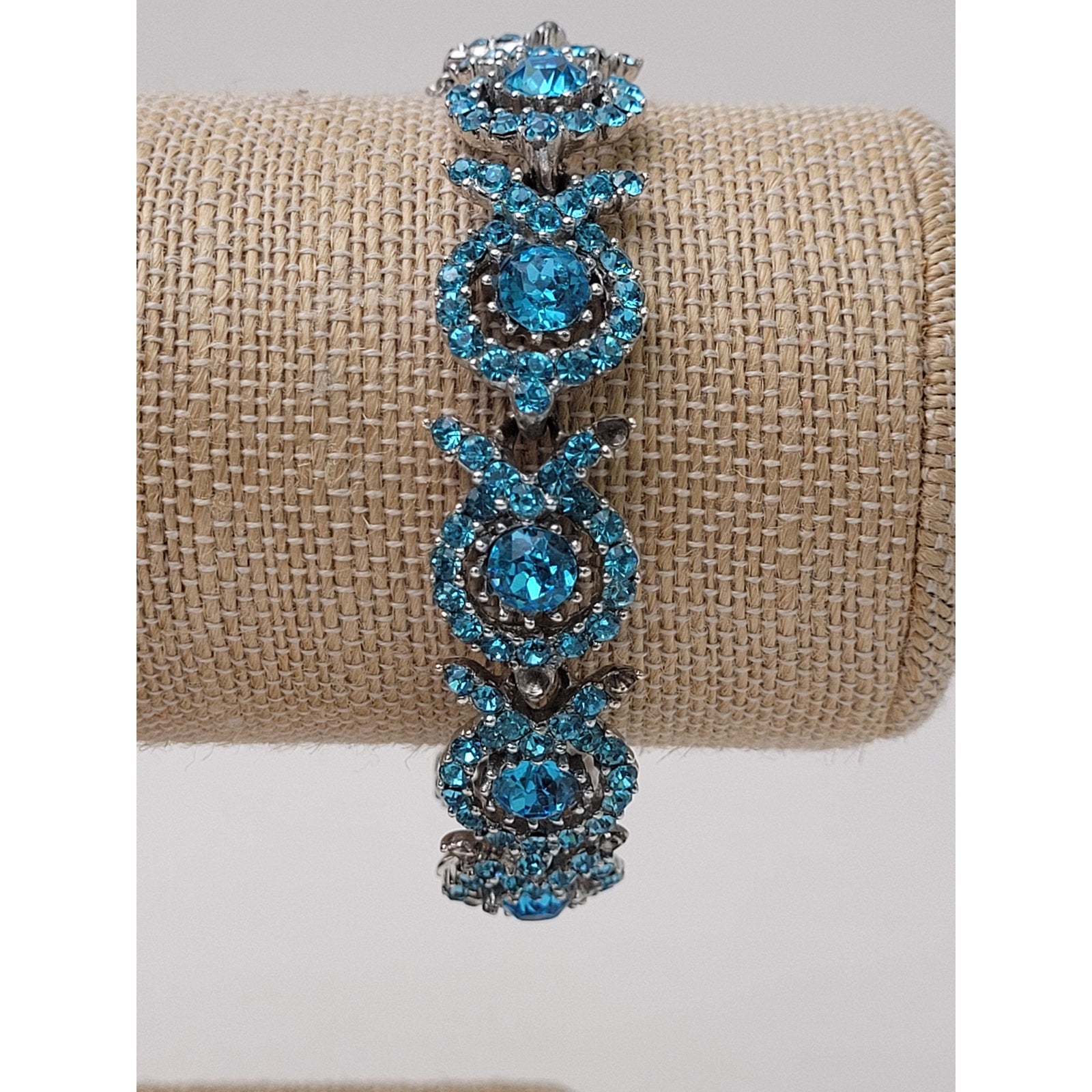 This stunning vintage ORA parure set is a gorgeous snapshot of 1950s jewelry craftsmanship at its most glamorous. Bright blue rhinestones are set in classic mid-century style across a matching necklace, bracelet, and clip-on earrings — a complete, coordinated set that drips with old-school elegance. A few rhinestones are missing, but additional replacement stones are included so you can restore this beauty to its original glory.