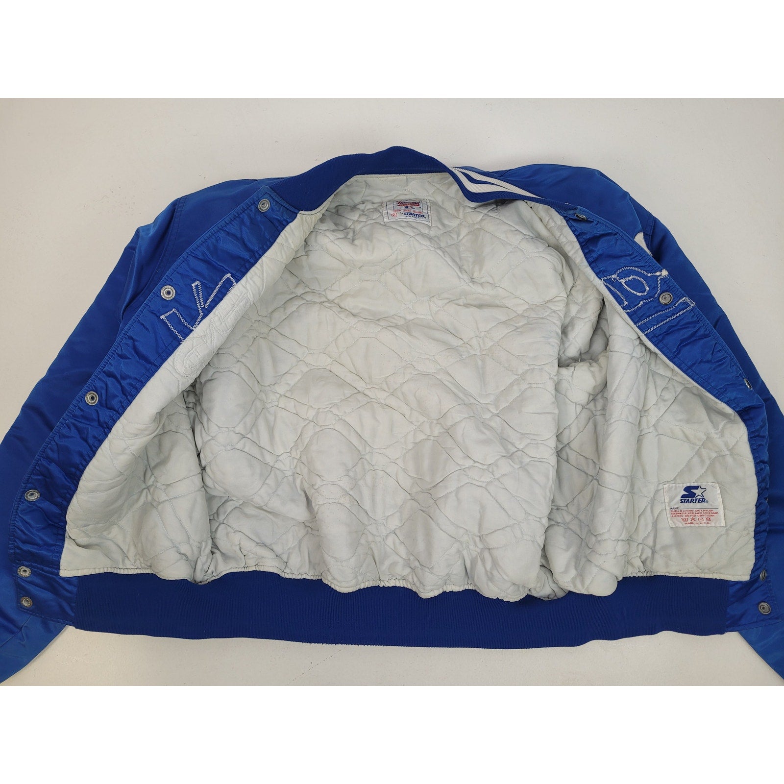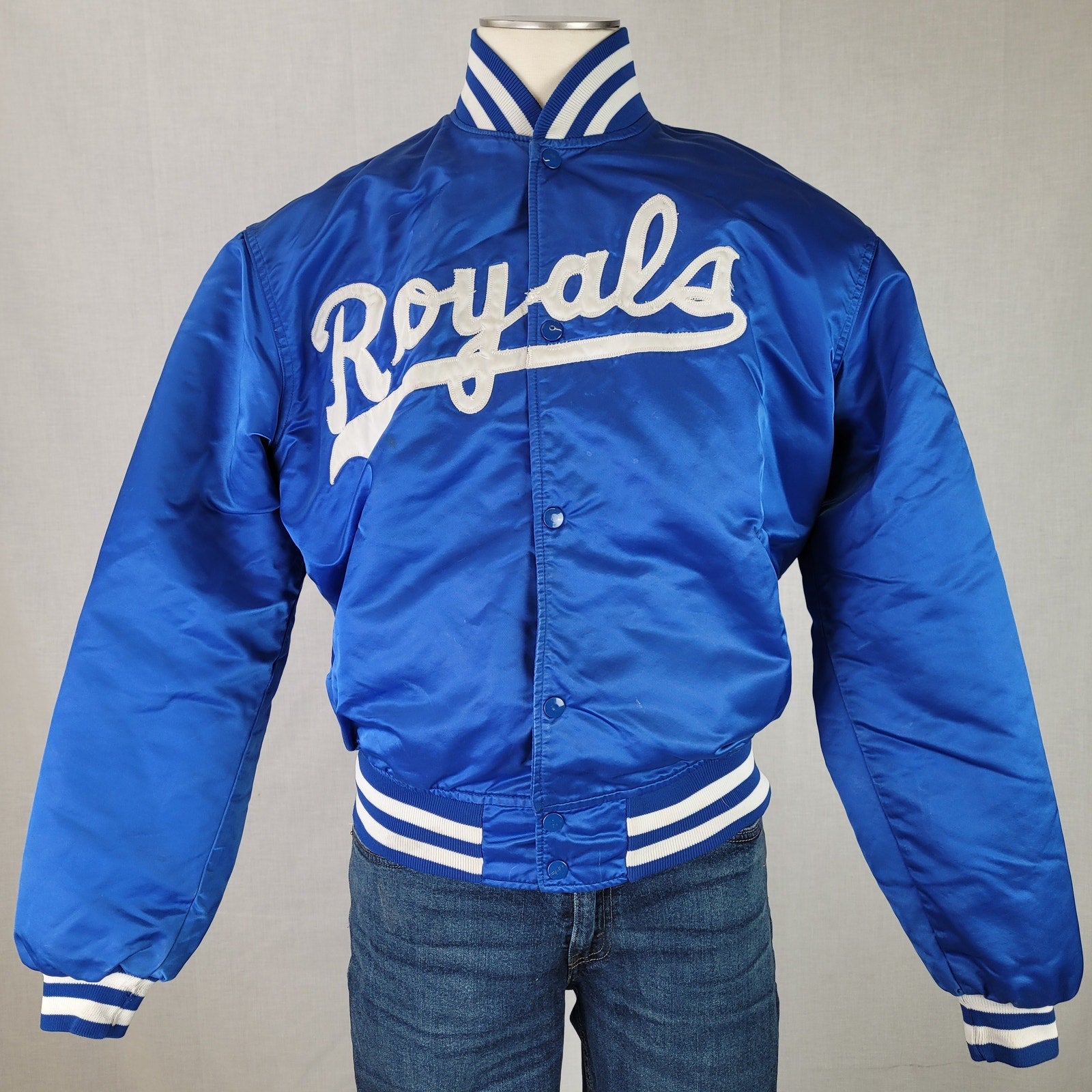 This Vintage Starter Kansas City Royals Satin Jacket in size XL is a rare find for fans of Major League Baseball in the 80s and 90s. Officially licensed by the MLB, this jacket showcases the iconic team logo of the Kansas City Royals in a classic blue color. Made in the United States, this jacket is a must-have for any baseball enthusiast looking to represent their favorite team in style.