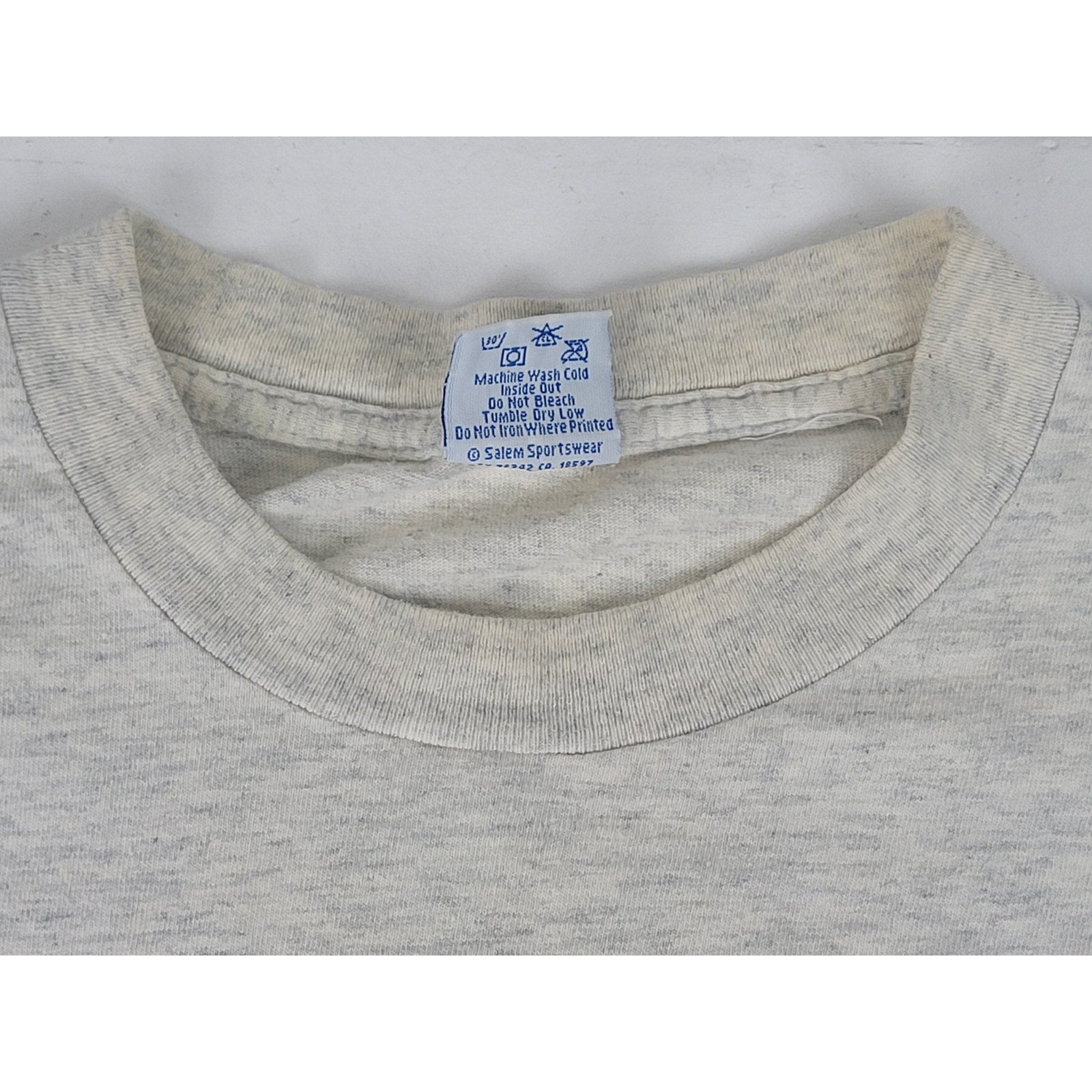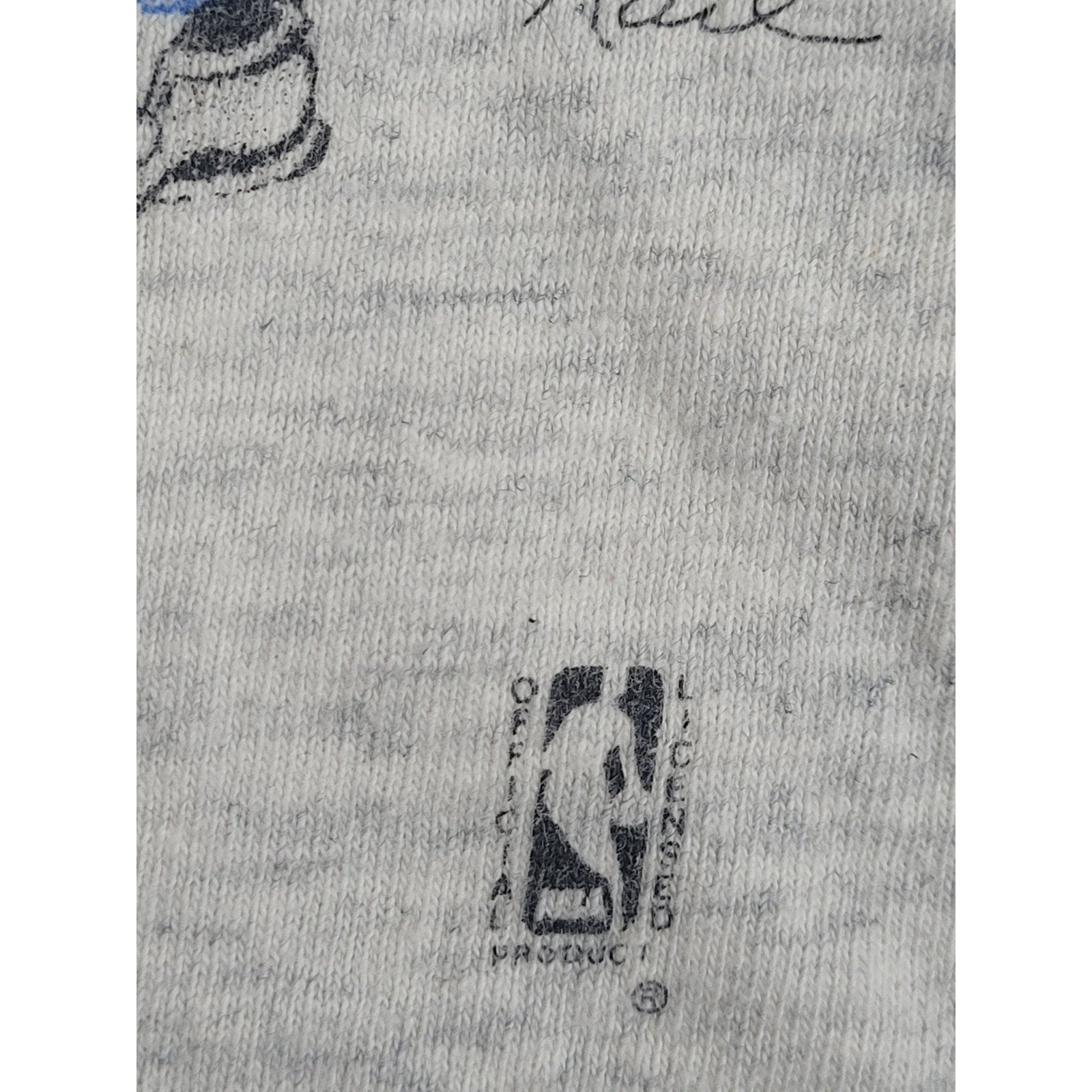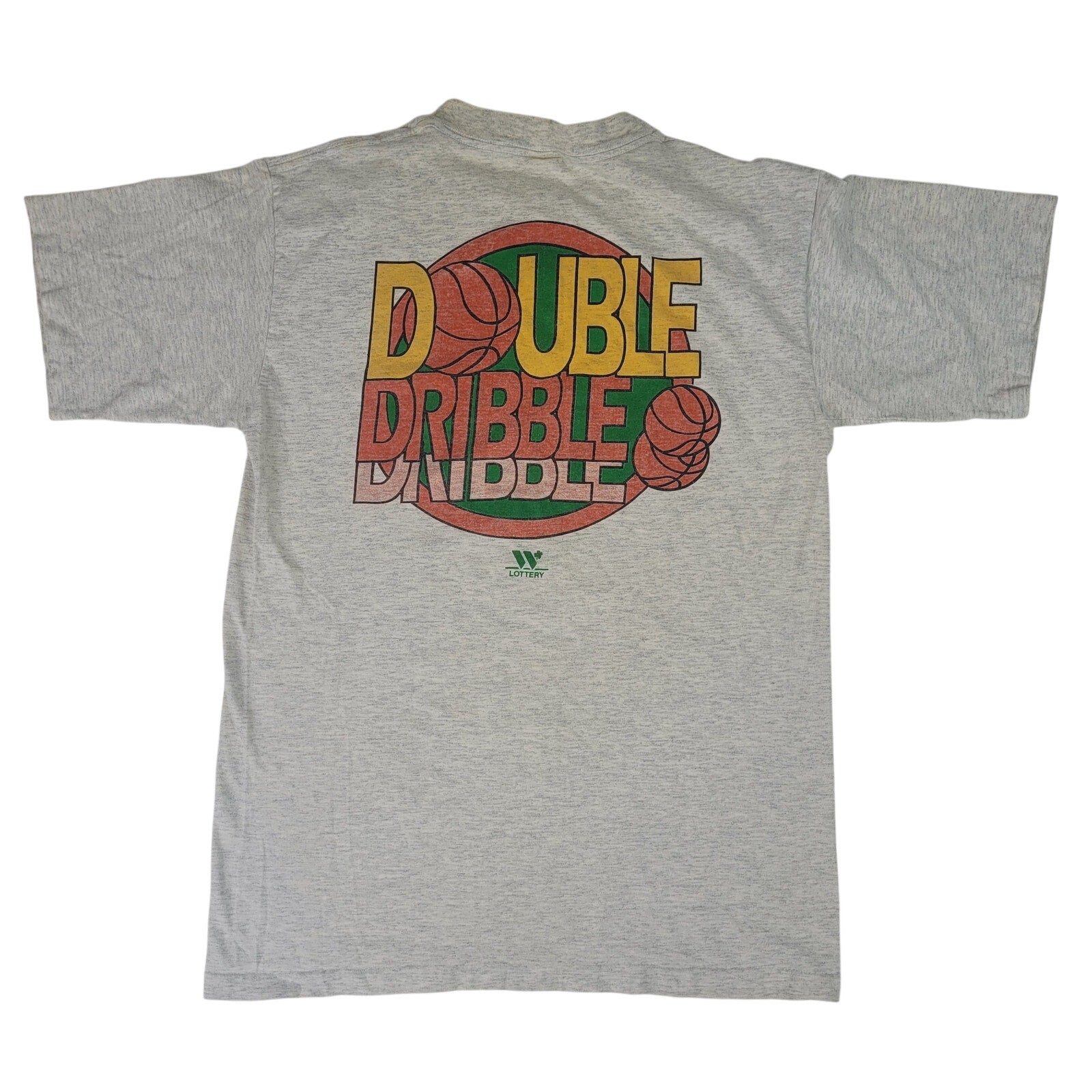 This single stitch t-shirt is light gray with a Seattle Supersonics caricature graphic on the front and the back has a Double Dribble Washington state lottery graphic. The front graphic includes George Karl, Shawn Kemp, Gary Payton, Eddie Johnson, Dana Barros, Derrick McKey, Nate McMillan, and Ricky Pierce putting the date on the shirt as the '91-'92 or '92-'93 season. It is 100% cotton, is crewneck, is shorts sleeve, and made in the USA. The size tag reads size Medium, but please reference measurements below.
