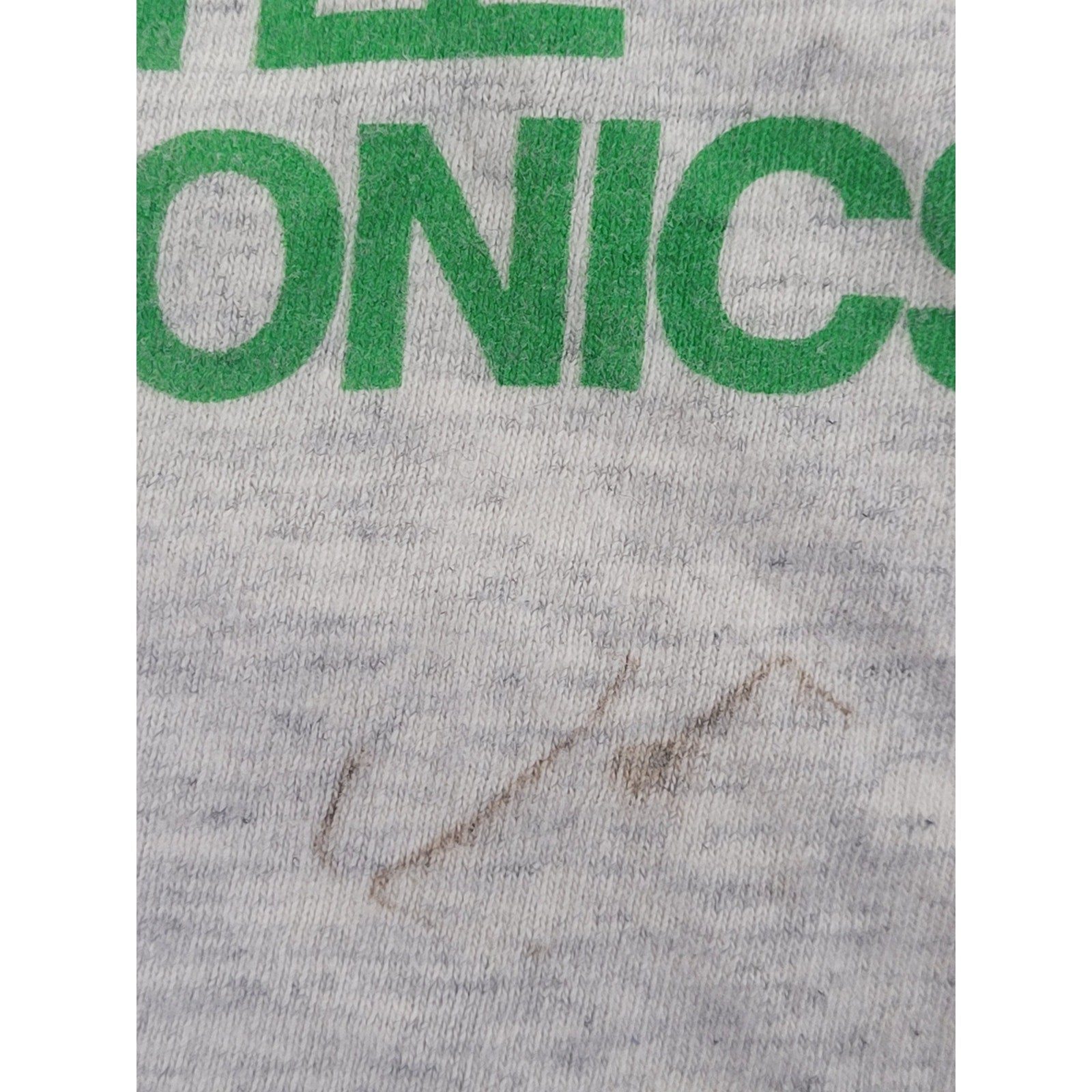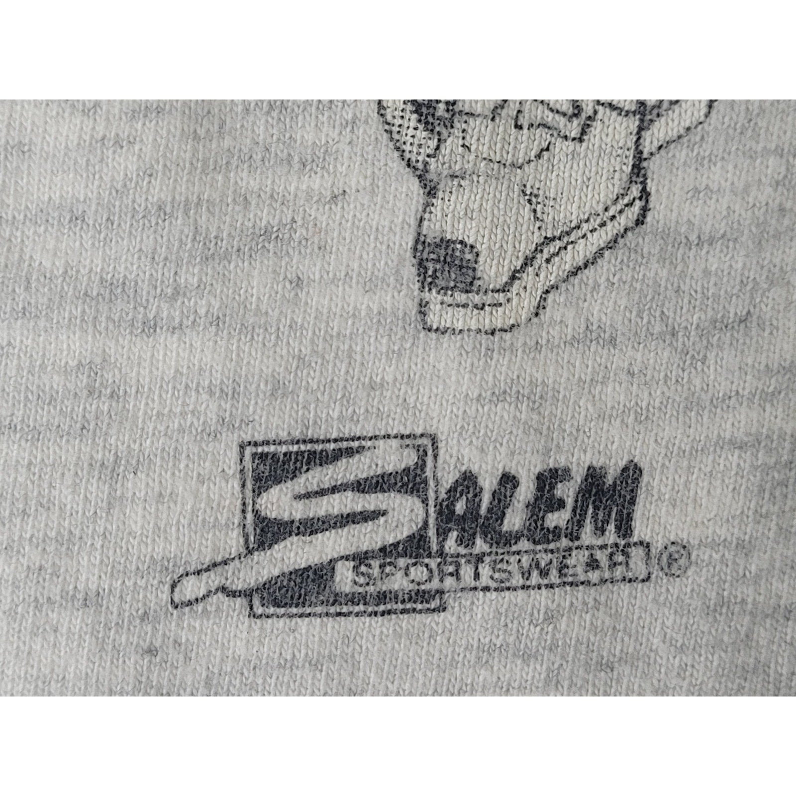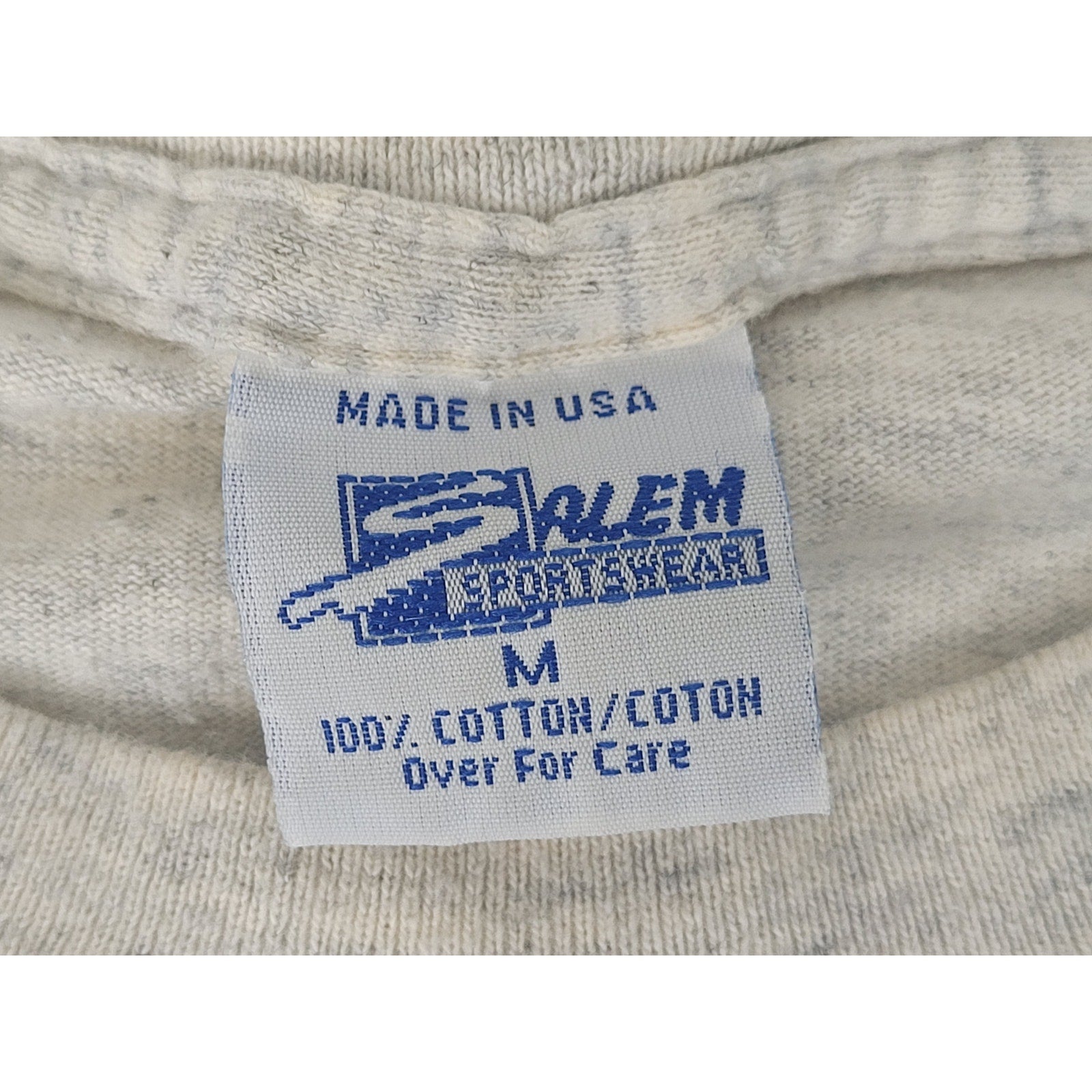 This single stitch t-shirt is light gray with a Seattle Supersonics caricature graphic on the front and the back has a Double Dribble Washington state lottery graphic. The front graphic includes George Karl, Shawn Kemp, Gary Payton, Eddie Johnson, Dana Barros, Derrick McKey, Nate McMillan, and Ricky Pierce putting the date on the shirt as the '91-'92 or '92-'93 season. It is 100% cotton, is crewneck, is shorts sleeve, and made in the USA. The size tag reads size Medium, but please reference measurements below.