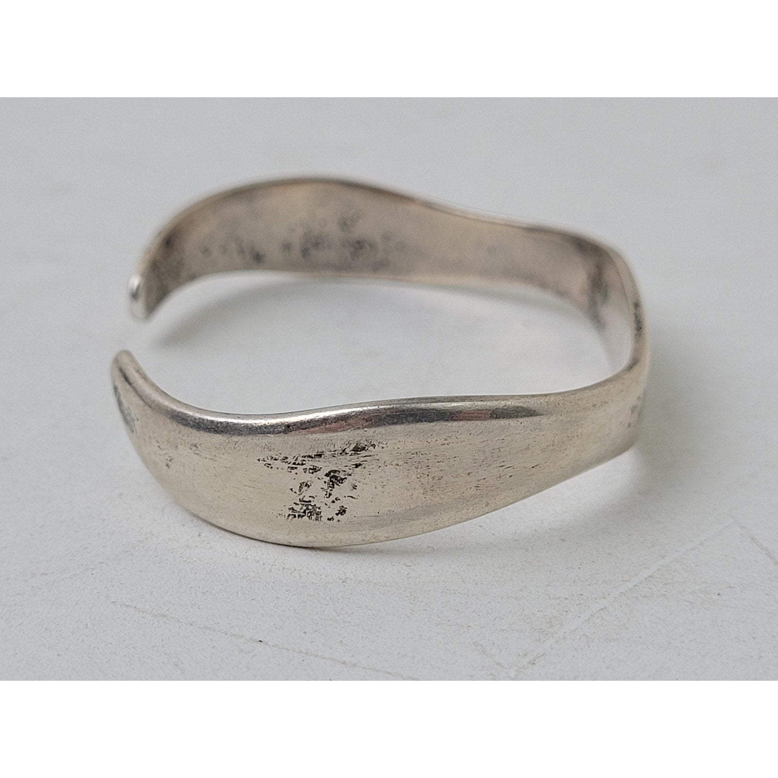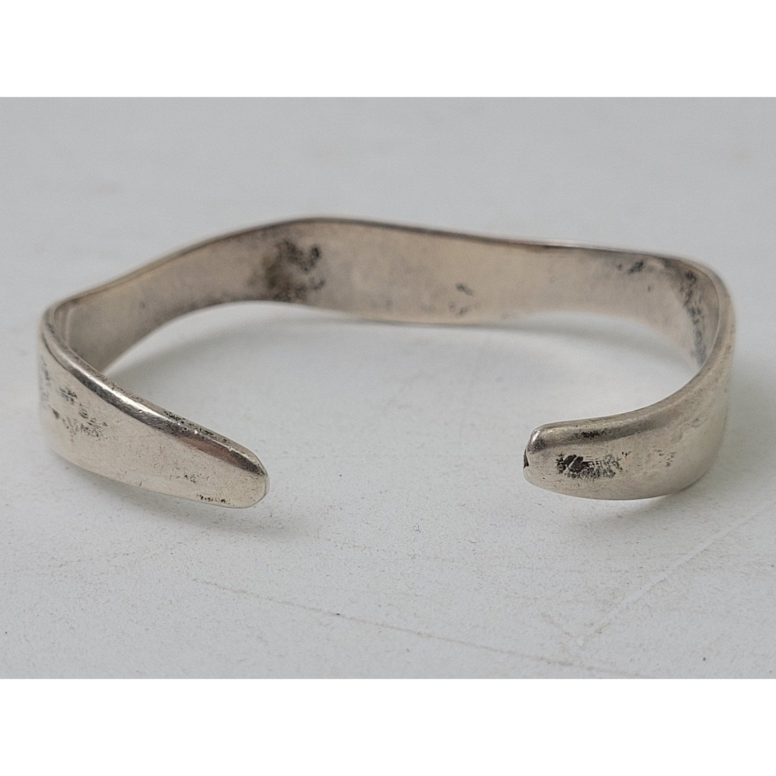 This classic bracelet features a simple wave-shaped curved band. It is marked with 925 and Mexico on the interior. The bracelet can be adjusted to fit a variety of wrist sizes by bending the metal. It currently measures 7 1/4" full circumference.