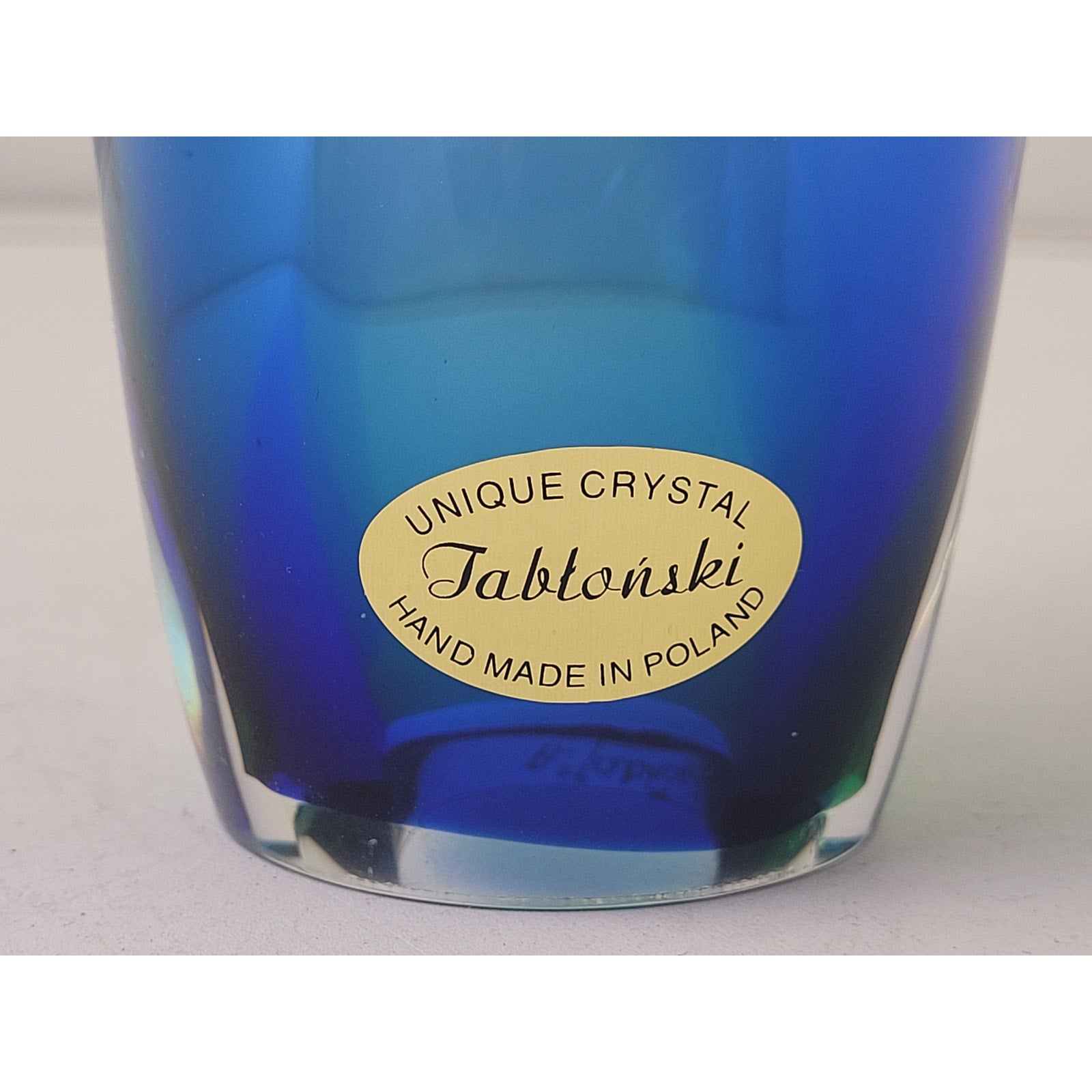 Made in Poland, likely during the 1990s, this beautiful lead crystal vase is crafted from hand-blown lead glass. The design features a sculptural, organic shape with a ruffled rim and pulled details. The colors transition from a deep blue at the base to an aquamarine and green tones near the top. The piece is signed by Jablonski at the bottom. No known chips or cracks in this beauty. It measures 12" tall x 6 1/2" wide.