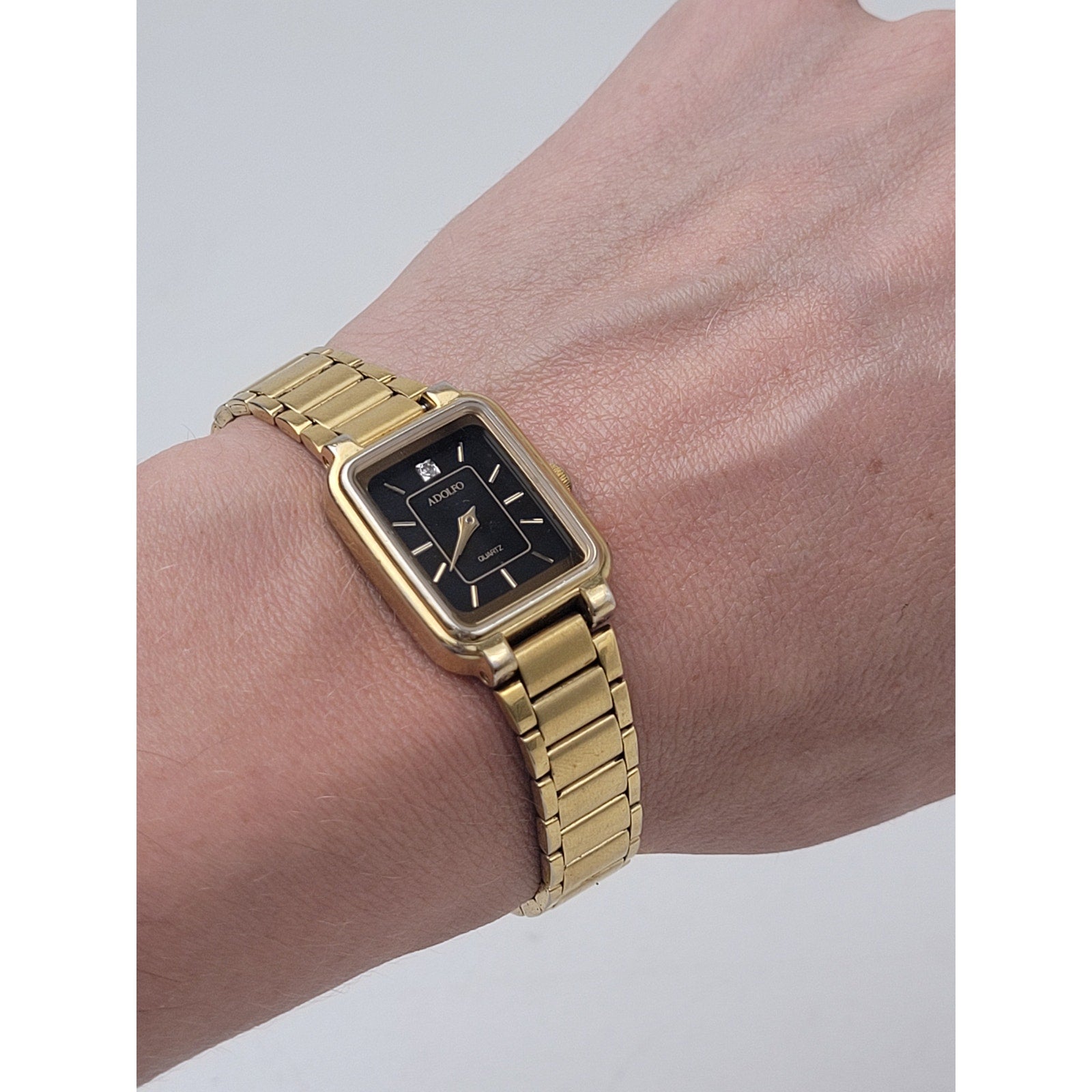 This vintage Adolfo women's watch is a stylish and timeless piece. With its gold-tone finish and quartz movement, it exudes elegance. The watch features a stainless steel back and a base metal bezel, ensuring durability and a touch of sophistication. Perfect for adding a touch of vintage charm to any outfit.