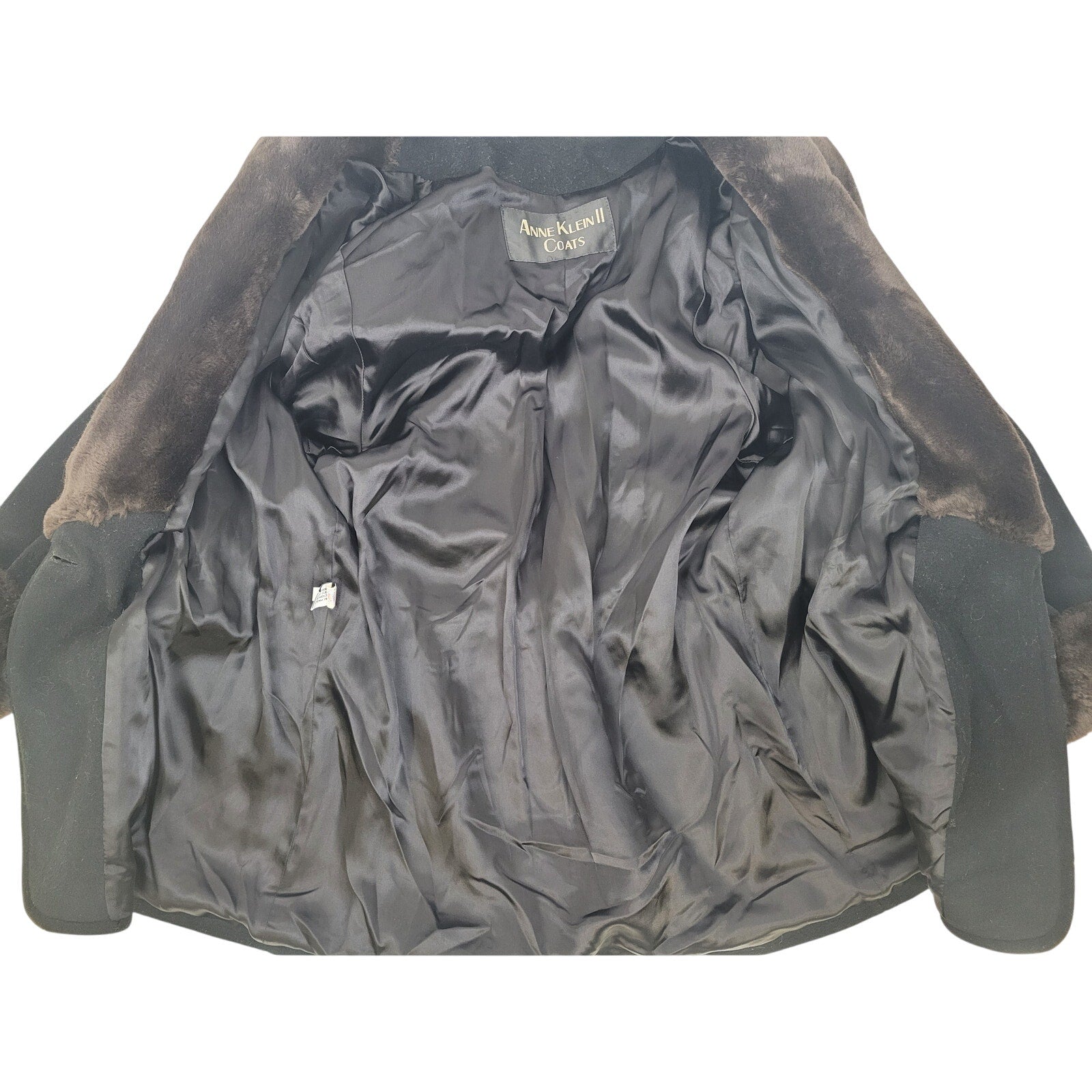 Vintage Anne Klein II Black Wool Faux Fur Trim Coat Women's Sz M