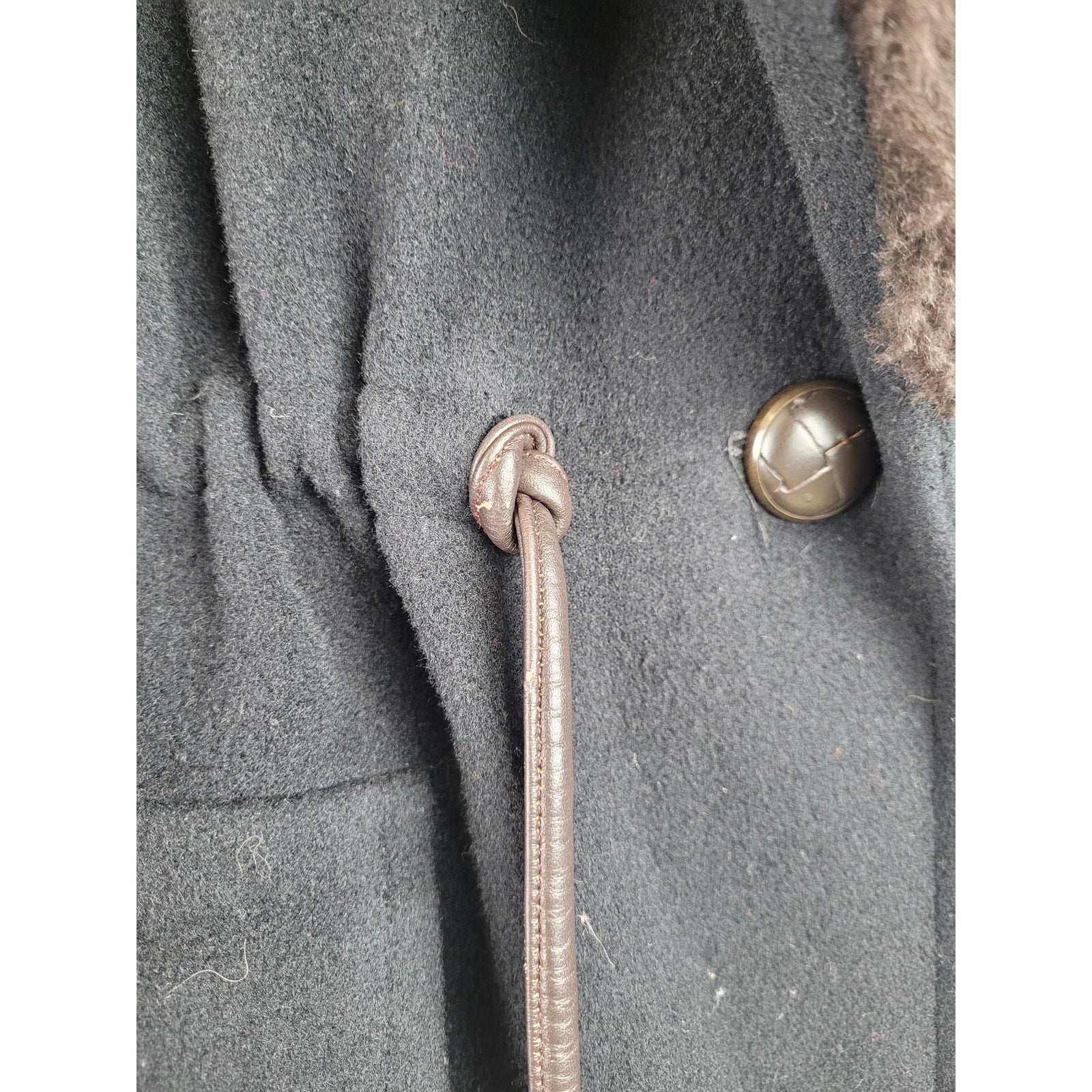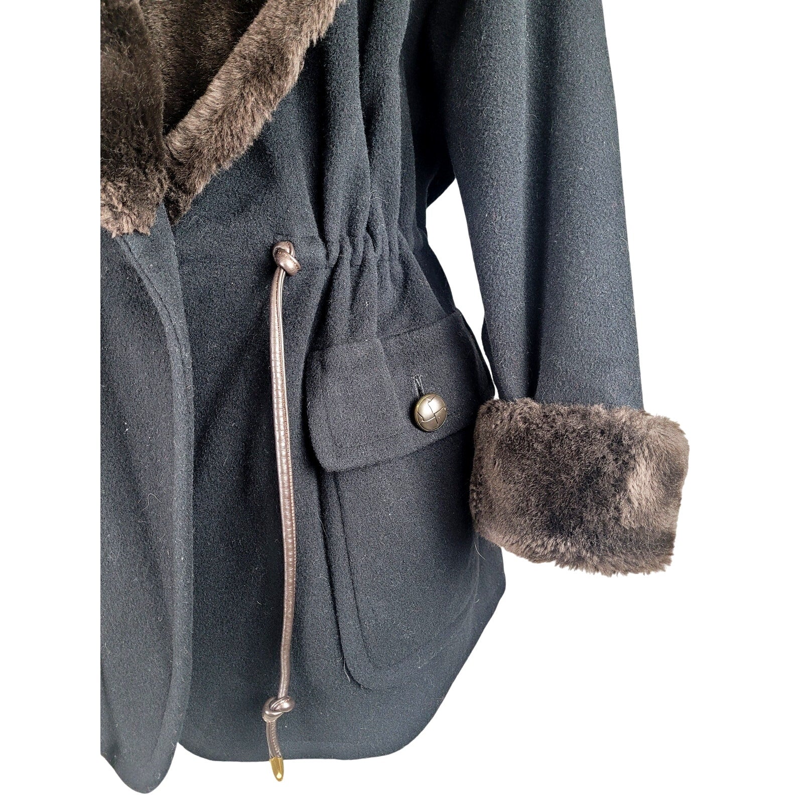 Gorgeous 1980s wool jacket with faux fur collar and cuffs. The waistline is belted with a brown leather adjustable belt to cinch in the waist and create a flattering hourglass silhouette.