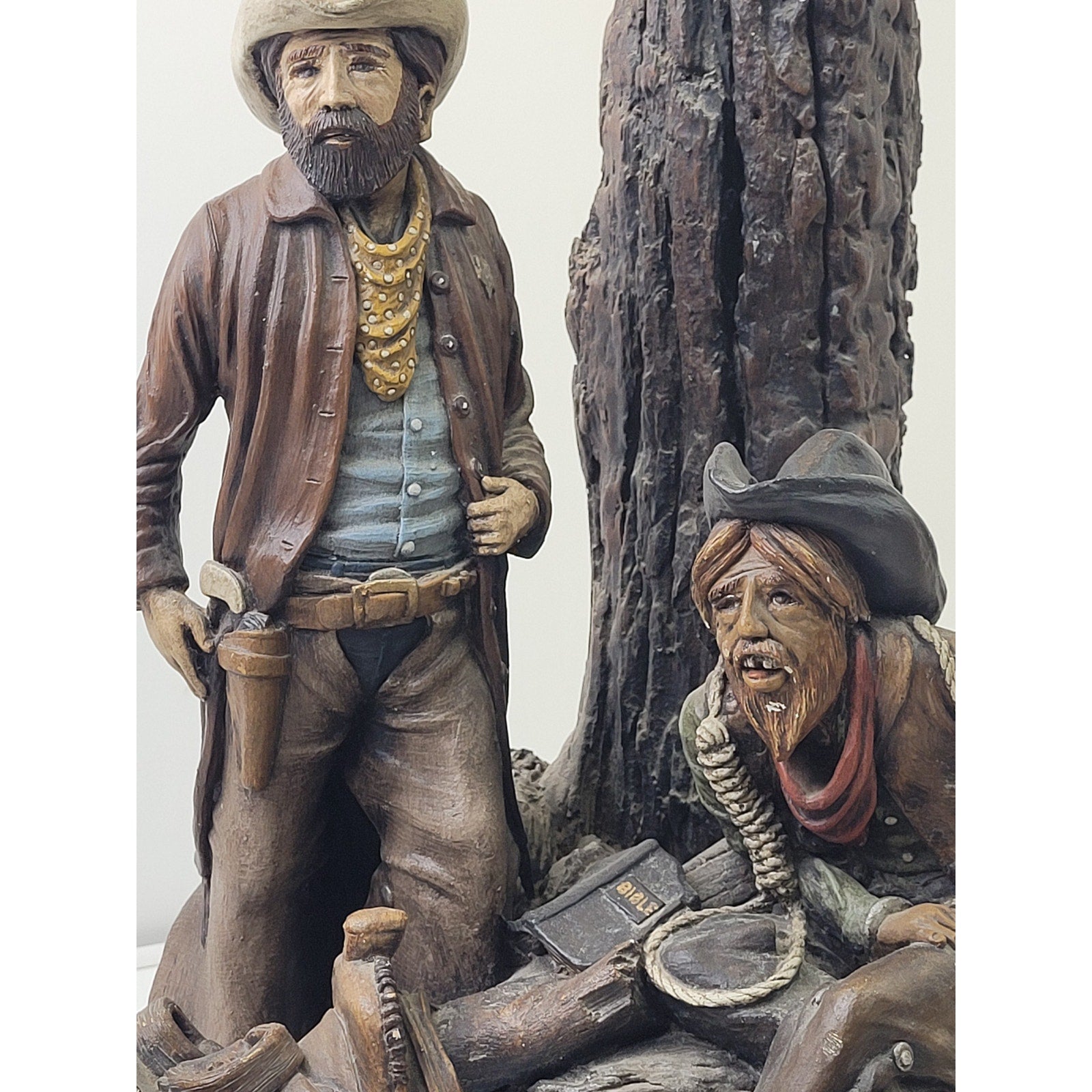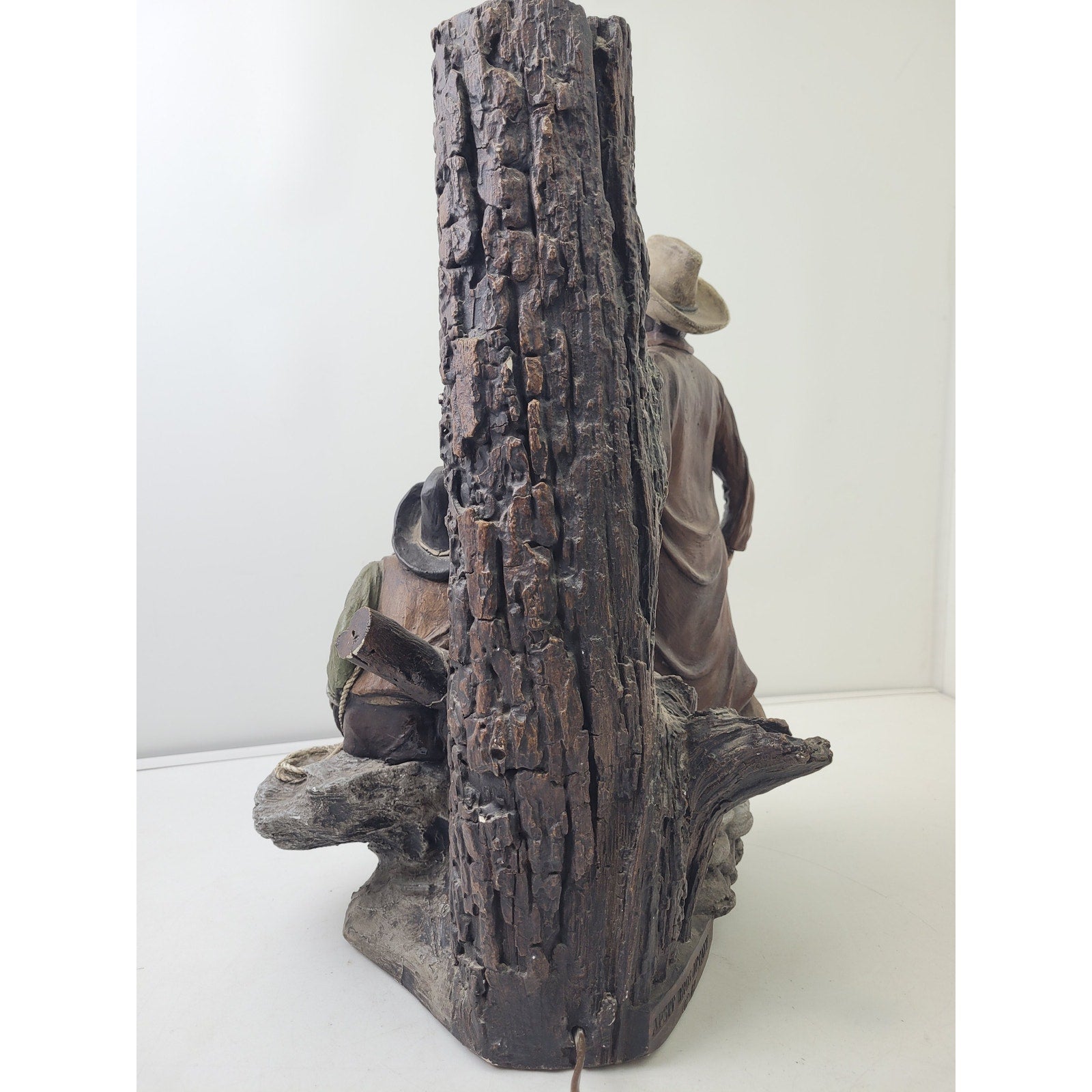 This funky lamp is made of chalkware, or plastic statuary, and is hand-painted. It was produced by the Apsit Brothers of California around 1982. This design, sometimes titled "Texas Rustlers," features two cowboy figures, one standing and one seated. This lamp comes with its original shade. It measures 28" x 13" x 13".