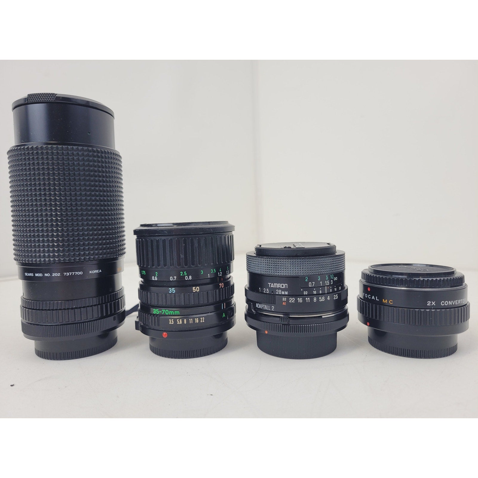 Capture timeless memories with this vintage Canon T70 film camera! This kit includes the camera body, four lenses to suit various shooting scenarios, and a flash for perfect lighting in any situation. A fantastic find for photography enthusiasts and collectors alike! Get ready to explore the art of film photography with this complete and well-preserved set.