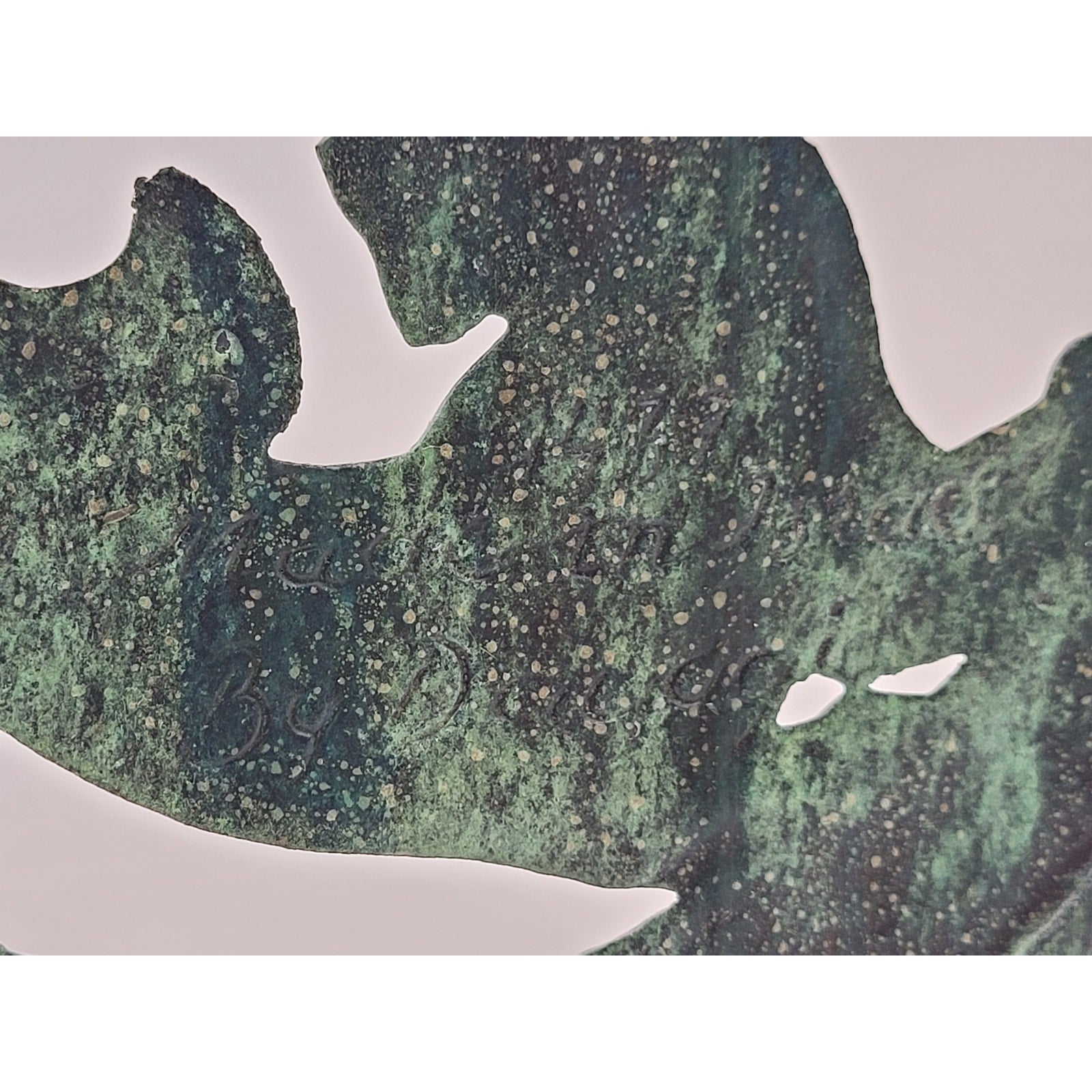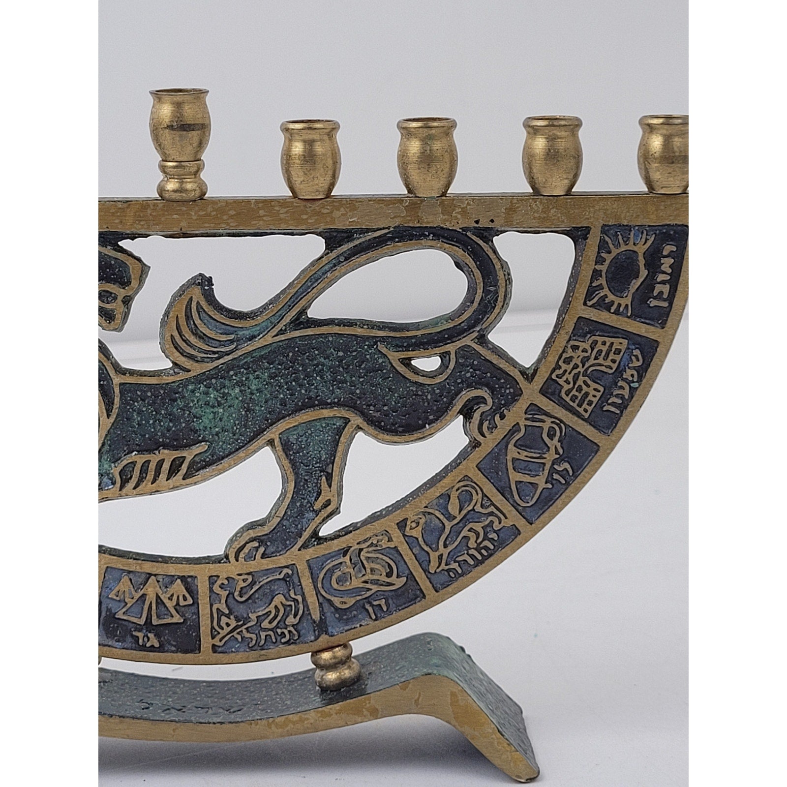 The product is a vintage Israel Dayagi brass Menorah adorned with verdigris enamel, featuring the Lion of Judah and representing the 12 tribes of Israel. This collectible item was made in Israel. The intricate design and craftsmanship of this Menorah make it a unique and meaningful piece. It is signed on the back.