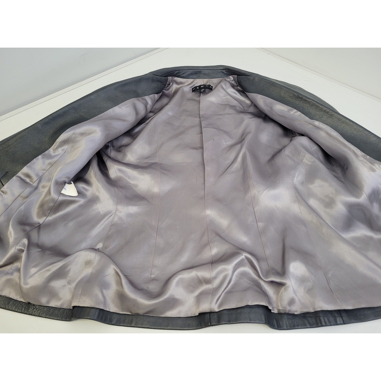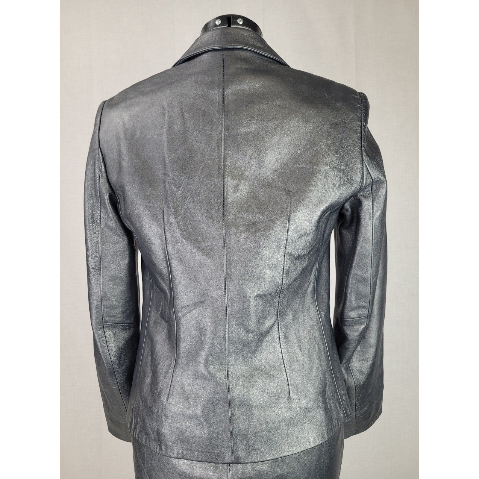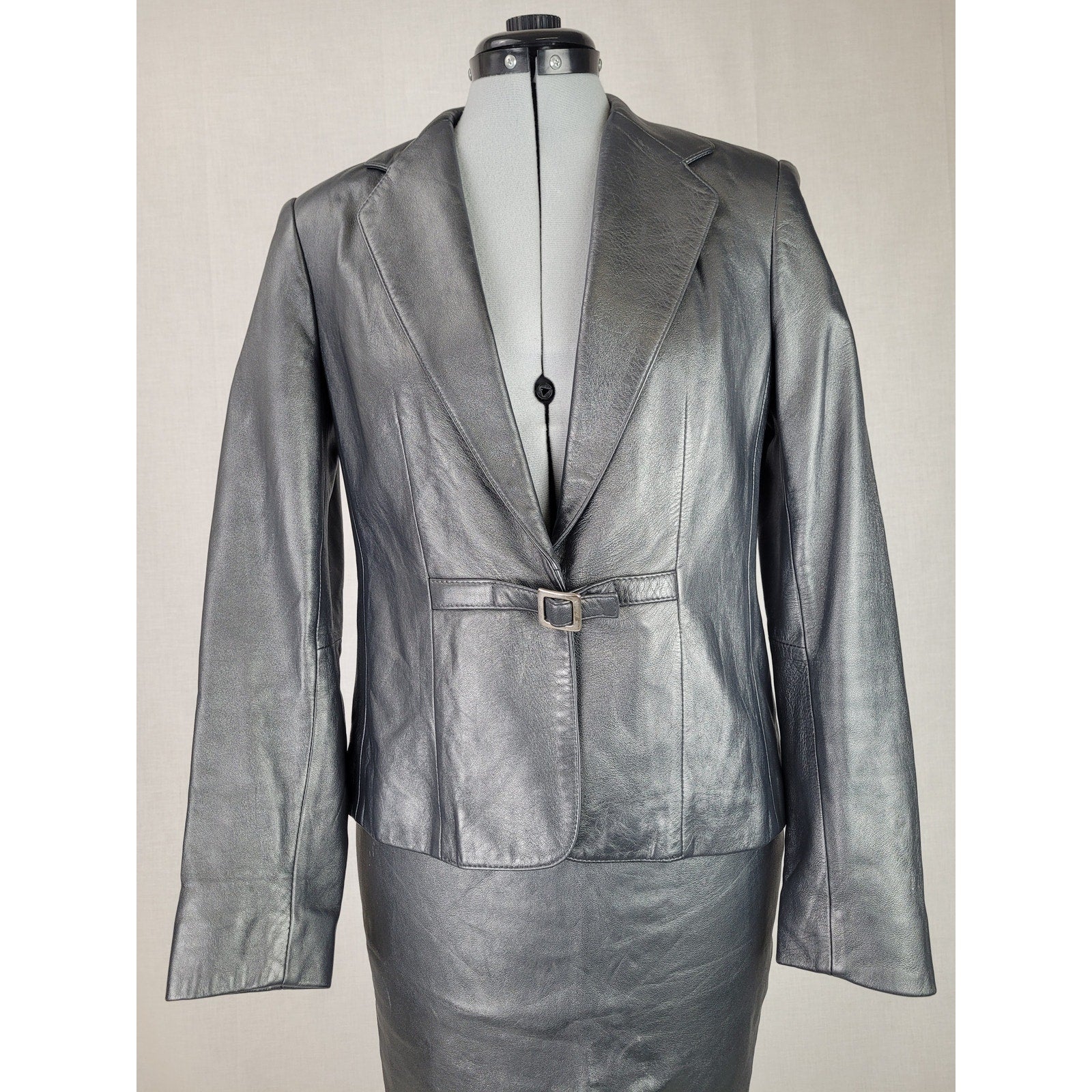 Professional yet funky two-piece skirt suit. Dress it up for a night dancing or keep it all business with a tailored shirt and kitten heels. In good vintage condition. The skirt has a few marks in the leather on the right side. Please reference photos and measurements for condition and fit.