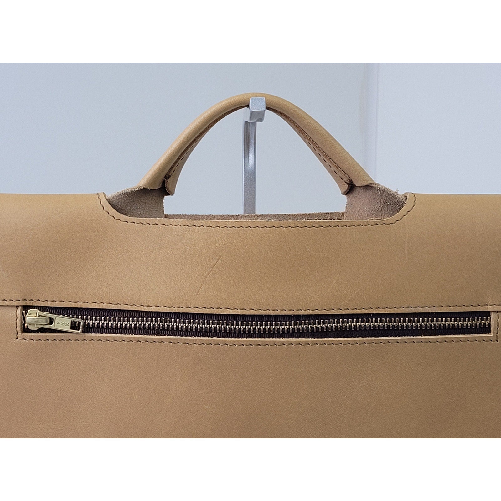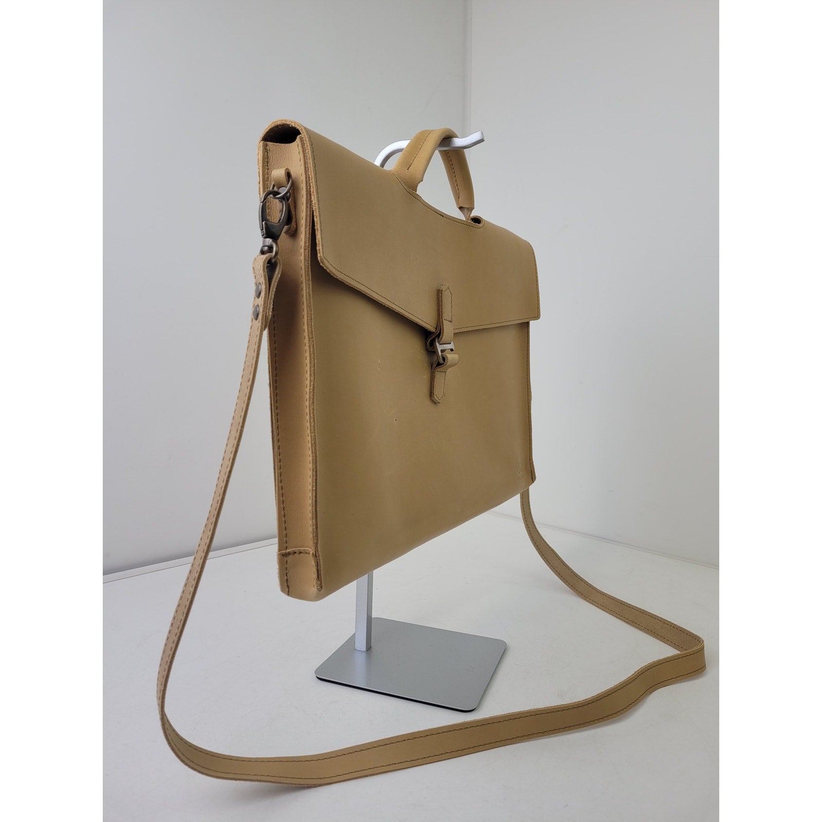 Quality briefcase with a beautiful tone of leather and silver hardware. The leather is in great condition. There are a few minor puncture marks on the front, but otherwise, the bag appears like new. The crossbody strap can be removed if you would prefer to simply use the top handle. A great find!