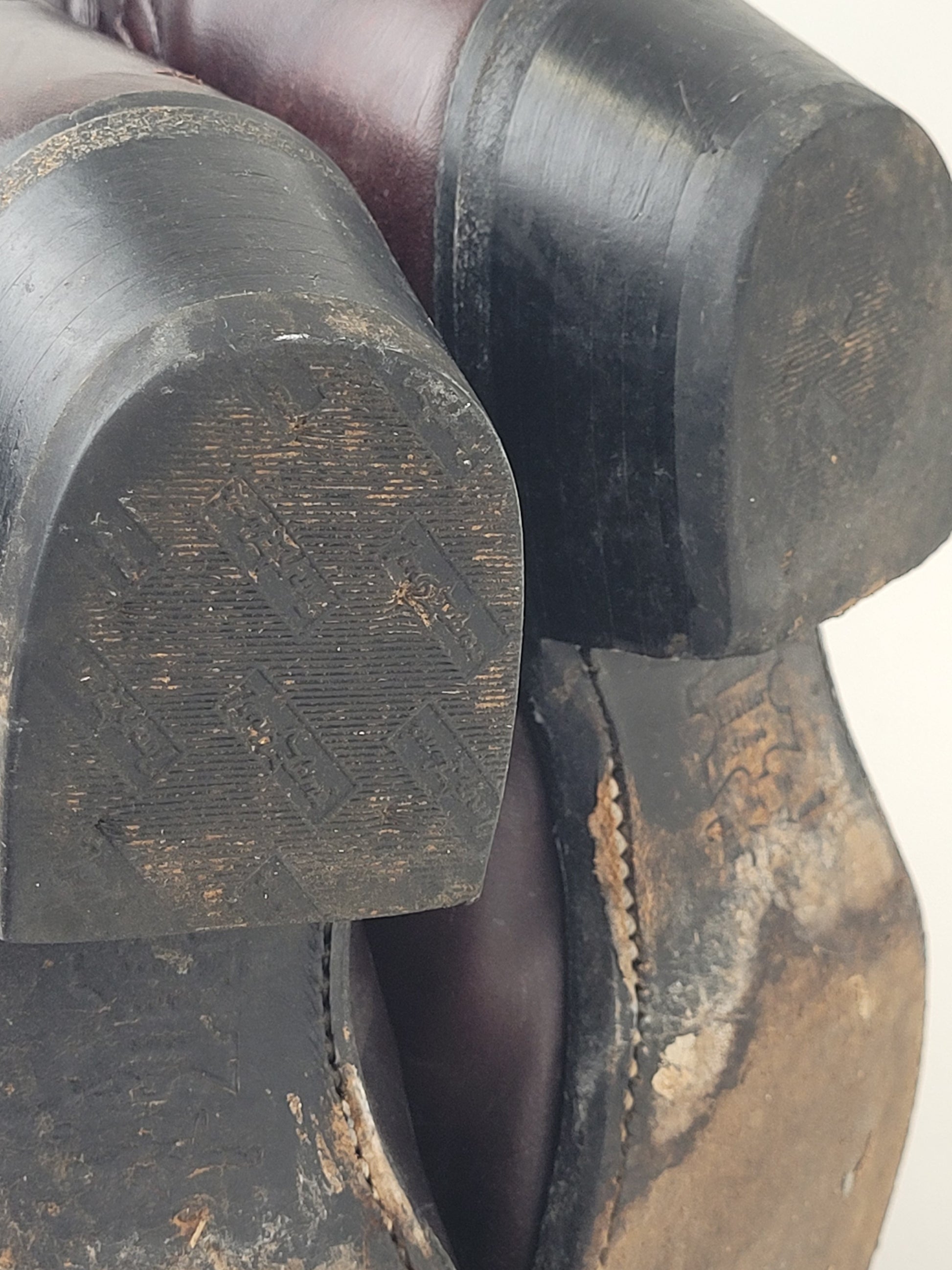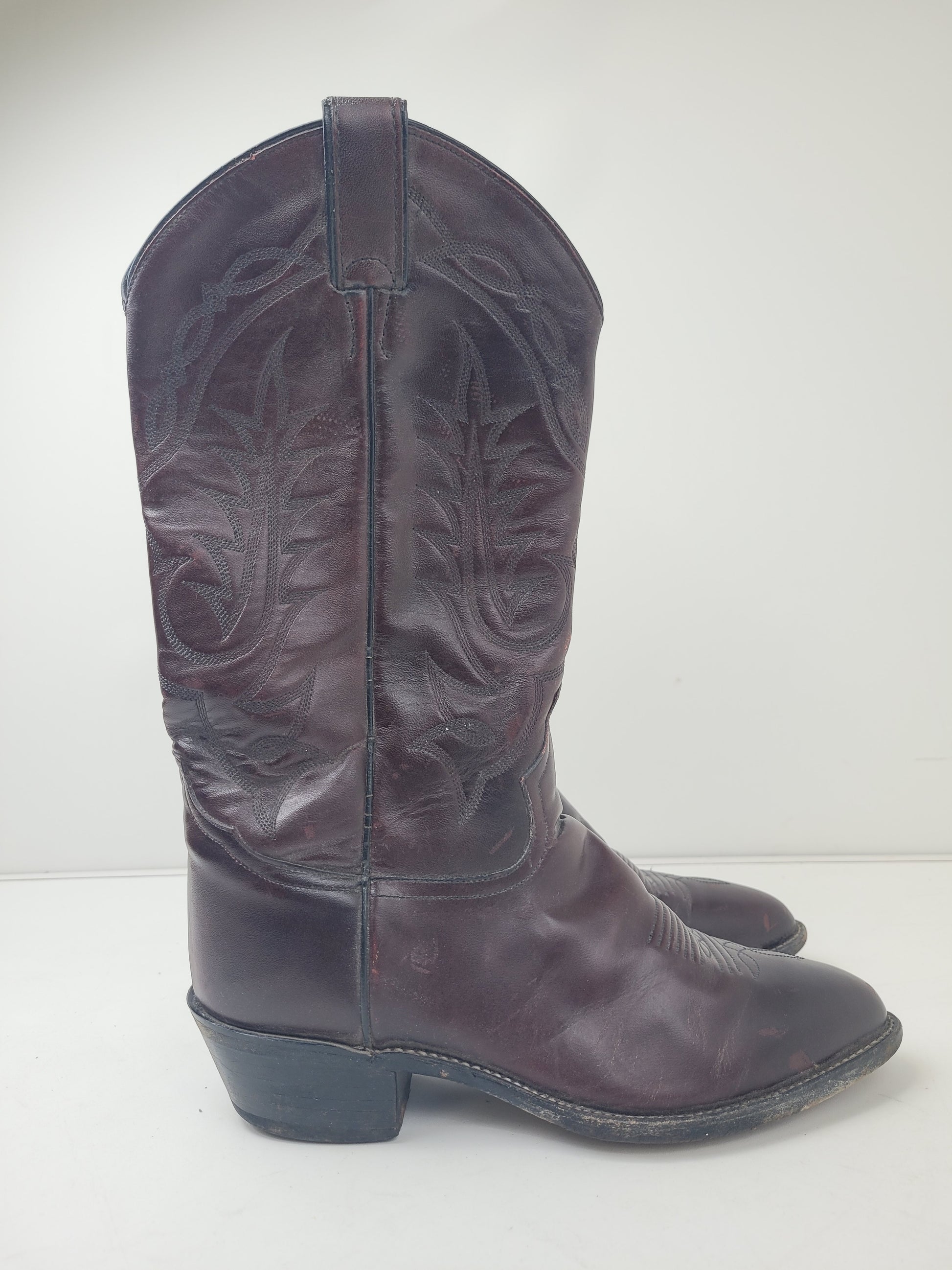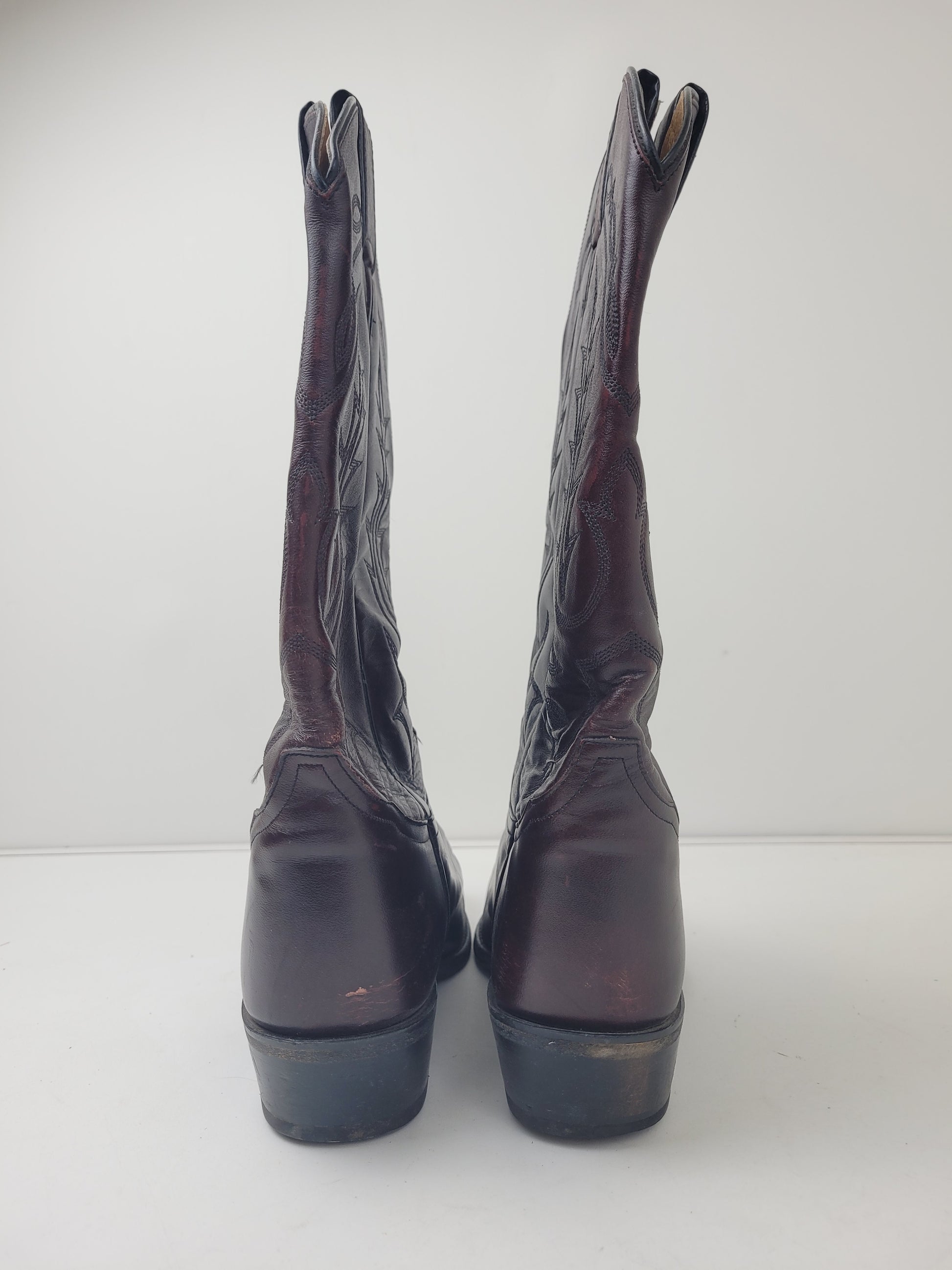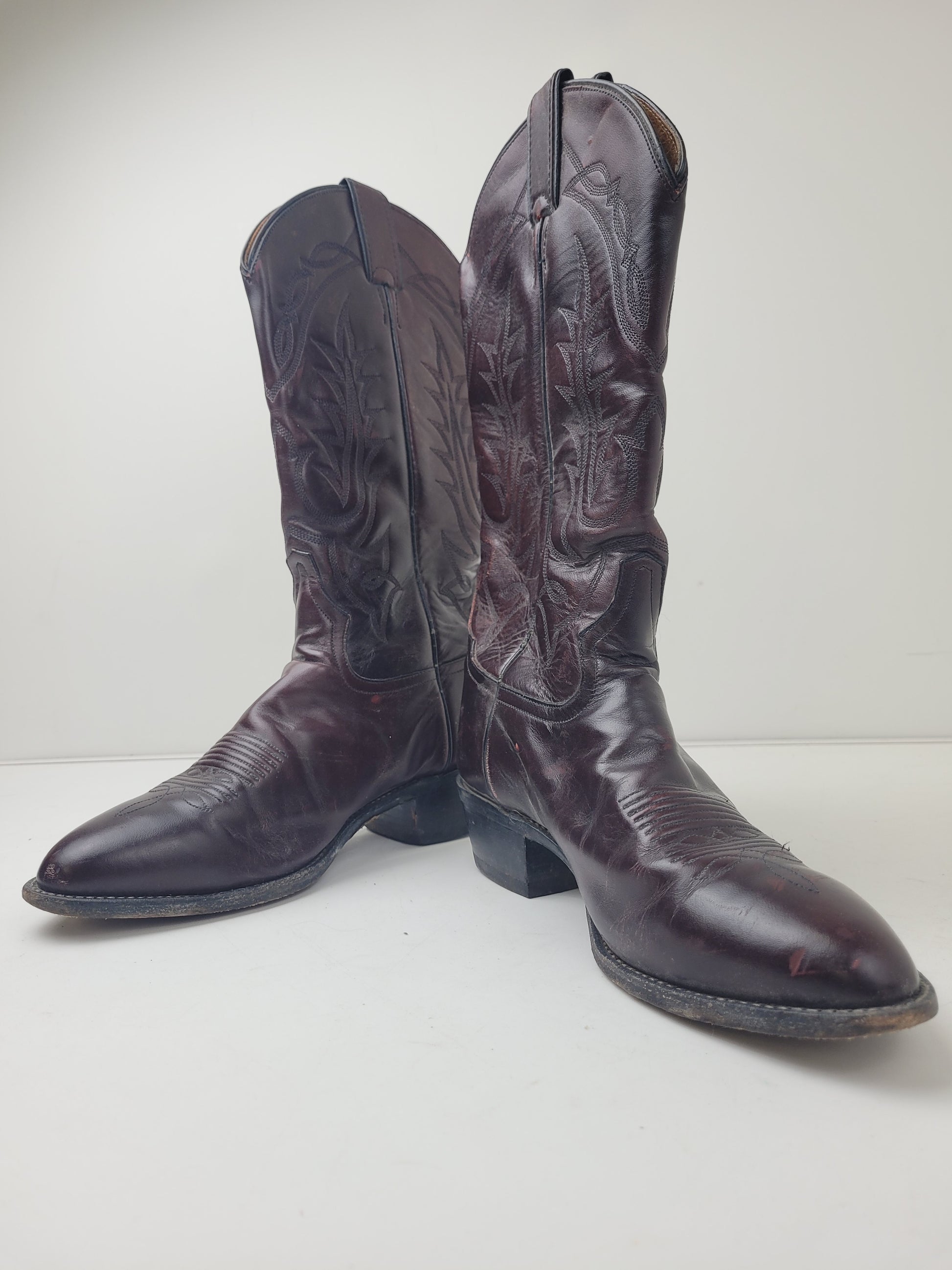 Quality pair of vintage Tony Lama boots in a men's size 7.5 EE and a women's size 9. Premium leather construction in the boot's upper, insoles, and soles. The color is a burgundy brown.