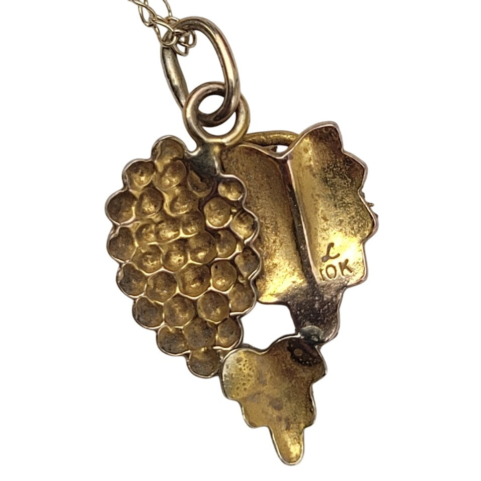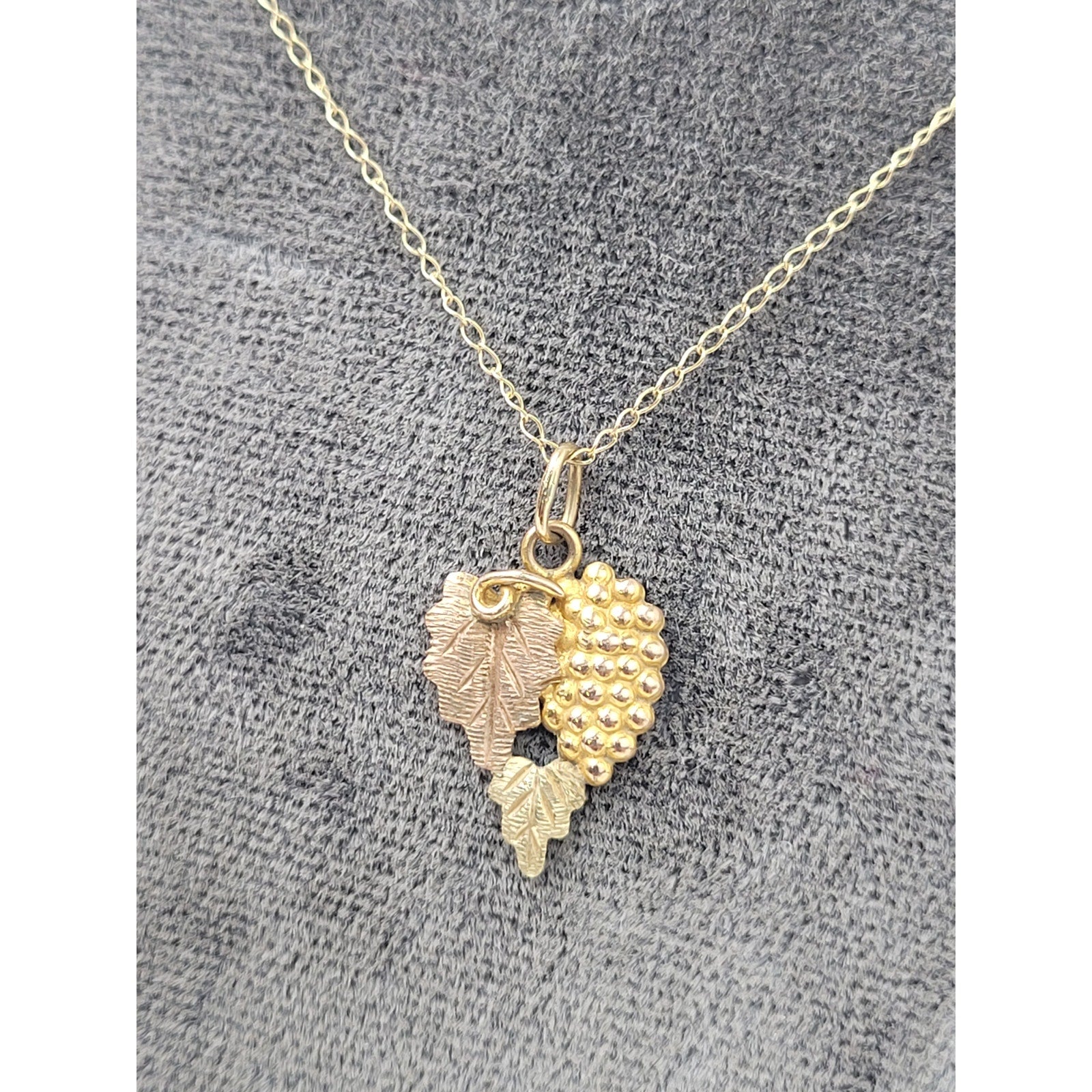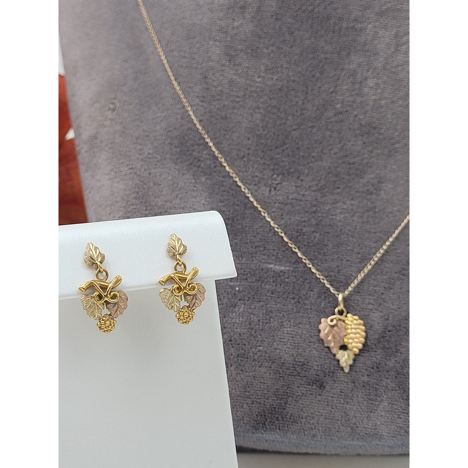 This is a beautiful vintage 10K yellow and rose gold earring and necklace set (the chain reads 14K gold). The set weighs 2.61 grams and features delicate yellow and rose gold leaves forming a charming grape cluster design. The dainty and dangling earrings add a touch of elegance and are perfect for accessorizing your fall outfits. Please note one of the gold earring backs is missing.
