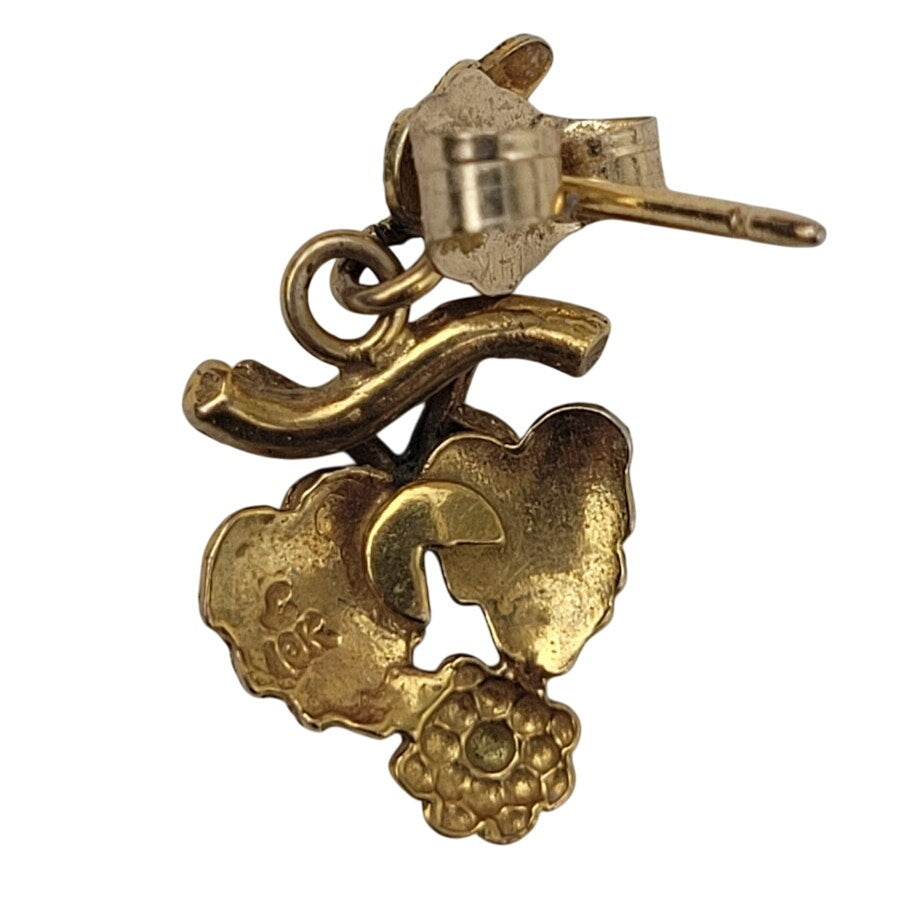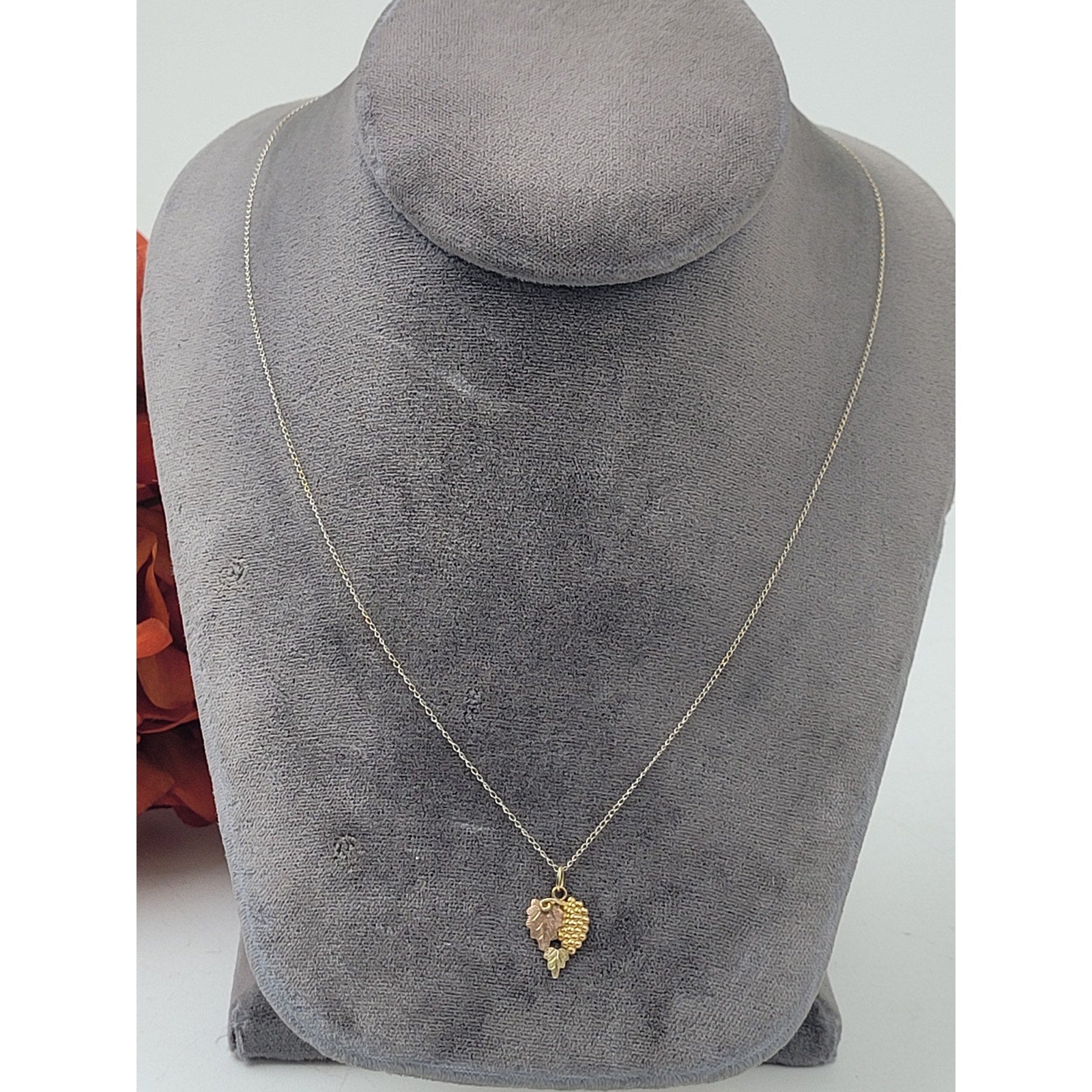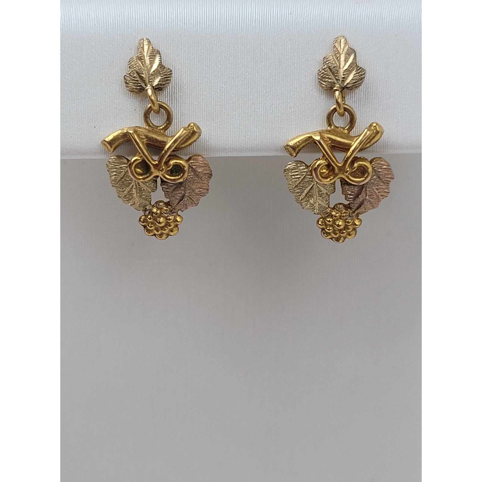 This is a beautiful vintage 10K yellow and rose gold earring and necklace set (the chain reads 14K gold). The set weighs 2.61 grams and features delicate yellow and rose gold leaves forming a charming grape cluster design. The dainty and dangling earrings add a touch of elegance and are perfect for accessorizing your fall outfits. Please note one of the gold earring backs is missing.