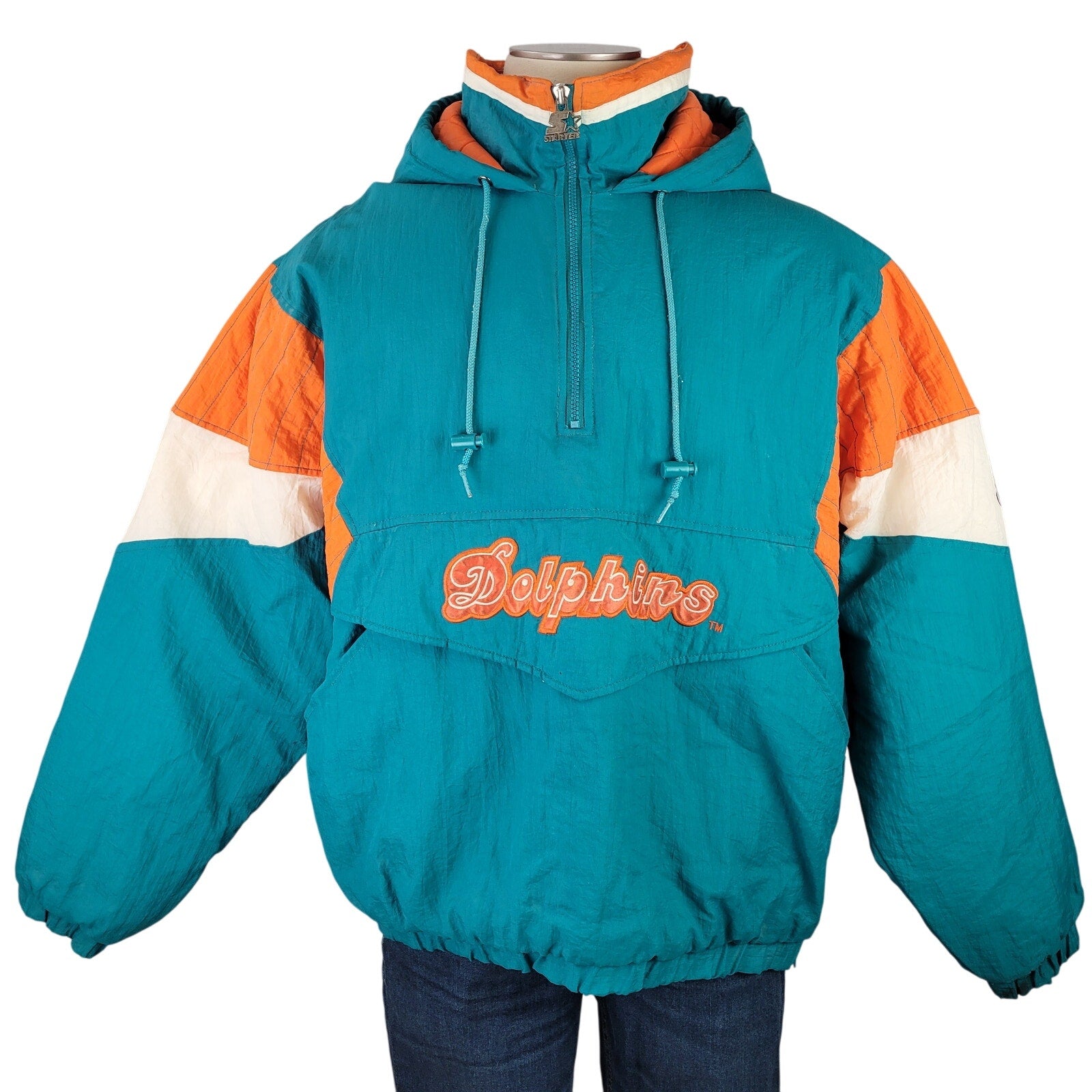 Score a touchdown with this awesome vintage 90s Miami Dolphins half-zip jacket! This Starter brand jacket is a must-have for any Dolphins fan looking to rep their team in style.