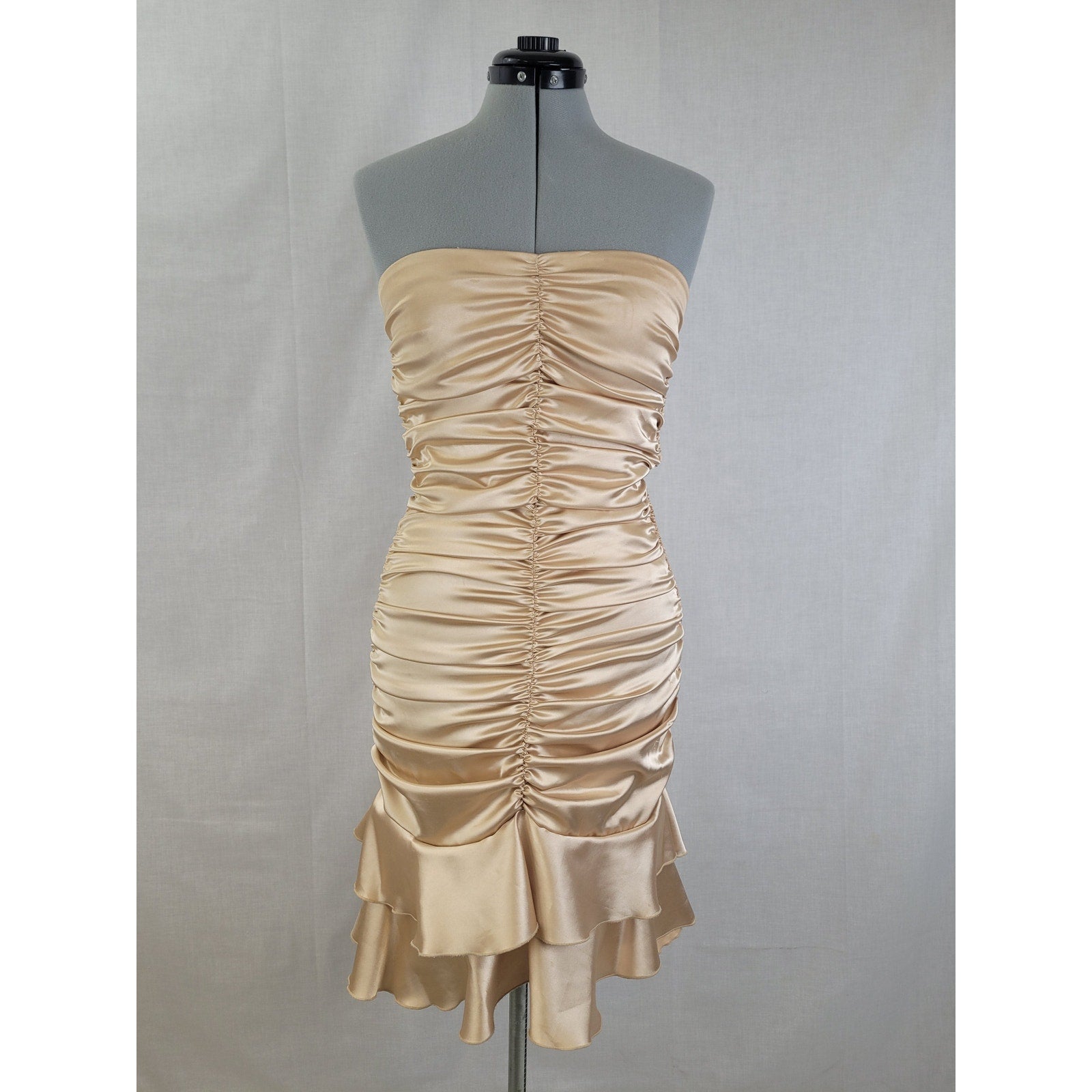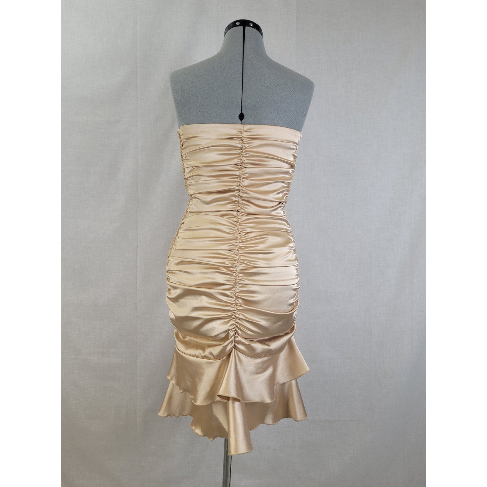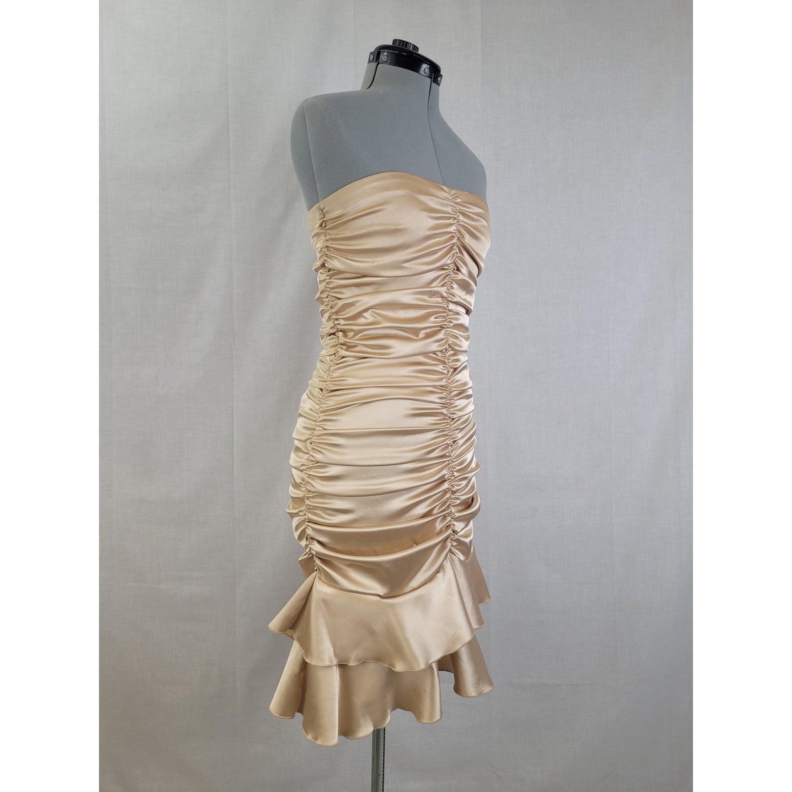 Fun vintage strapless satin mini dress in a champagne-colored stretch satin. The dress has lots of rouching for a forgiving bodycon fit. Shine in this collectible piece by Jessica McClintock.